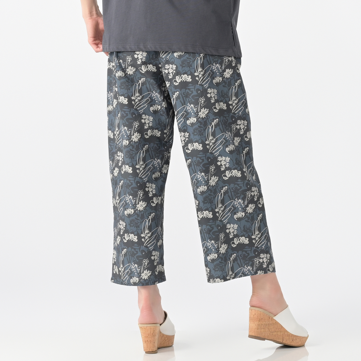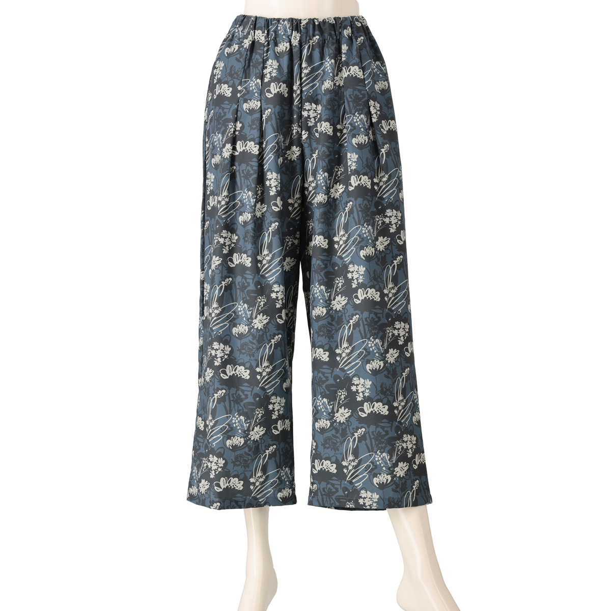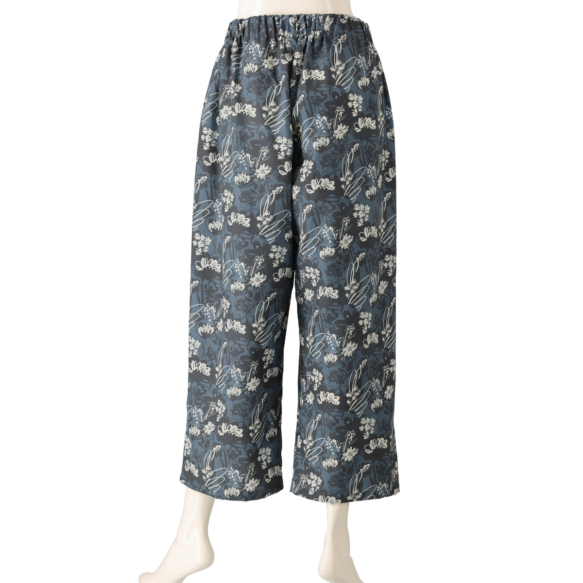 フラワープリントの中に、花の妖精とダヤンがかくれんぼする柄をあしらったラクラクパンツ。甘さを抑えた配色で、シックな雰囲気にまとめています