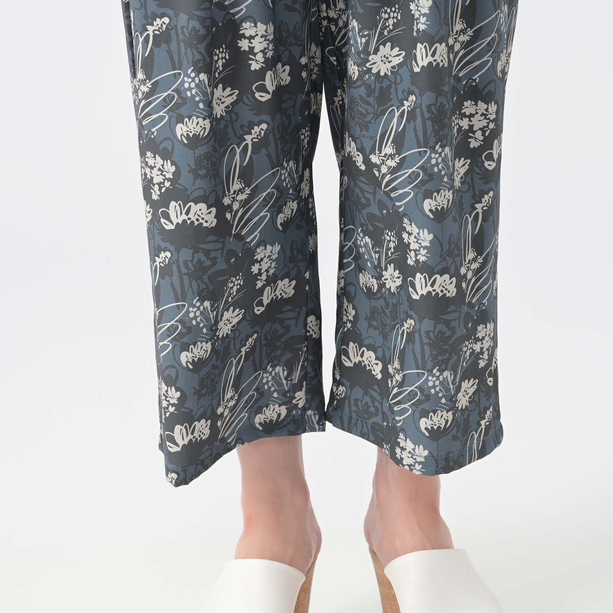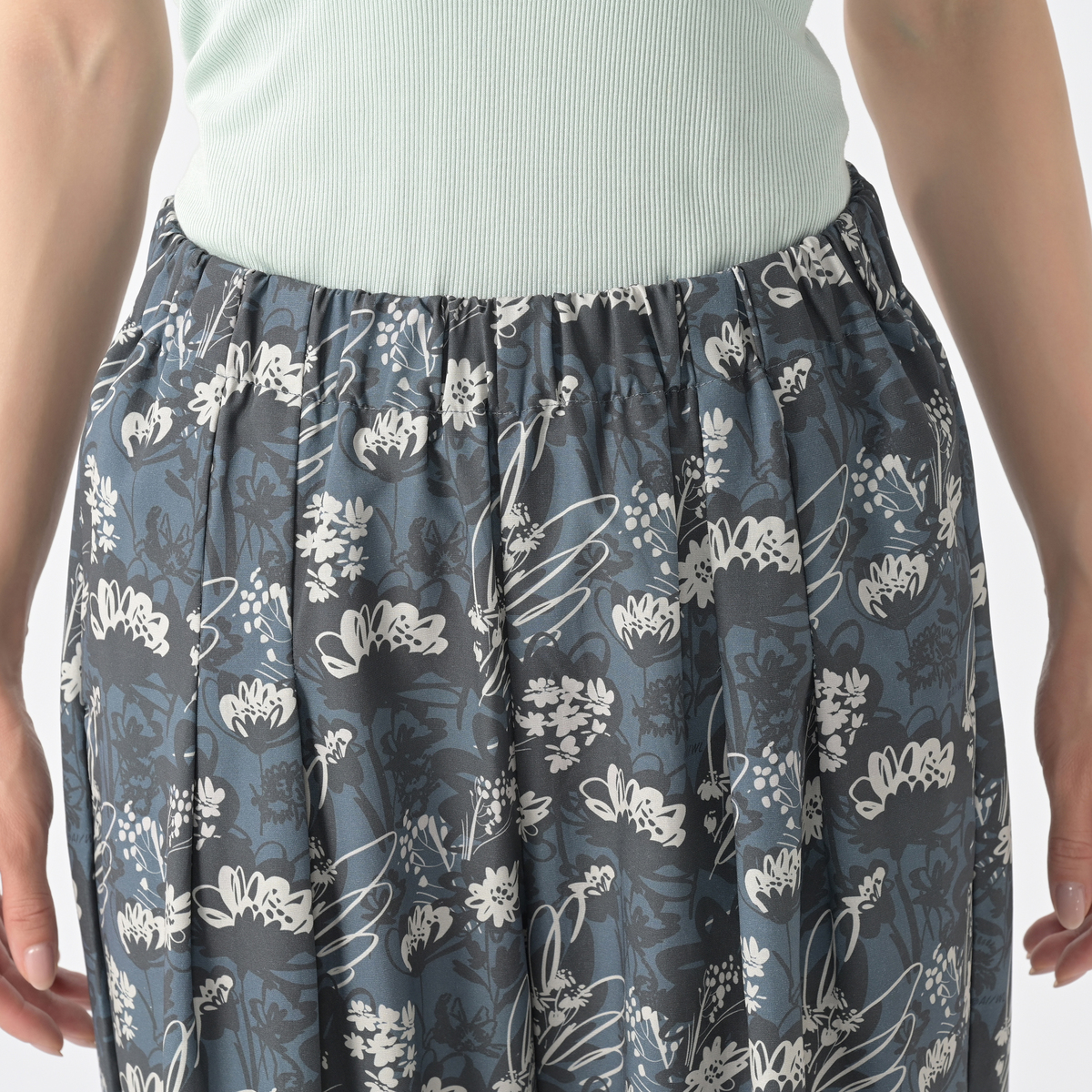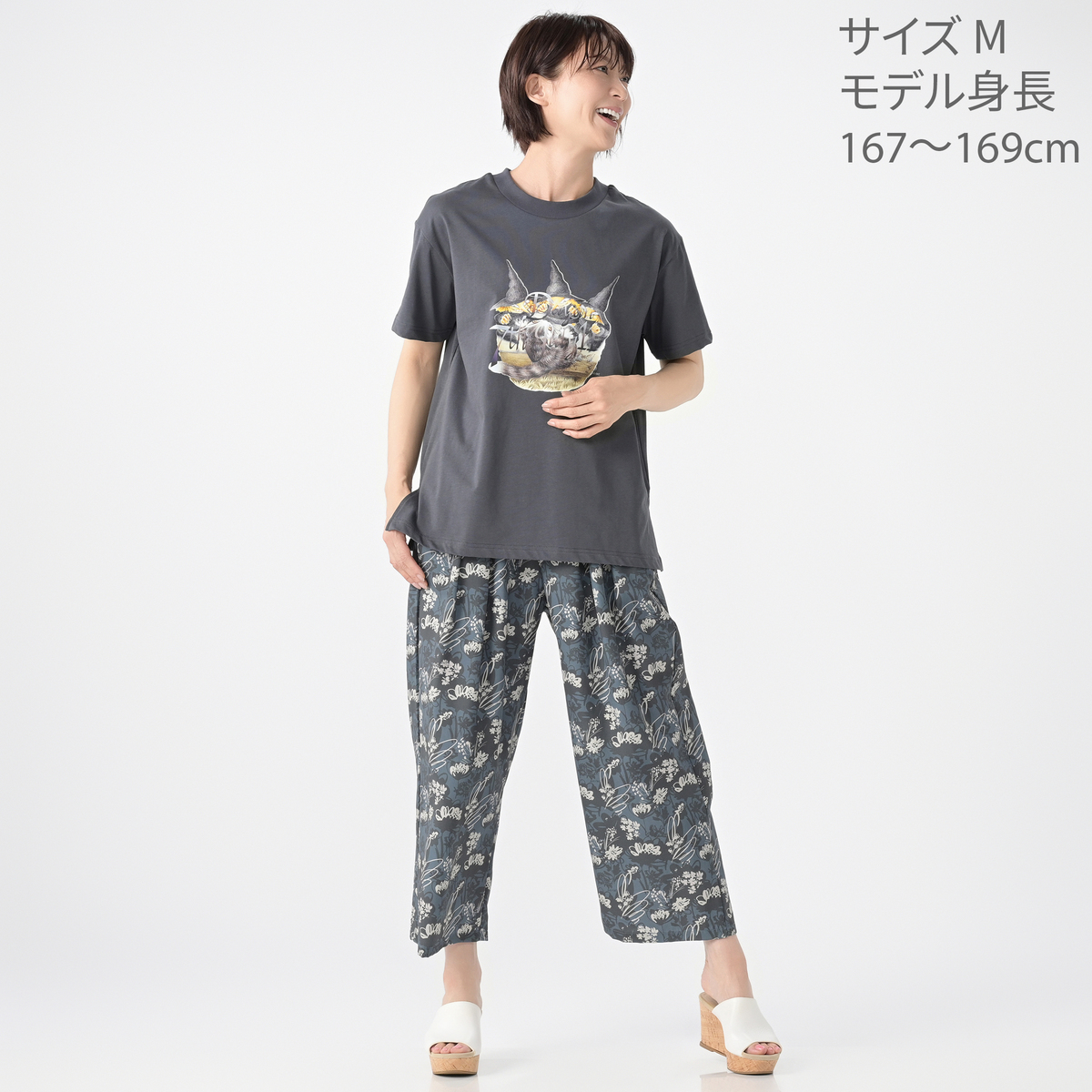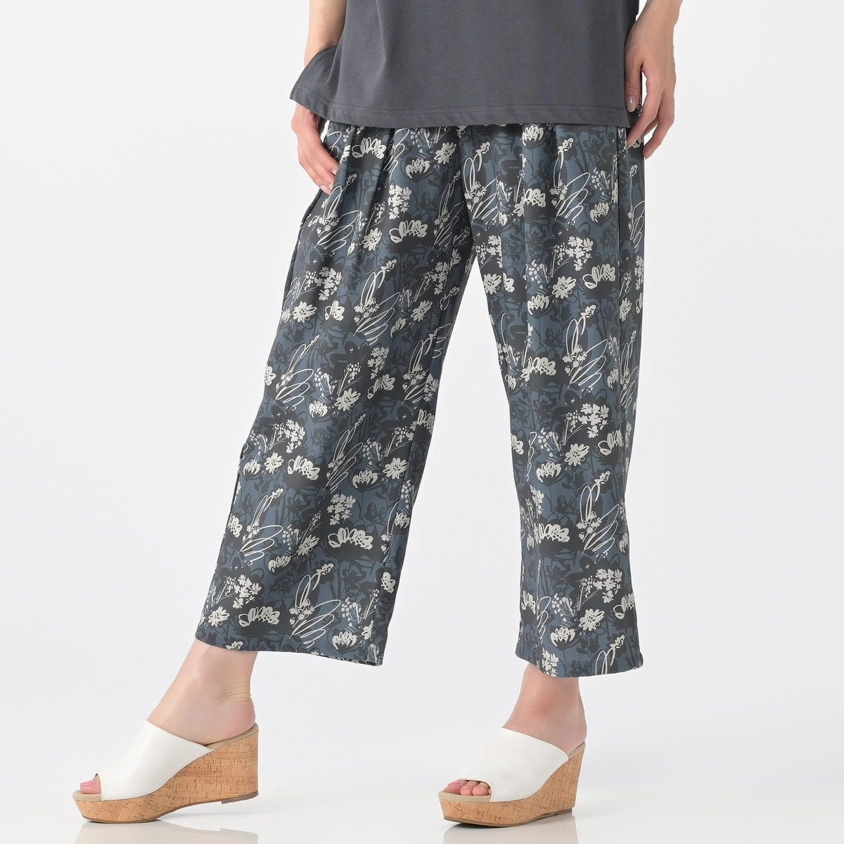 フラワープリントの中に、花の妖精とダヤンがかくれんぼする柄をあしらったラクラクパンツ。甘さを抑えた配色で、シックな雰囲気にまとめています