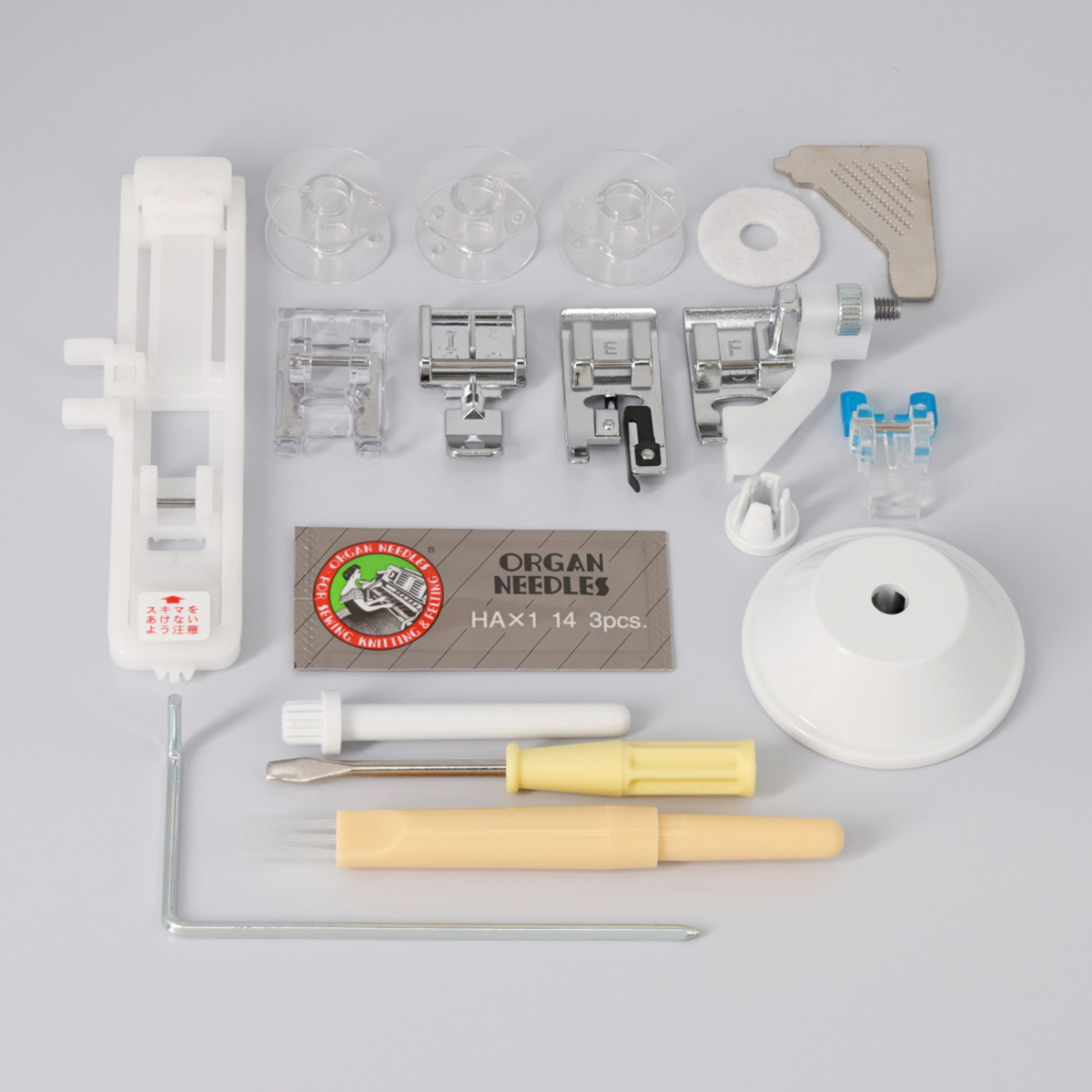 [サイズ] 幅40.4×奥行18.8×高さ29.8cm [重量] 約5800g [コード長さ] 約2m [消費電力] 70W [使用電球] LEDライト球(5V Max.100mW) [商品内容] ミシン本体×1、ジグザグ押え×1(ミシン本体に取り付けされています)、ファスナー押え×1、ボタンホール押え×1、ボタン付け押え×1、縁かがり押え×1、ブラインドステッチ押え×1、サテン押え×1、ボビン×4(内1ヶは本体にセットされています)、 三角ドライバー×1、ドライバー(小)×1、ブラシ付きリッパー×1、針パック×1、シームガイド×1、糸コマ押え(大)×1、糸コマ押え(小)×1、補助糸立棒×1、糸コマ座×1、使用説明DVD×1、使用の手びき(取扱説明書)×1、保証書×1、電源コード×1、フットコントローラー×1、ワイドテーブル×1、ハードケース×1 【本体:中国製 または ベトナム製、フットコントローラー:台湾製】 [注意事項] ※このミシンは、日本国内向け家庭用です。 ※一般家庭用交流電流100Vでご使用ください。 ※以下のようなときは、電源スイッチを切り、電源プラグをコンセントから抜いてください ・ミシンのそばを離れるとき ・ミシンを使用したあと ・ミシン使用中に停電したとき ・接触不良、断線などで正常に作動しないとき ・雷が鳴り始めたとき ※お客様自身での分解、改良はしないでください ※ミシン操作中は、針から目を離さないようにし、針、はずみ車、天びんなどすべての動いている部分に手を近づけないでください ※ミシン操作中は、カマカバーなどのカバー類は必ず閉じてください ※曲がった針、先の傷んだ針はご使用にならいでください ※縫製中に布を無理に引っ張ったり、押したりしないでください ※お子様がご使用になるときや、お子様の近くで使用されるときは、特に安全に注意してください。 ※以下のことをするときは、電源スイッチをお切りください ・針、針板、押え、アタッチメントを交換するとき ・「使用の手引き」に記載のあるミシンの手入れをするとき ・原則として上糸・下糸をセットするとき ※ミシンに以下の異常があるときは、速やかに使用を停止し、ご購入店にて点検、修理、調整をお受けください ・正常に作動しないとき ・落下などにより破損したとき ・水に濡れたとき ・電源コード、プラグ類が破損、劣化したとき ・異常な臭い、音がするとき ※ミシンを正しく使用するために、安定したテーブルや机に置いてご使用ください