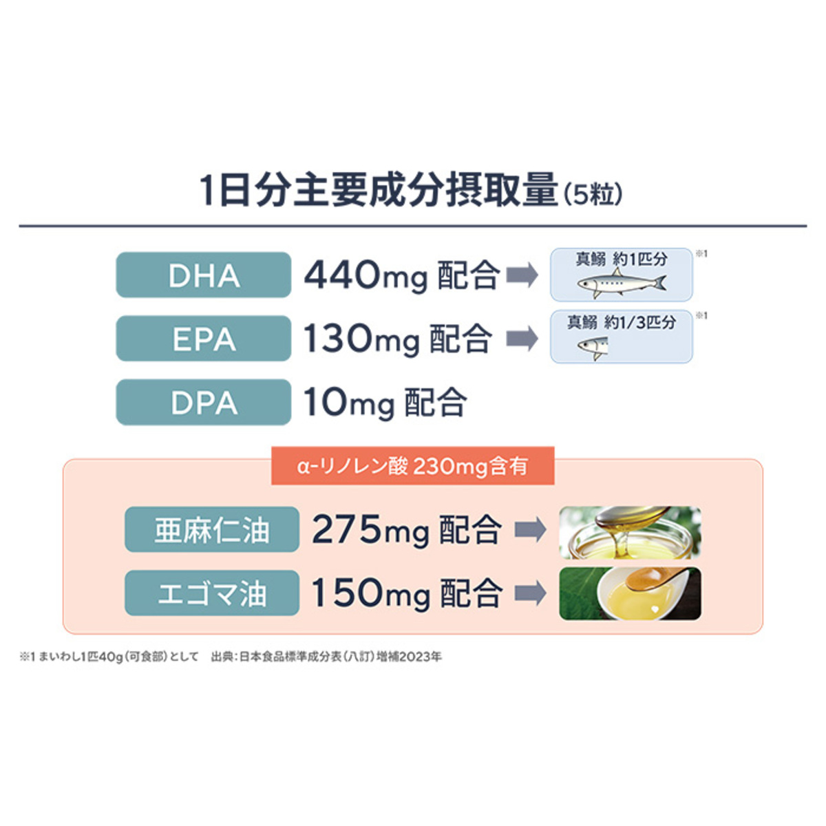 オメガ3系のα-リノレン酸を含む亜麻仁油を275mg、エゴマオイルを150mg配合(*1)。α-リノレン酸として約230mg、オメガ3系脂肪酸であるDPAも10mg含有しています(*1)