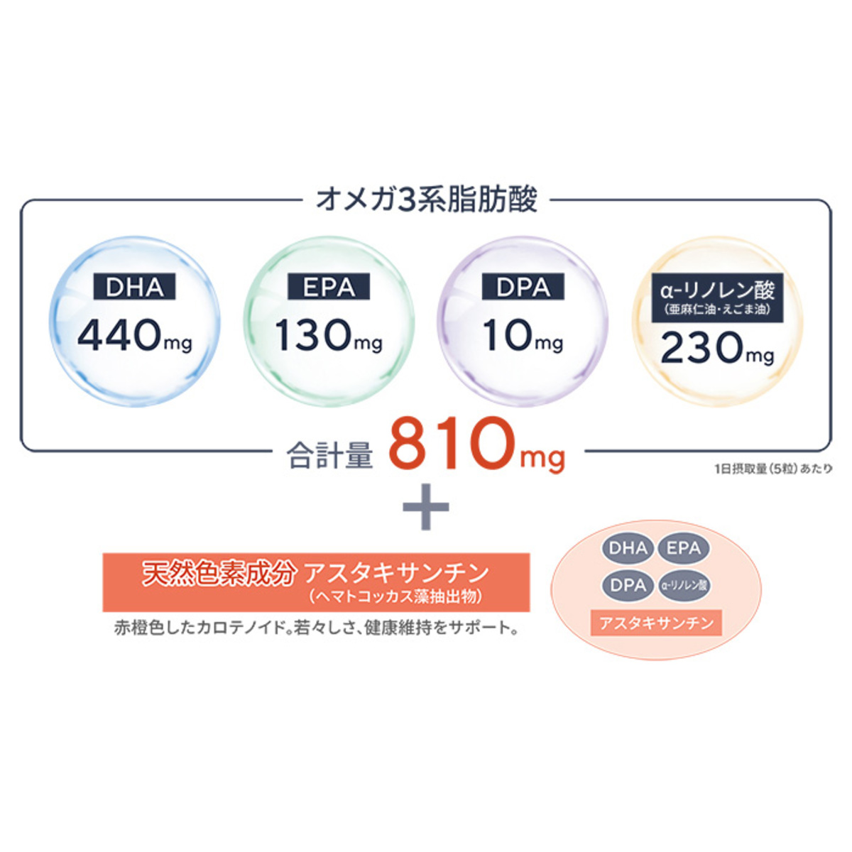 [アレルギー物質特定原材料8品目] なし [目安量] 1日5粒 [お召し上がり方] 健康補助の食品として1日に5粒を目安に水またはお湯と共にお召し上がり下さい [栄養成分表示]5粒(2425mgあたり) エネルギー:17.58kcal たんぱく質:0.62g 脂質:1.62g 炭水化物:0.12g 食塩相当量:0.0033g DHA:440mg EPA:130mg DPA:10mg α-リノレン酸:230mg アスタキサンチン:1mg [保存方法] 高温多湿と直射日光を避けて保存してください [注意事項] ※体質に合わない場合は摂取を中止し、医師にご相談下さい ※乳幼児の手の届かないところに保管してください ※食生活は、主食、主菜、副菜を基本に、食事のバランスを [原料原産地] DHA含有精製魚油(国内製造) [原産国] 日本 [原材料] DHA含有精製魚油(国内製造)、EPA含有精製魚油、亜麻仁油、DPA含有精製魚油、えごま油、ヘマトコッカス藻抽出物/ ゼラチン、グリセリン、酸化防止剤(ビタミンE)