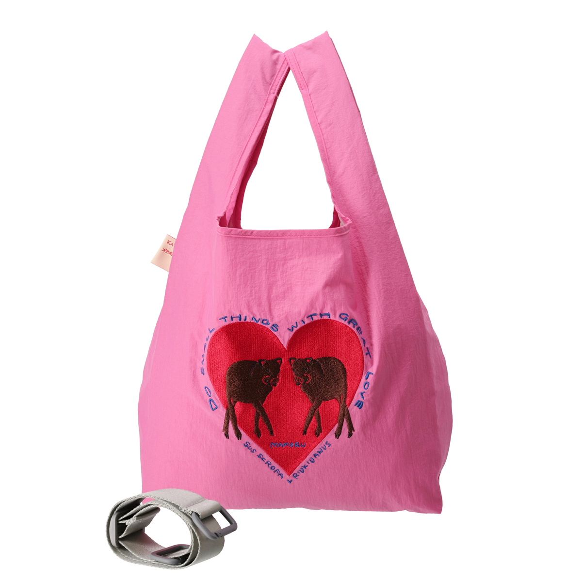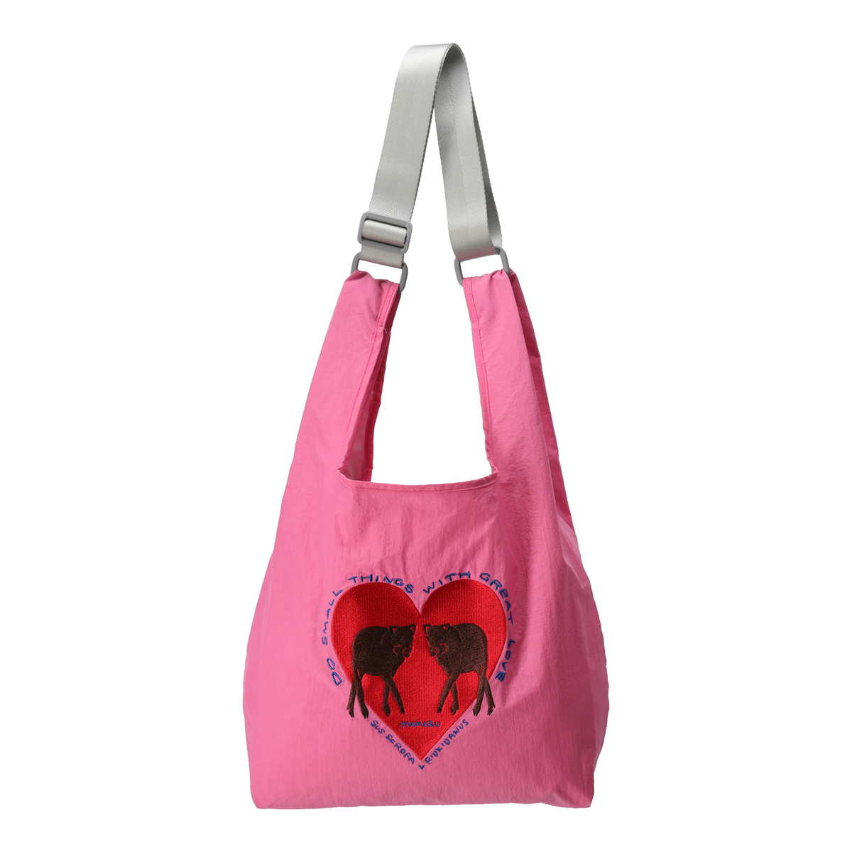 たっぷりサイズの刺繍で、リュウキュウイノシシの可愛らしさを表現したデザイン。今絶滅の危機に瀕している日本の生きものたちを、特長あるタッチで描いています