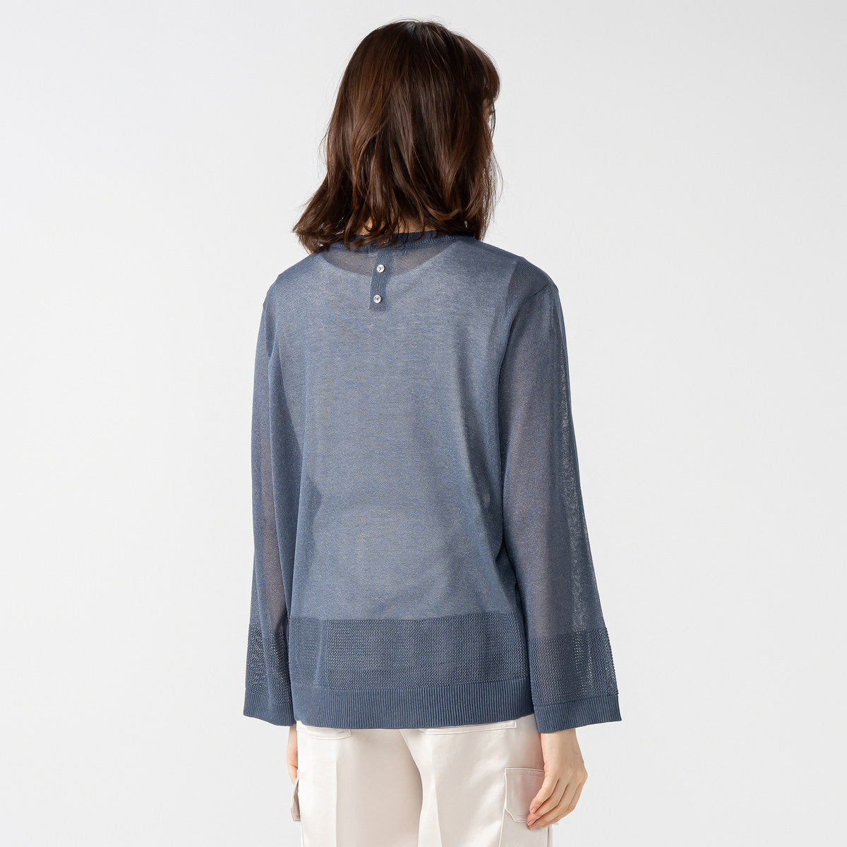 ブルーを購入。ラメは控えめで良い色です。お作りもデザインも良く出来ていますが、繊細なニットなので取り扱いは丁寧にした方が良いかも。今は真夏なので着用が出来ませんが、秋のお出かけに着るのが楽しみ。