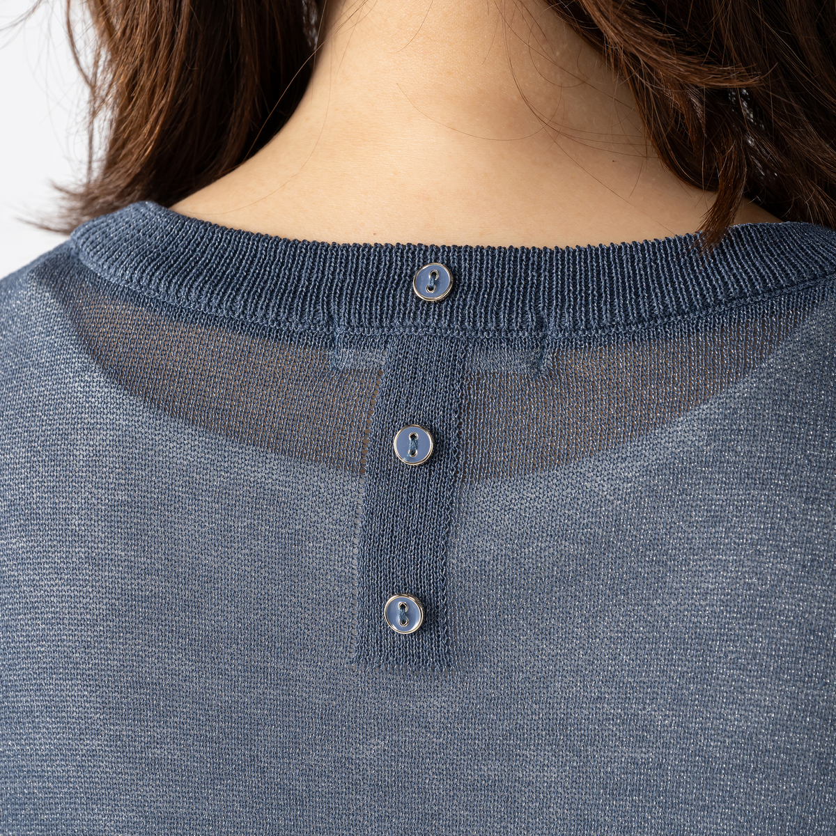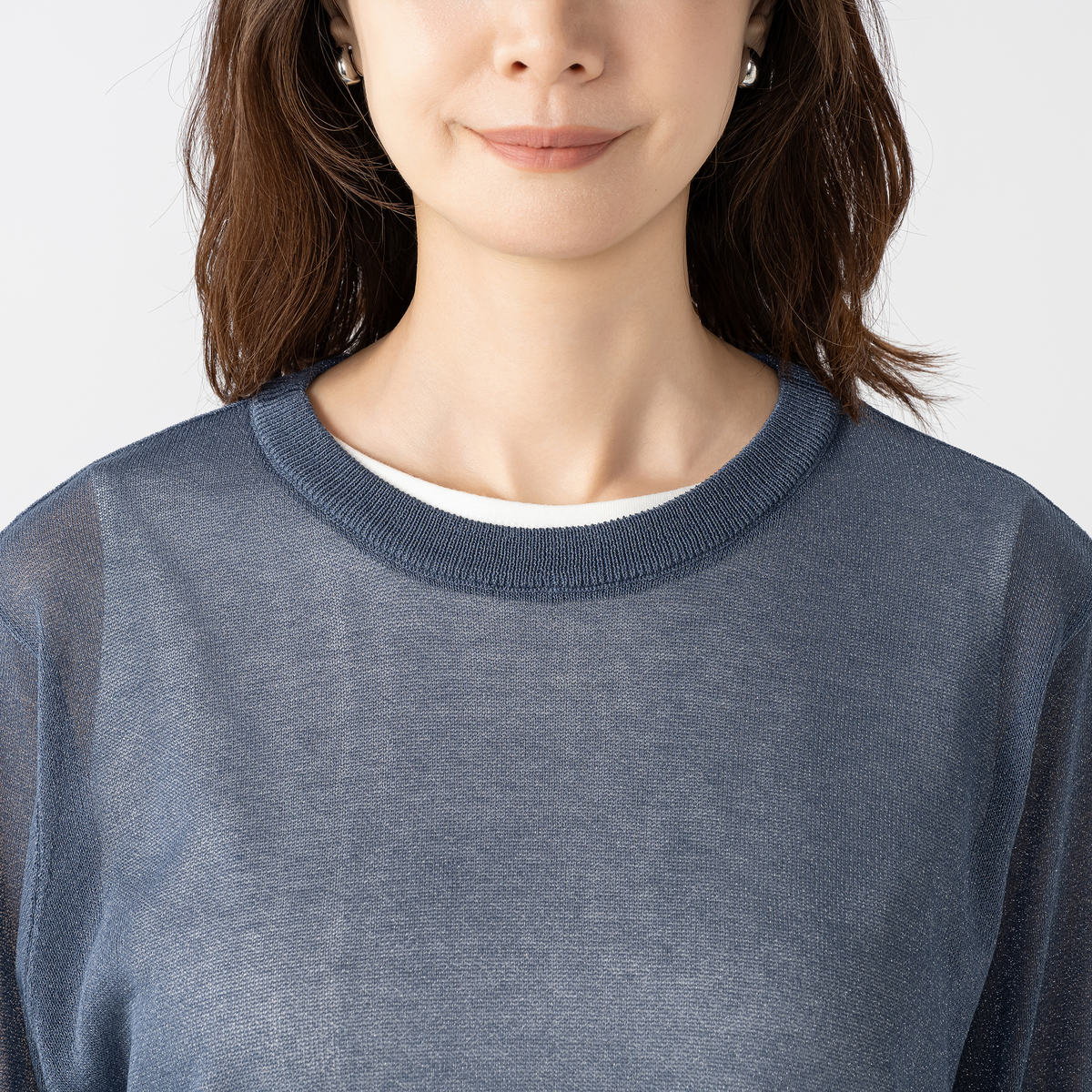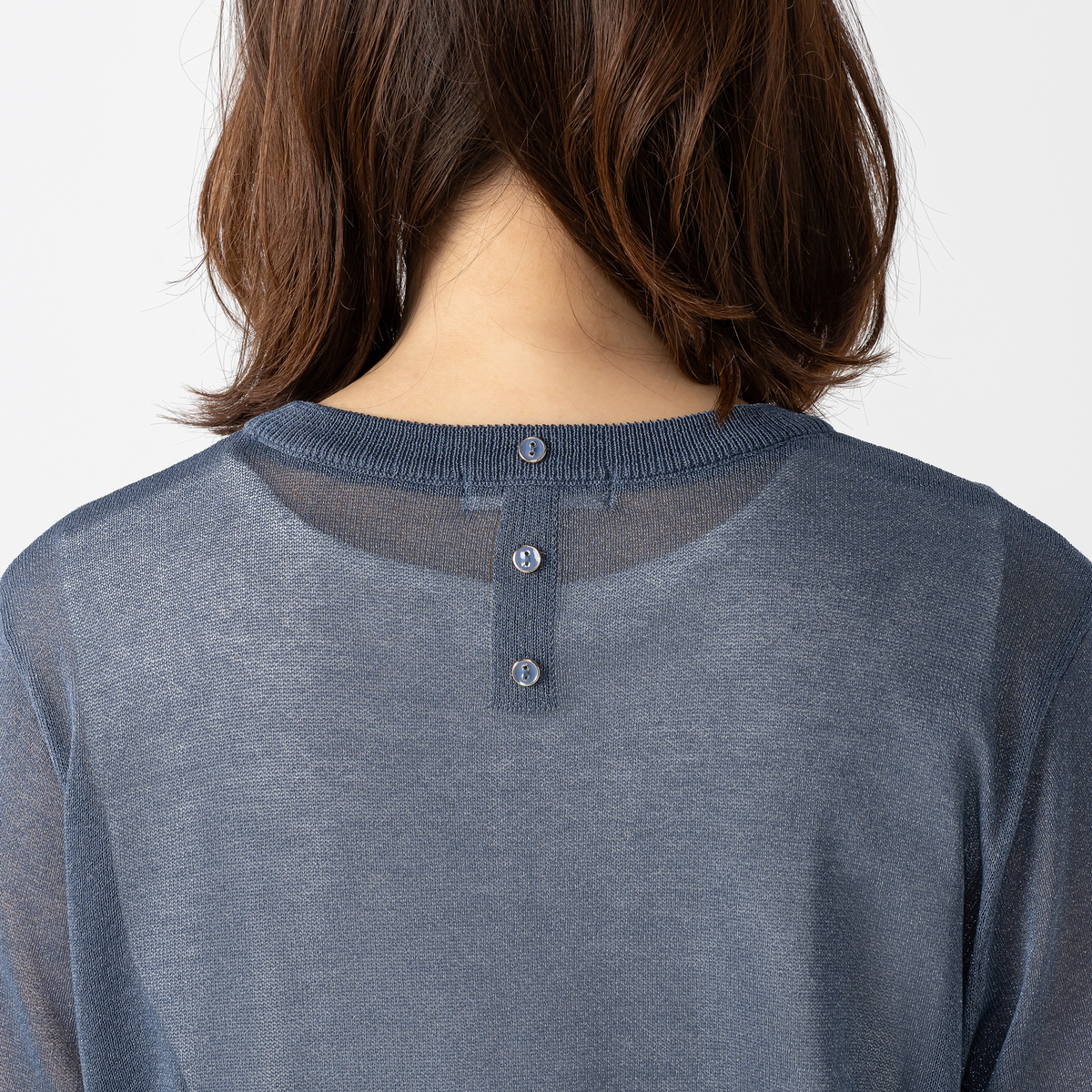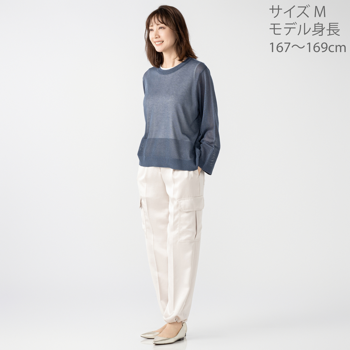 シアーニットにカットソーインナーを組合せた、異素材アンサンブル。程よい光沢感があるサラッとした素材で編み立てたシアーニットで、使い回しの効くベーシックなデザインです。程よい抜け感と軽やかな素材感がフェミニンな雰囲気を演出します