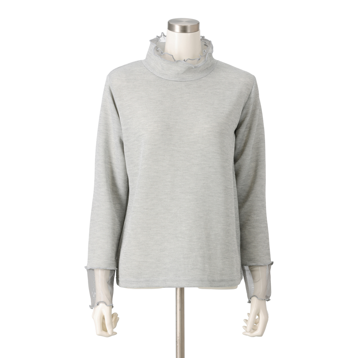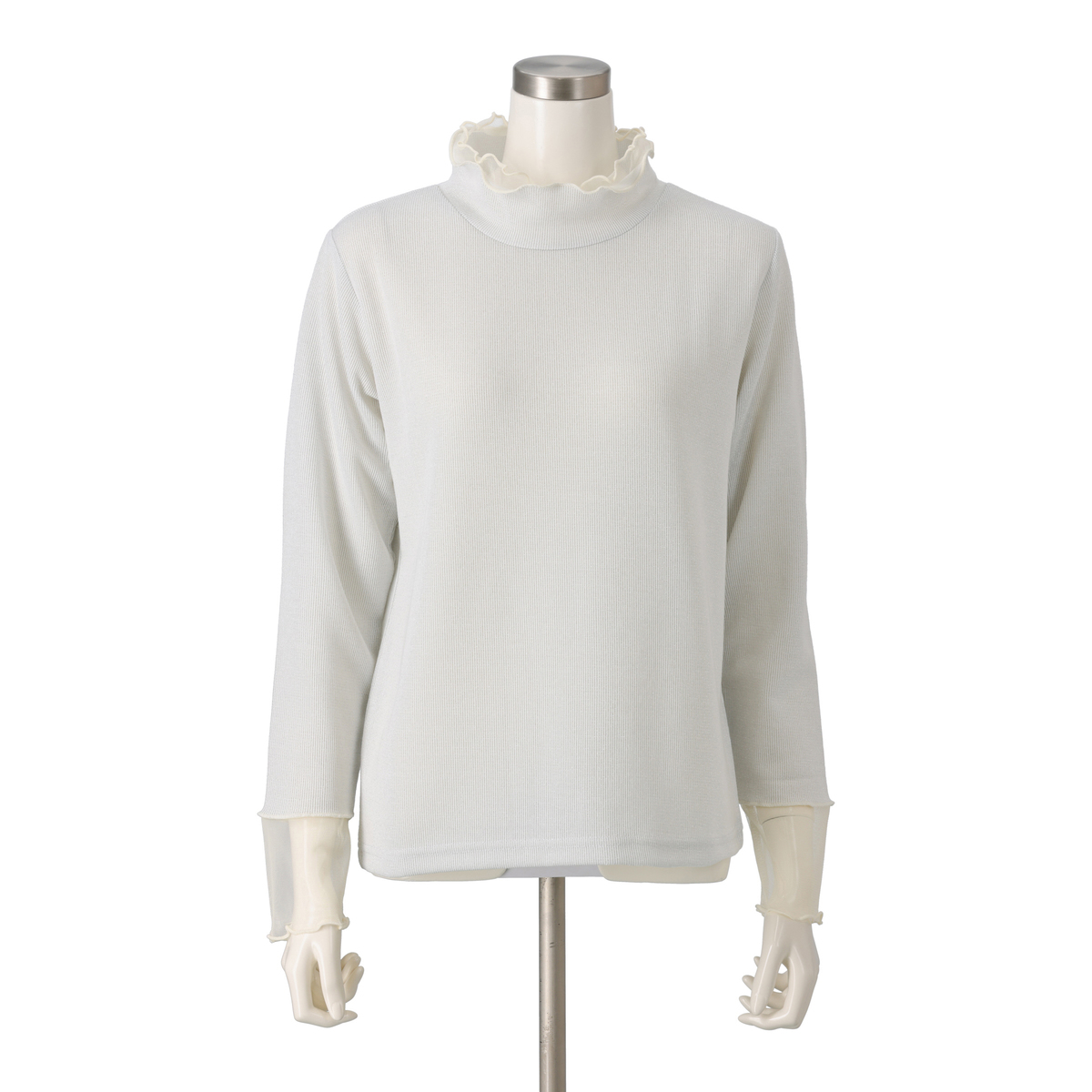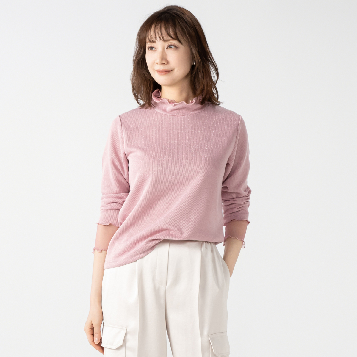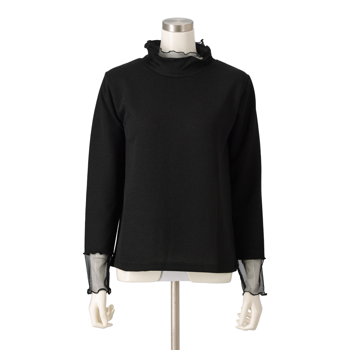 タイト過ぎず程よいゆとりで、インナーとしても一枚でも着栄えするアイテム。衿元にチュールが重なっているため、お顔周りに華やかな印象をもたらしてくれます