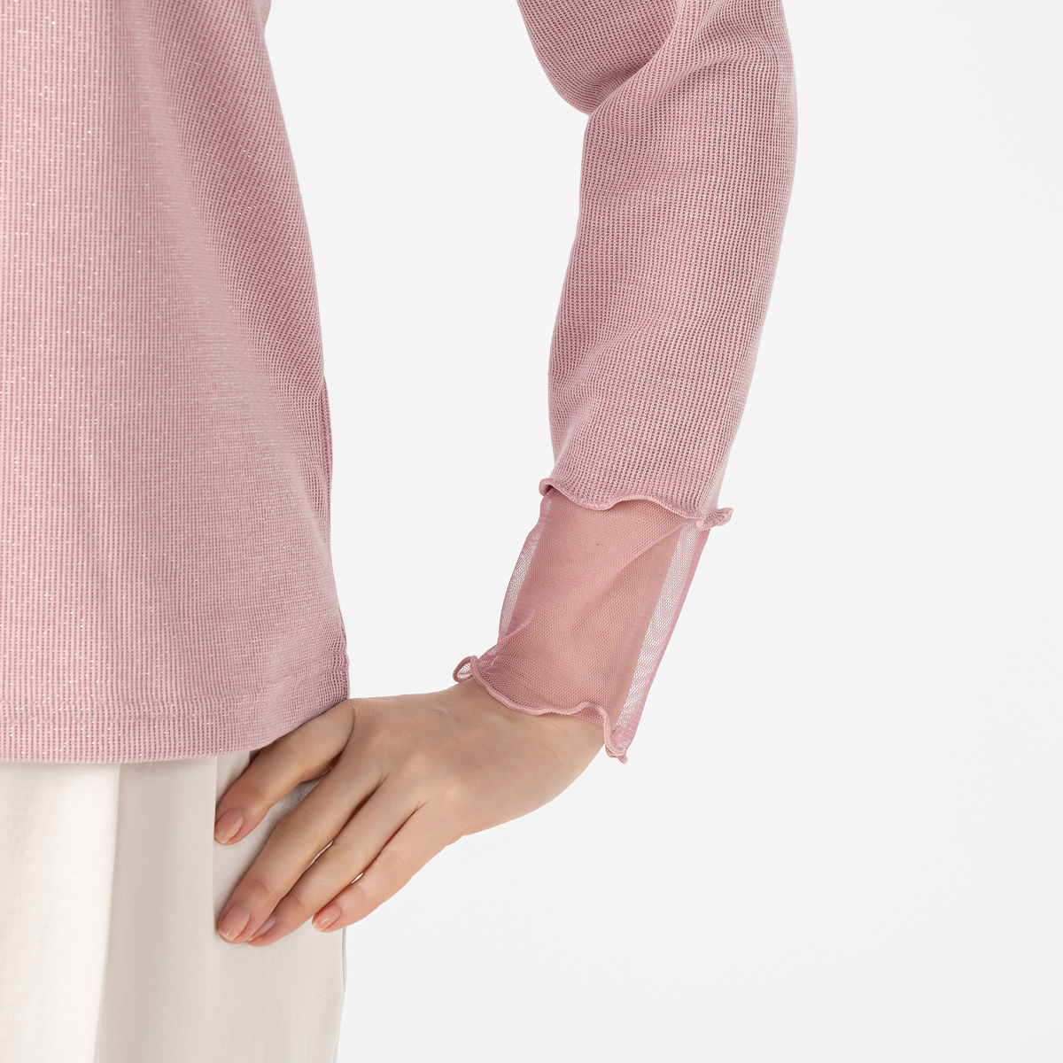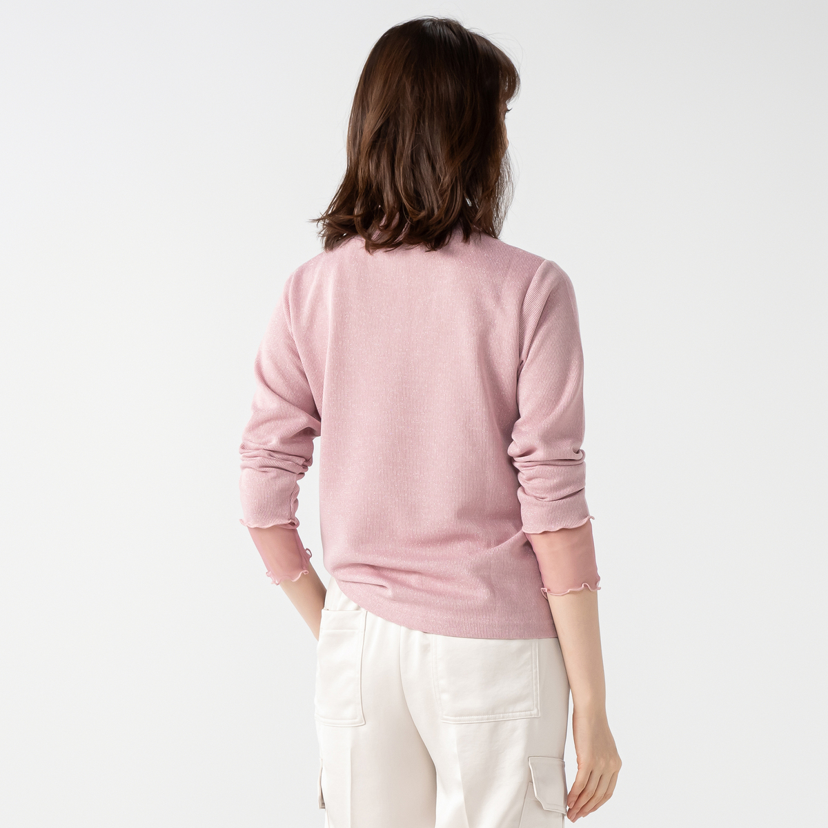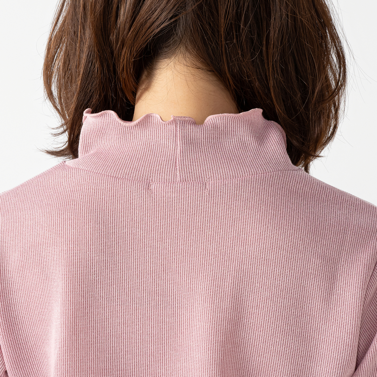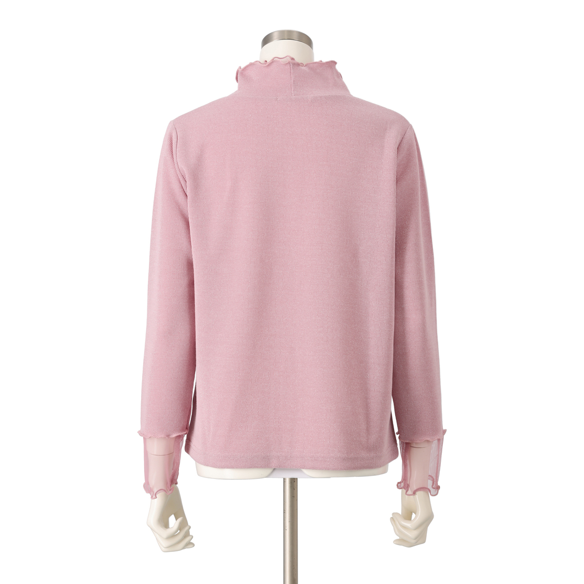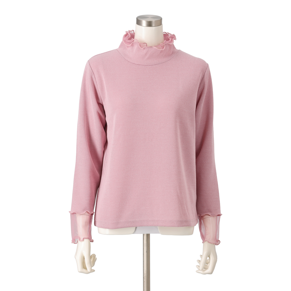 タイト過ぎず程よいゆとりで、インナーとしても一枚でも着栄えするアイテム。衿元にチュールが重なっているため、お顔周りに華やかな印象をもたらしてくれます