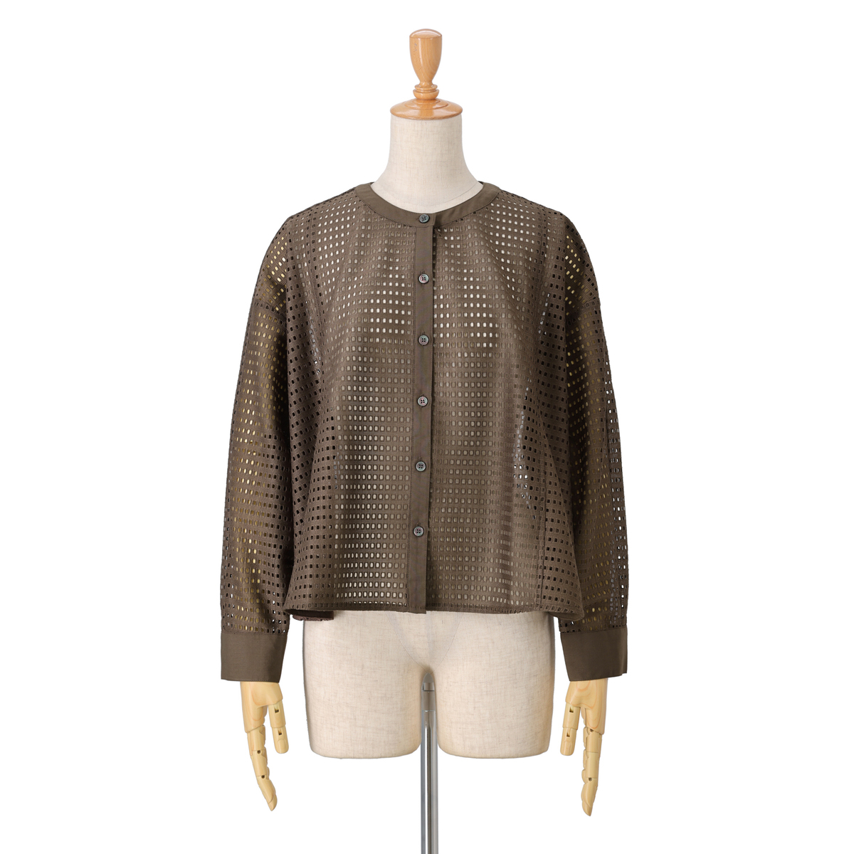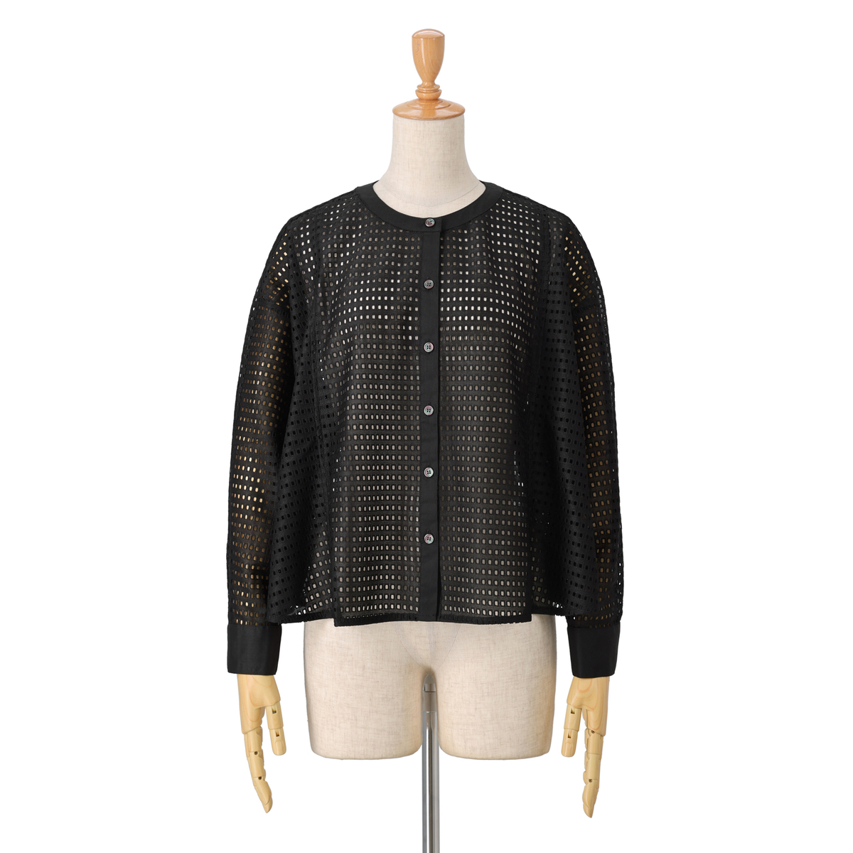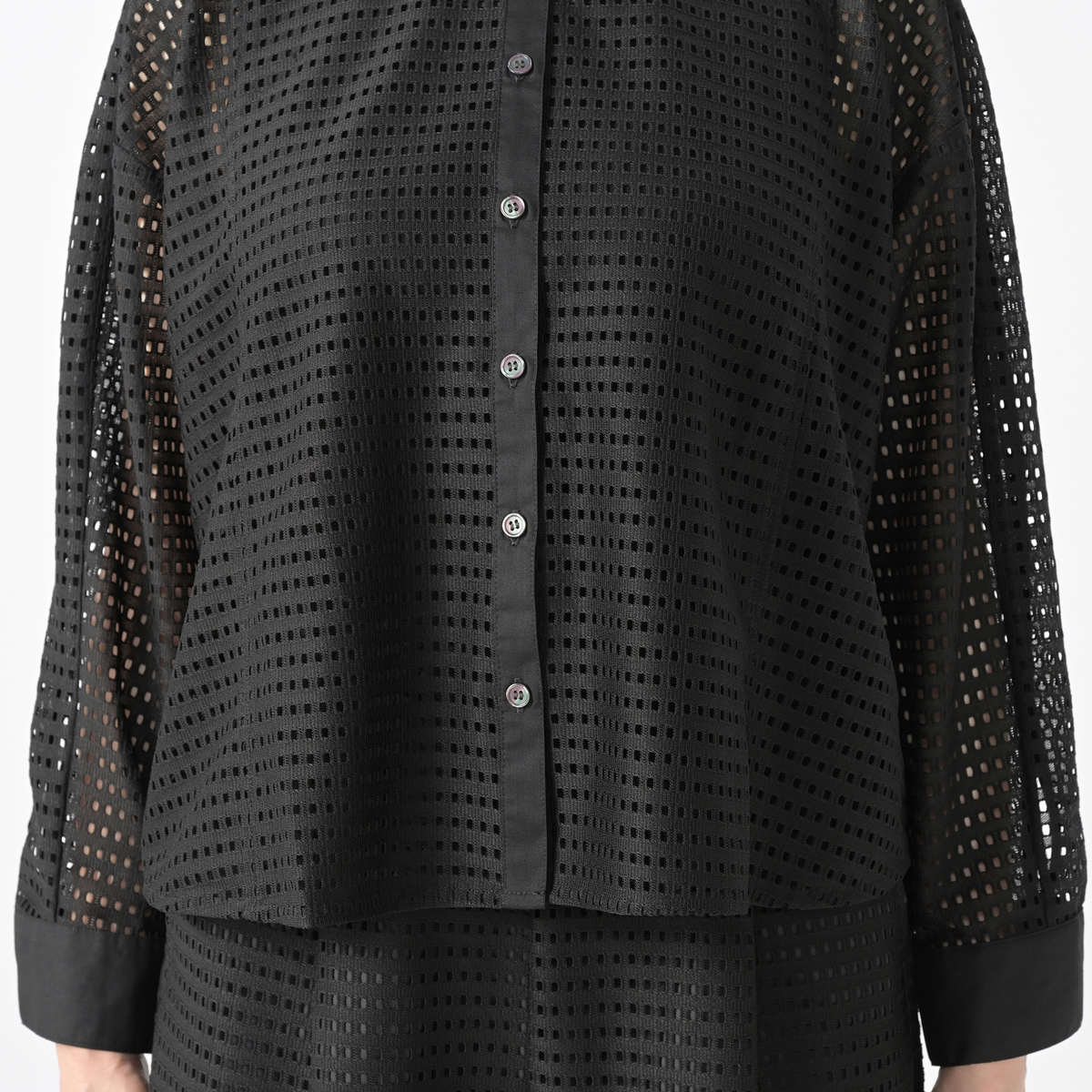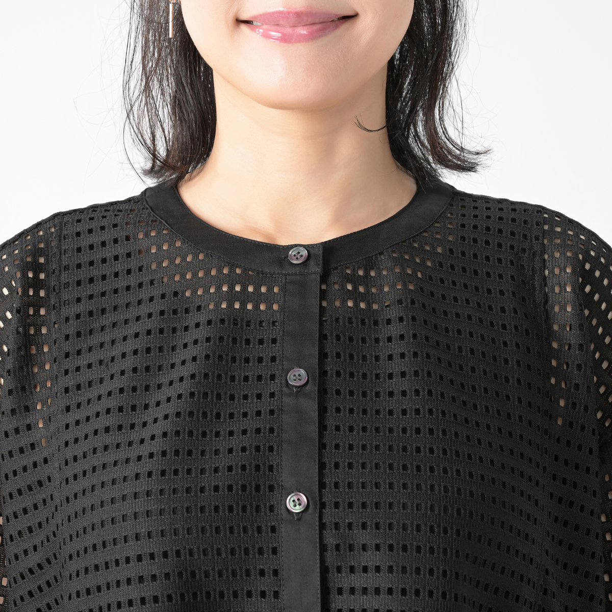 前立て、衿、袖口が異素材切り替えになった、メリハリのきいたデザイン。レースの柄からインナーがチラ見えするので、Tシャツやキャミインナーなどの着用をおすすめします