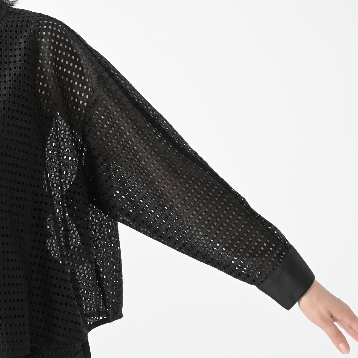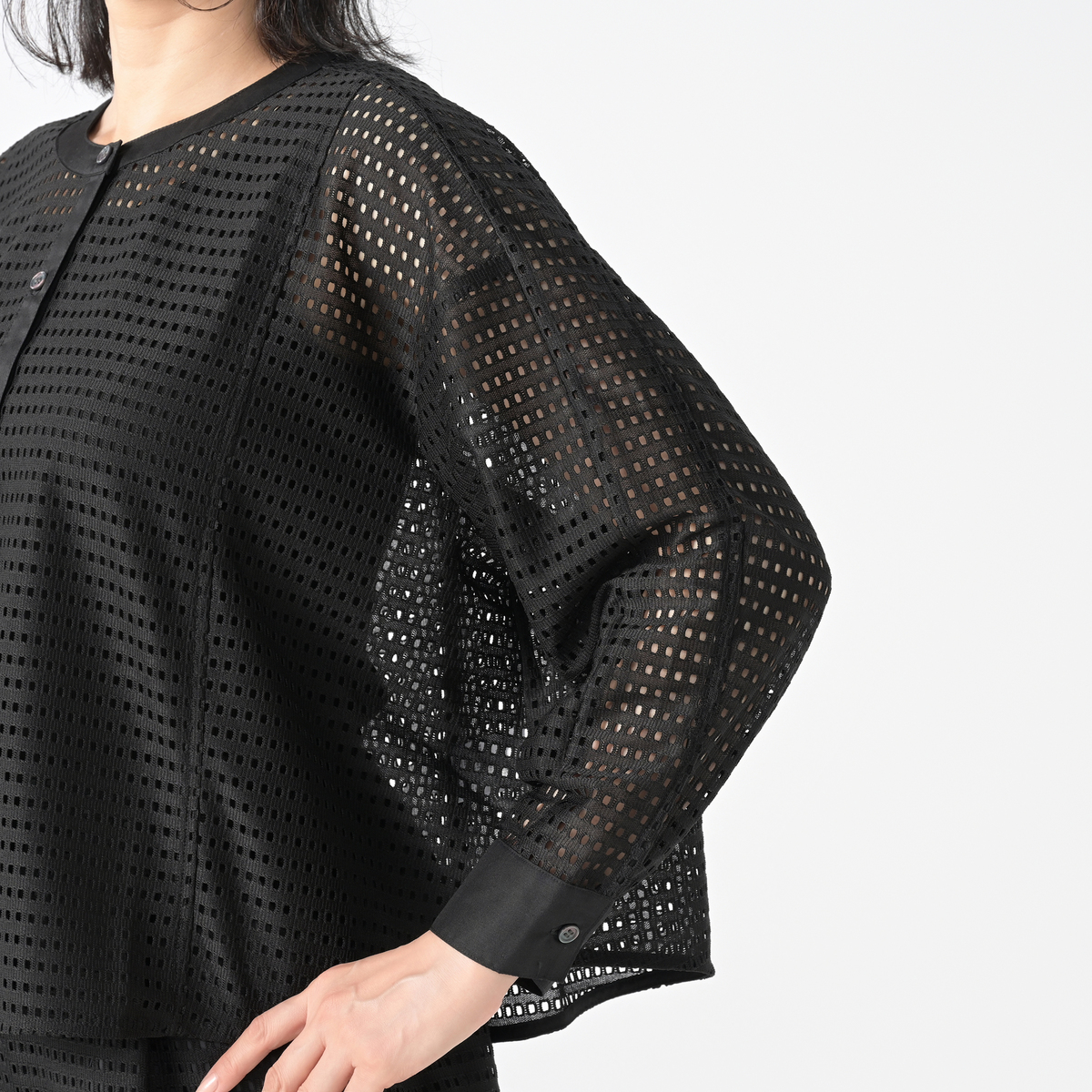 涼しげで軽やかなスクエアレース素材のジャケット。透け感が上品に映え、華やかな装いを演出する、ショート丈のアイテムです