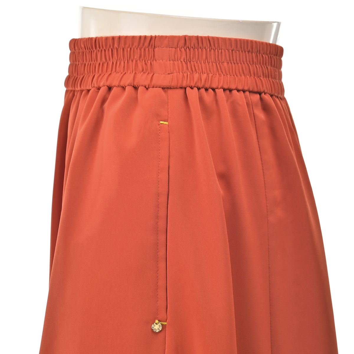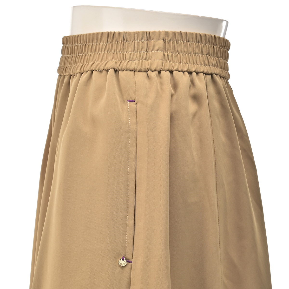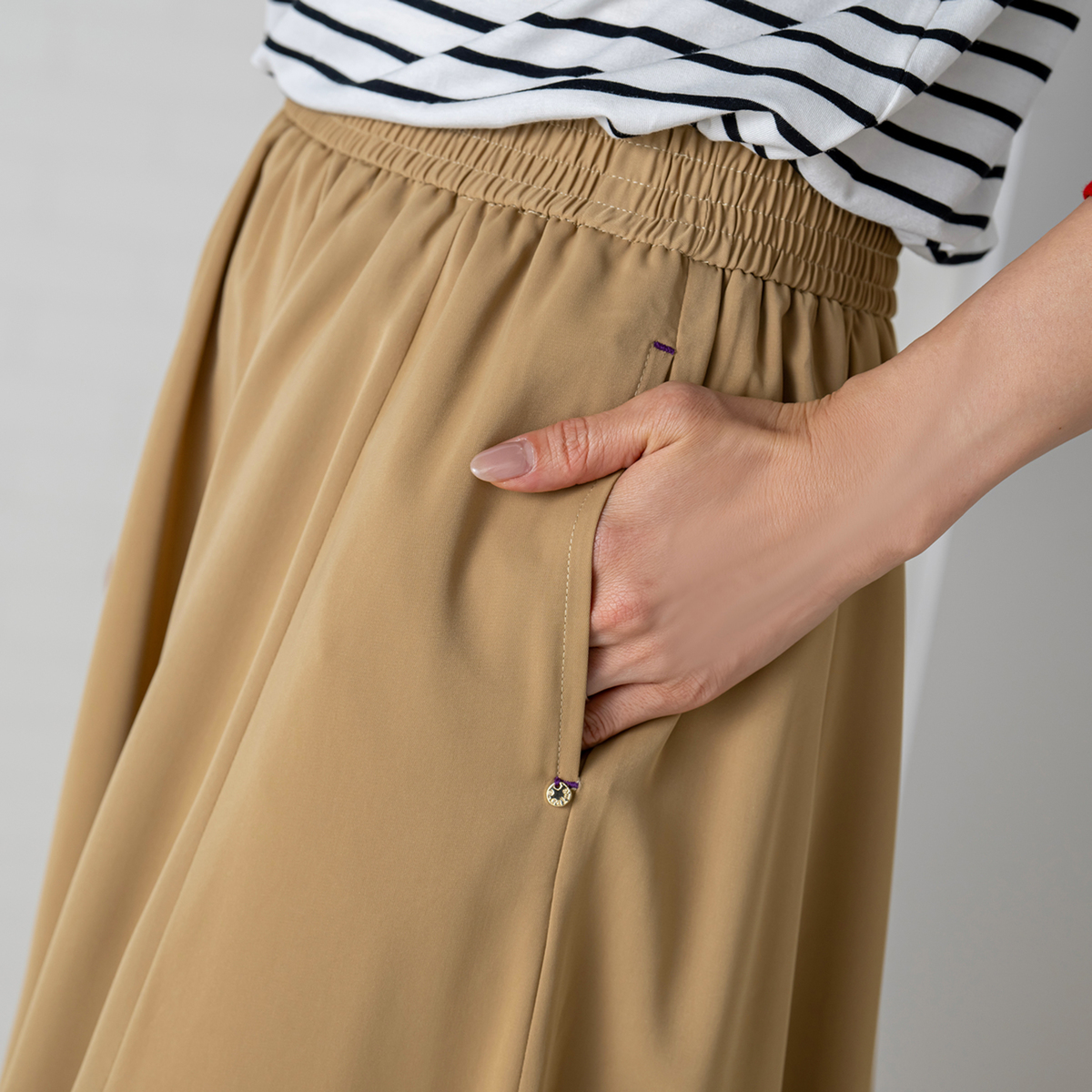ウエストは総ゴム仕様で、ギャザー感を抑えたデザイン。トップスインもすっきり決まり、ウエストゴムなのでお好みの位置で着用可能です。左右にはスラッシュポケットを備え、配色カンヌキや左ポケット口のチャームがさりげないアクセントになります