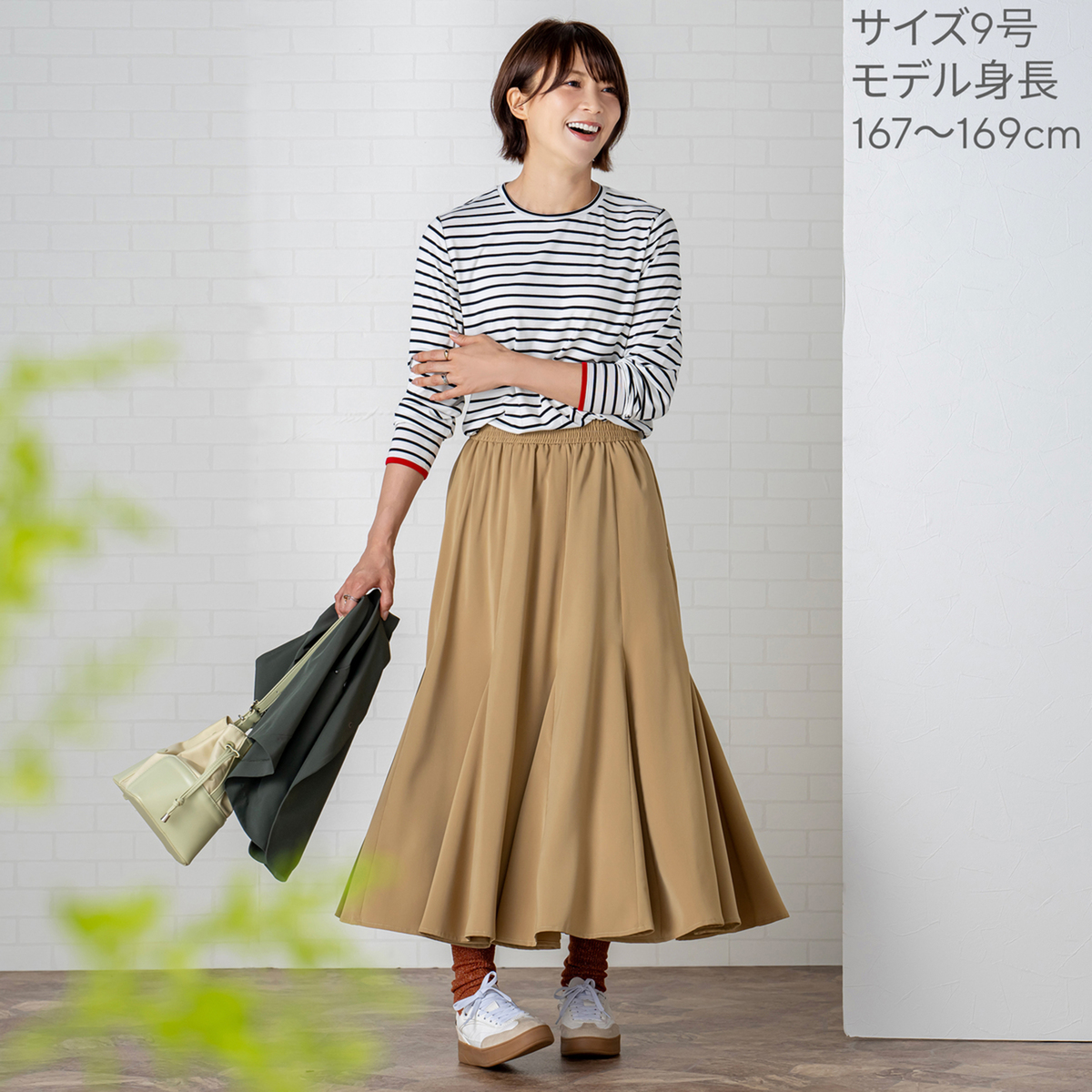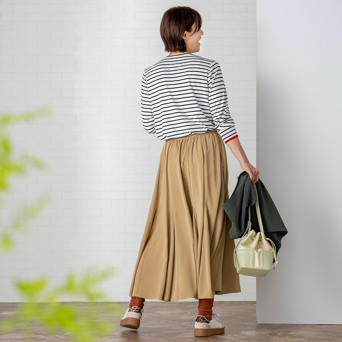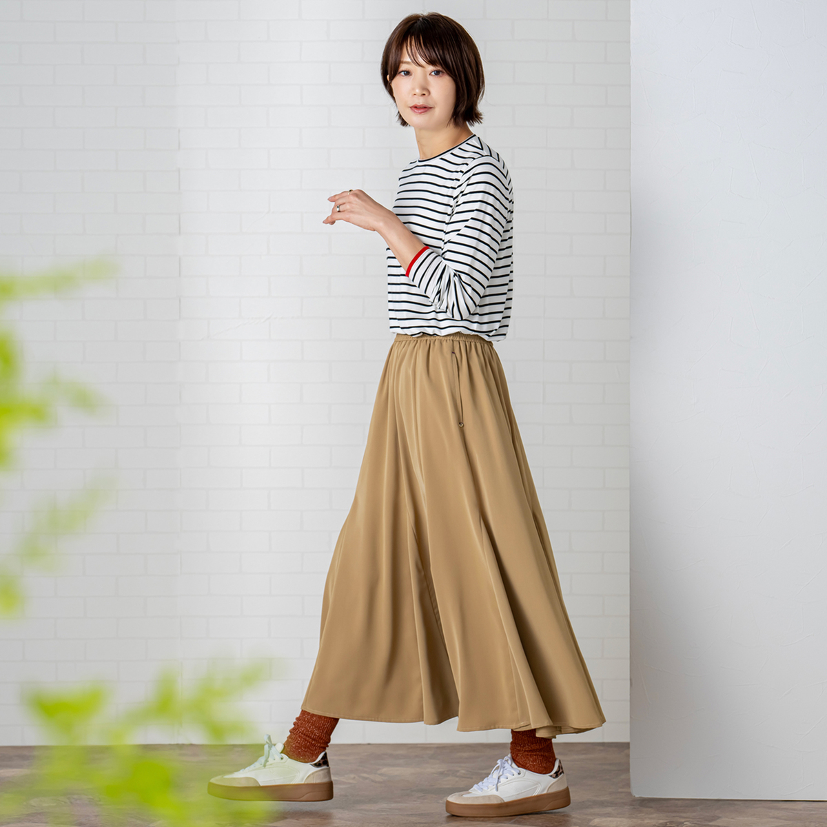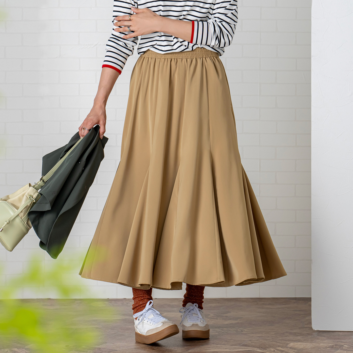 10枚接ぎの切り替えと前後身頃裾に配した三角マチが、裾に向かって広がるフレアラインに。膝上からマチを挟み込むことで揺れ感が生まれ、マーメイドシルエットのような上品さを楽しめます