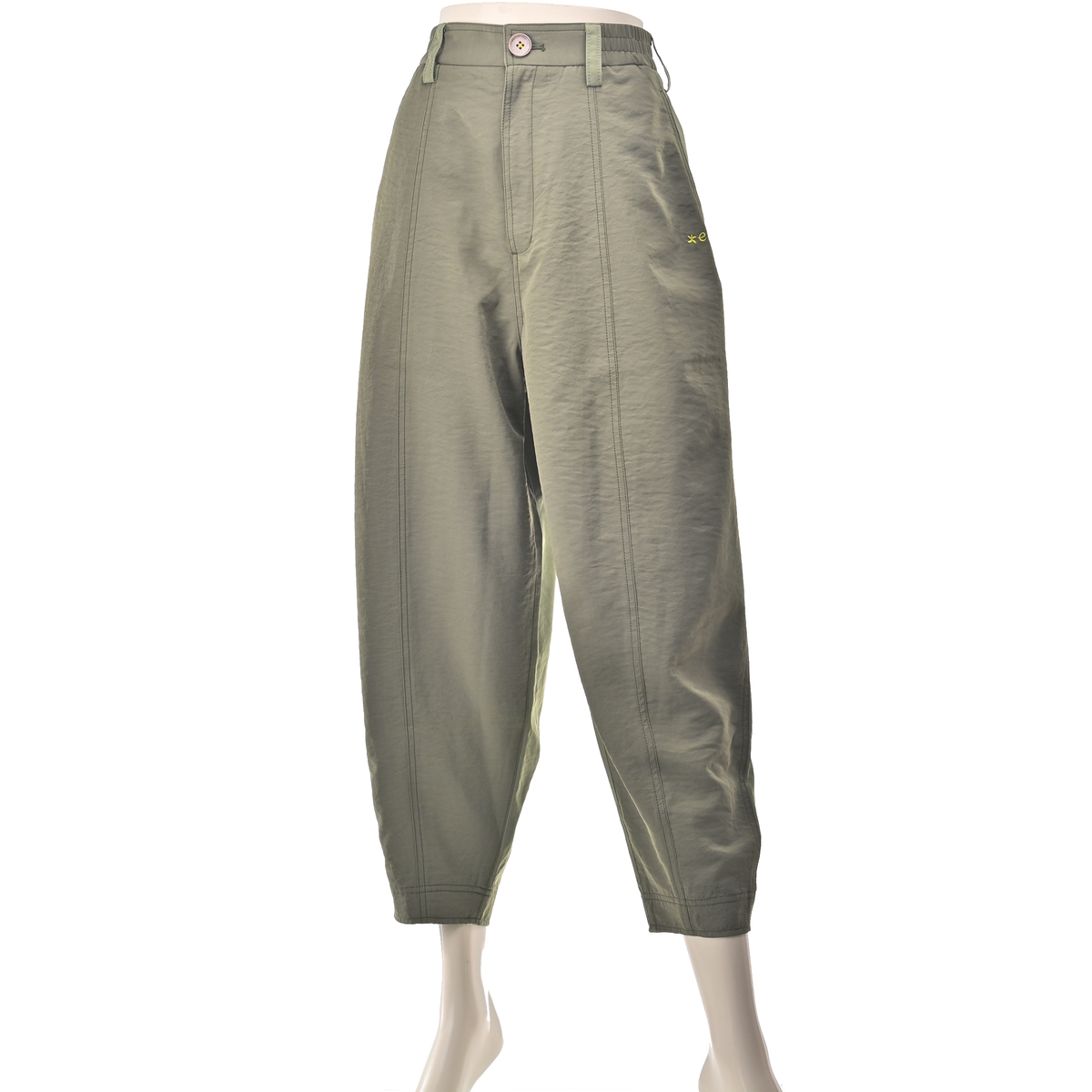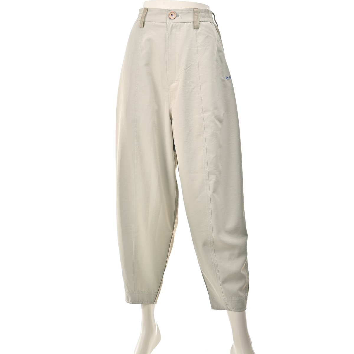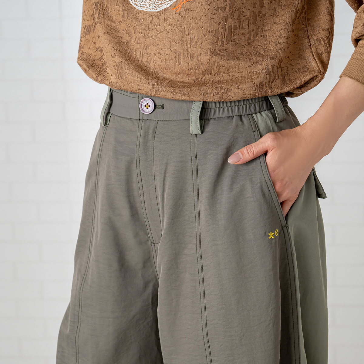 前後のセンターに切替を施すことで、膝部分が膨らみ、裾が絞られたバルーンシルエットに仕上げました。ウエストは前一部を除きゴム仕様でラクに穿けるアイテムです