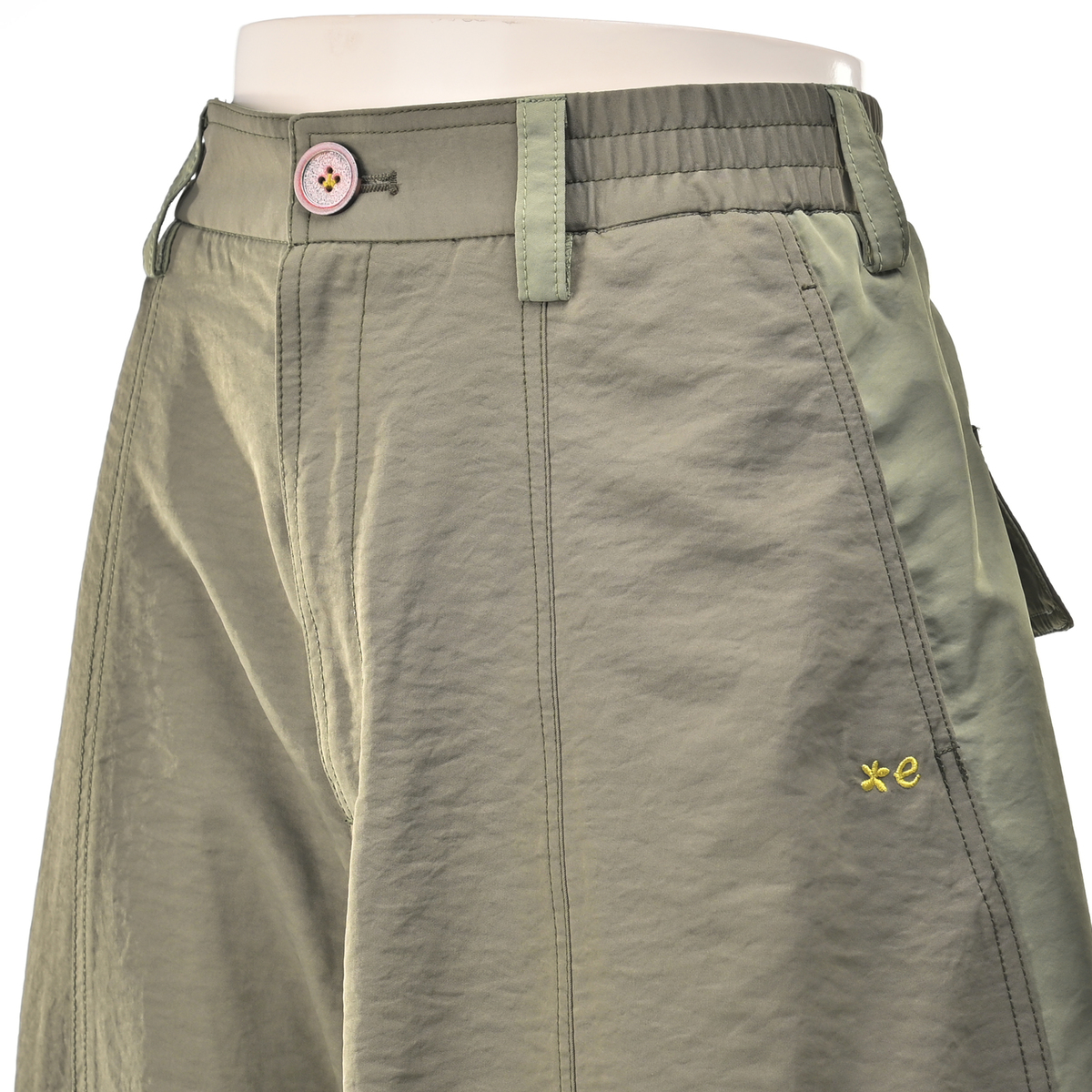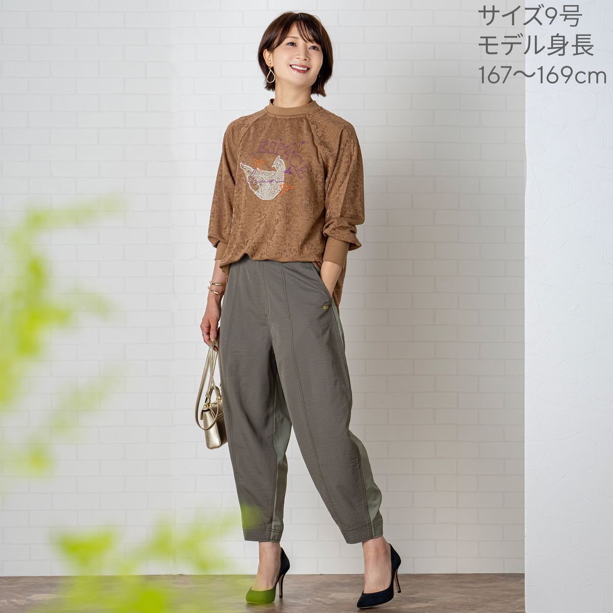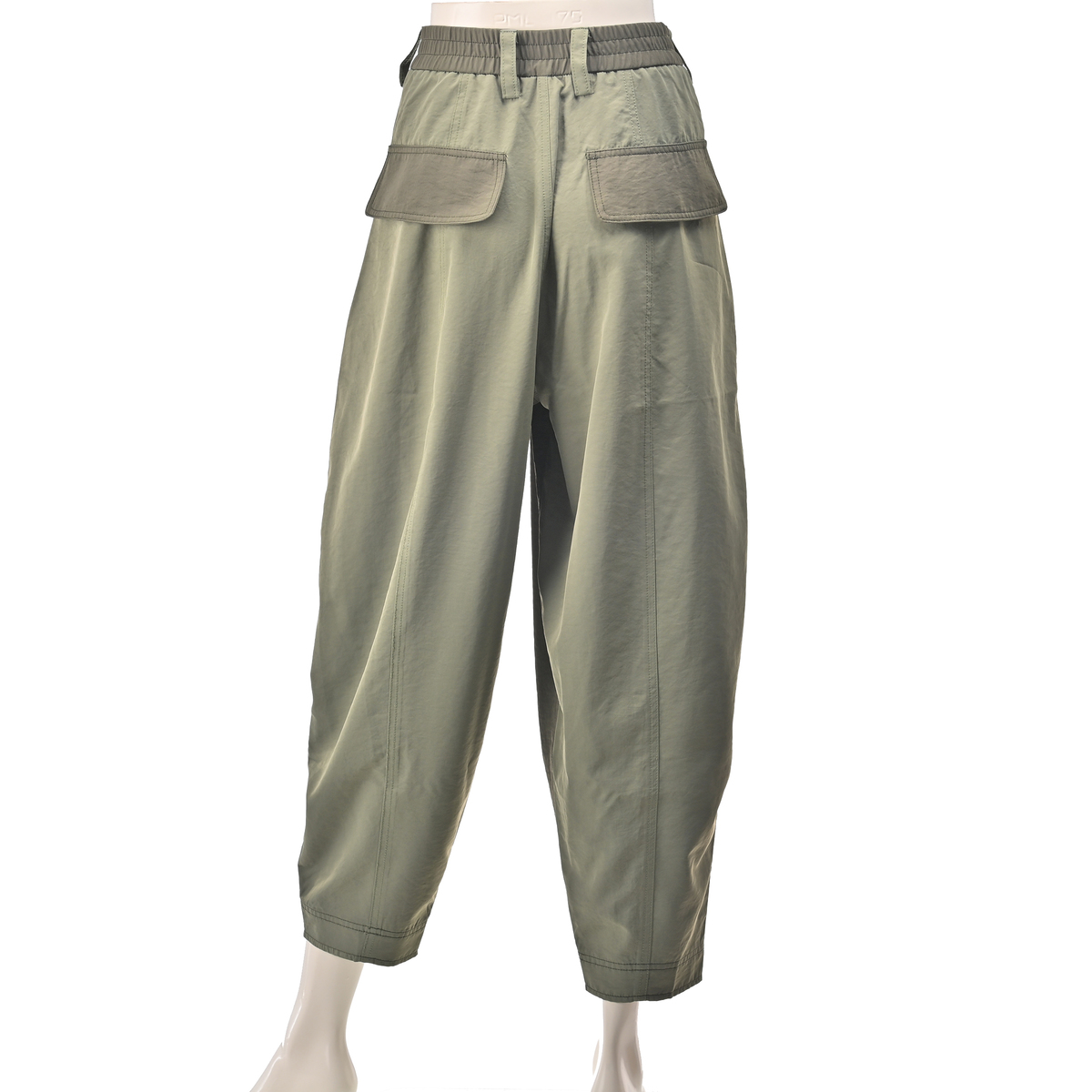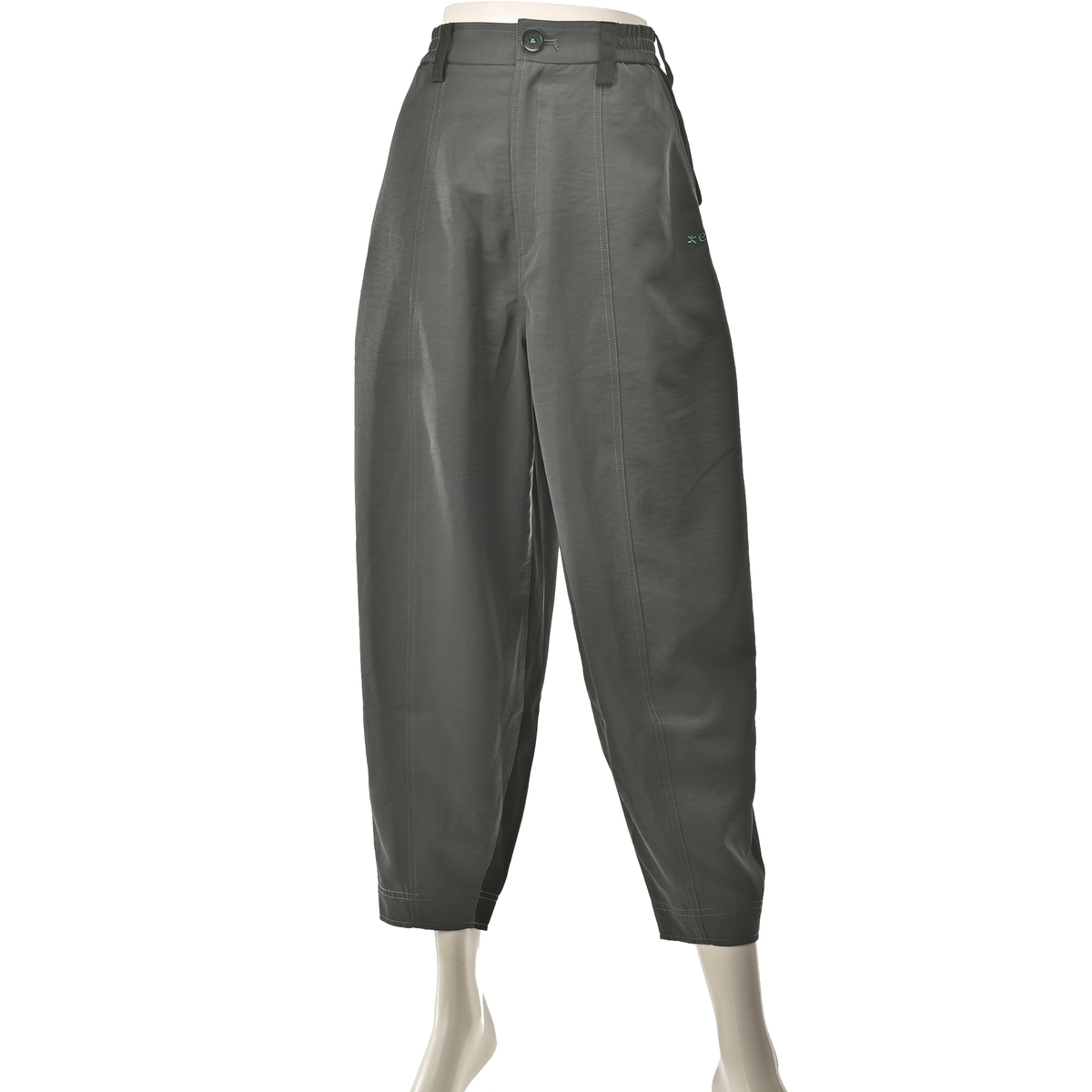 前後のセンターに切替を施すことで、膝部分が膨らみ、裾が絞られたバルーンシルエットに仕上げました。ウエストは前一部を除きゴム仕様でラクに穿けるアイテムです