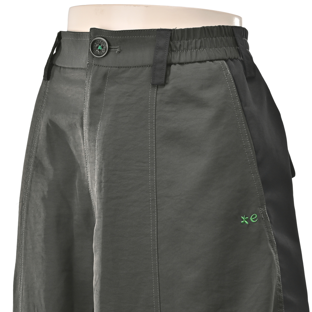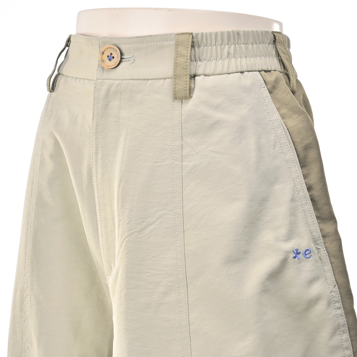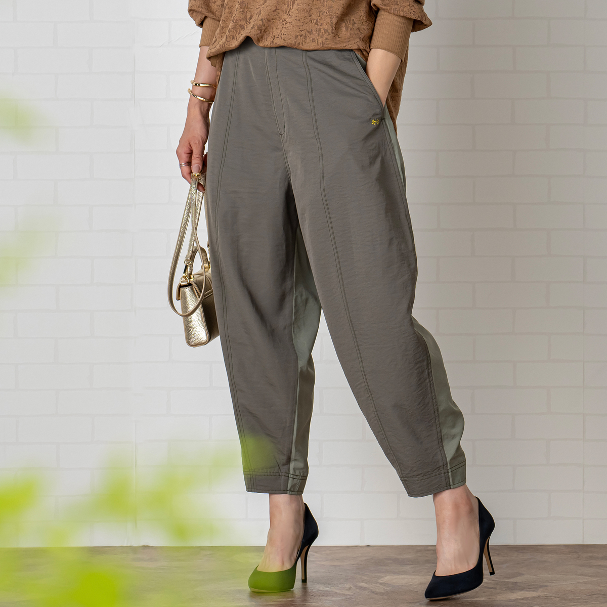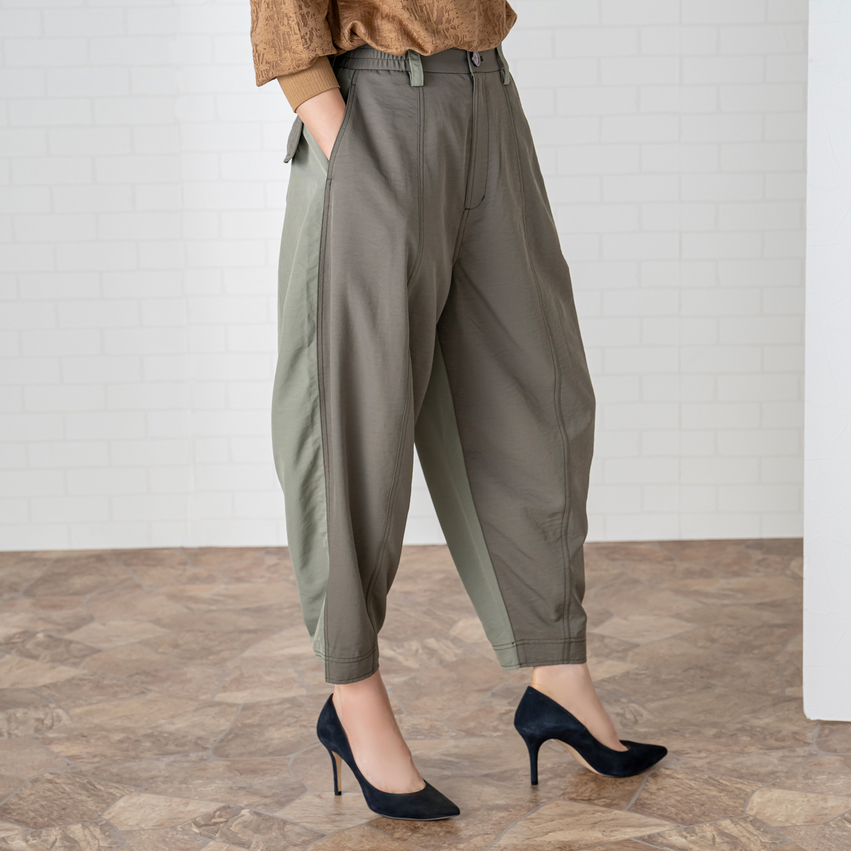 同系色を組合せたバイカラーデザインのバルーンパンツ。前後身頃や部分使いで巧みに色を切り替え、遊び心のあるデザインに仕上げました