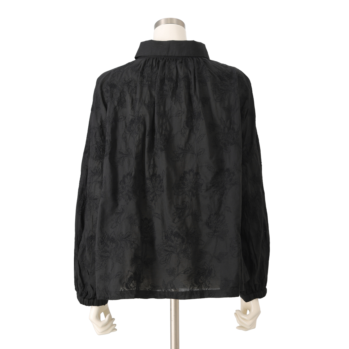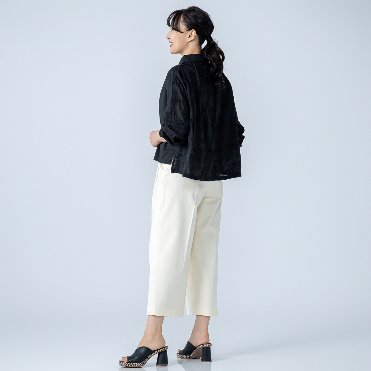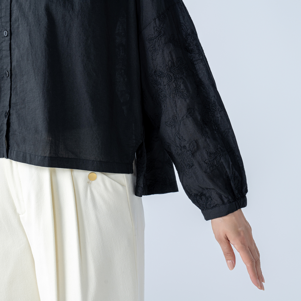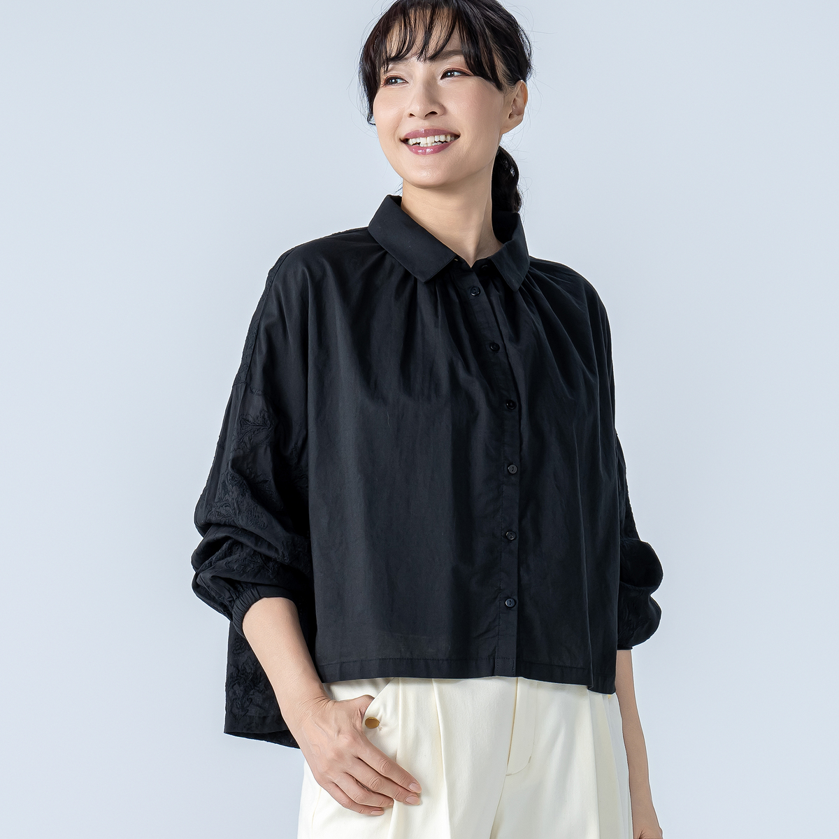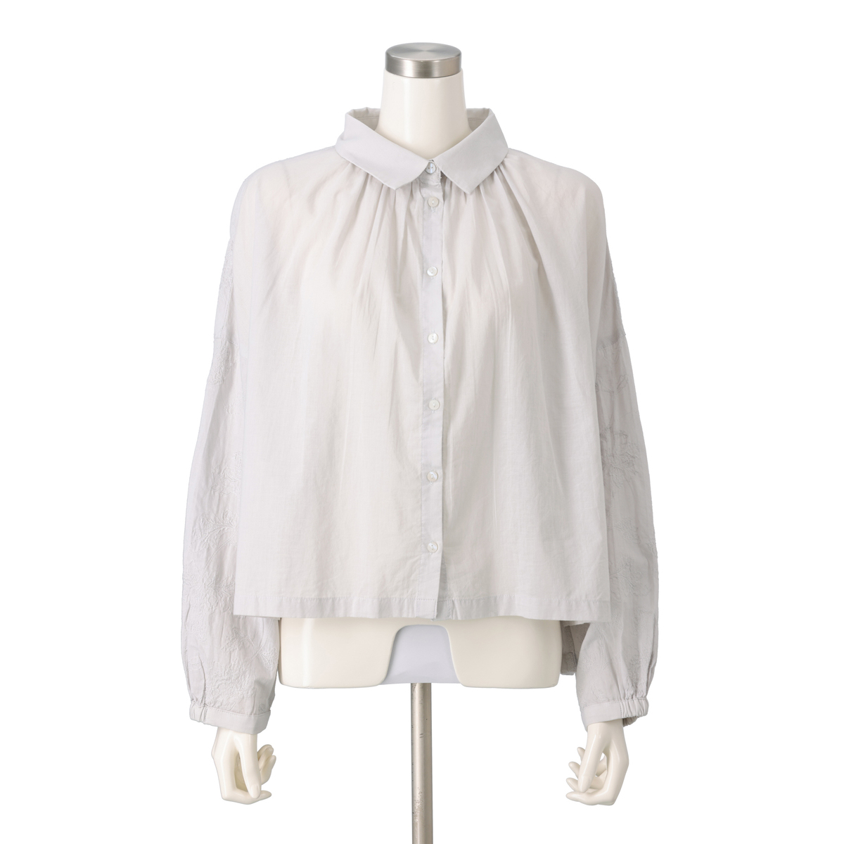 後ろ身頃と袖にあしらった繊細な刺繍が目を惹くブラウス。襟元と袖先にはギャザーを施し、やわらかなシルエットを生みだしています
