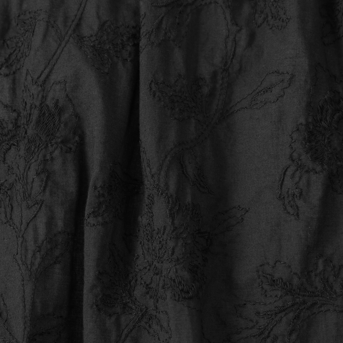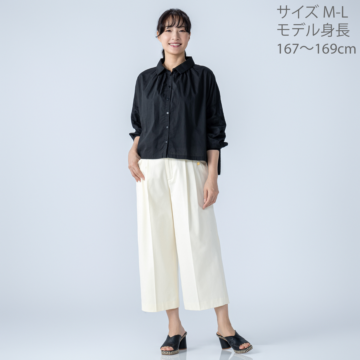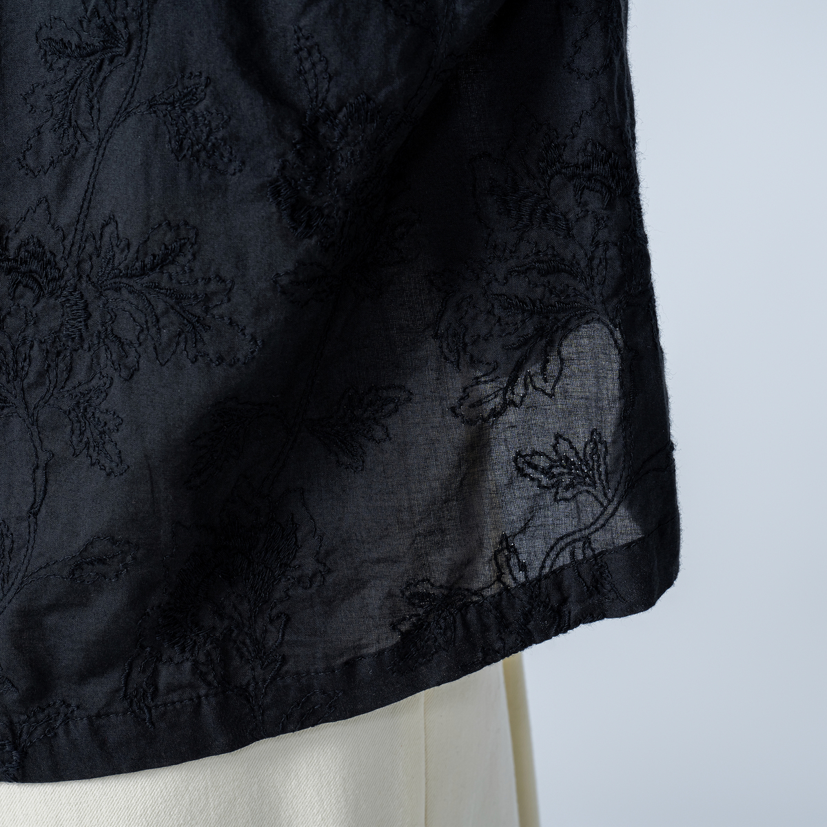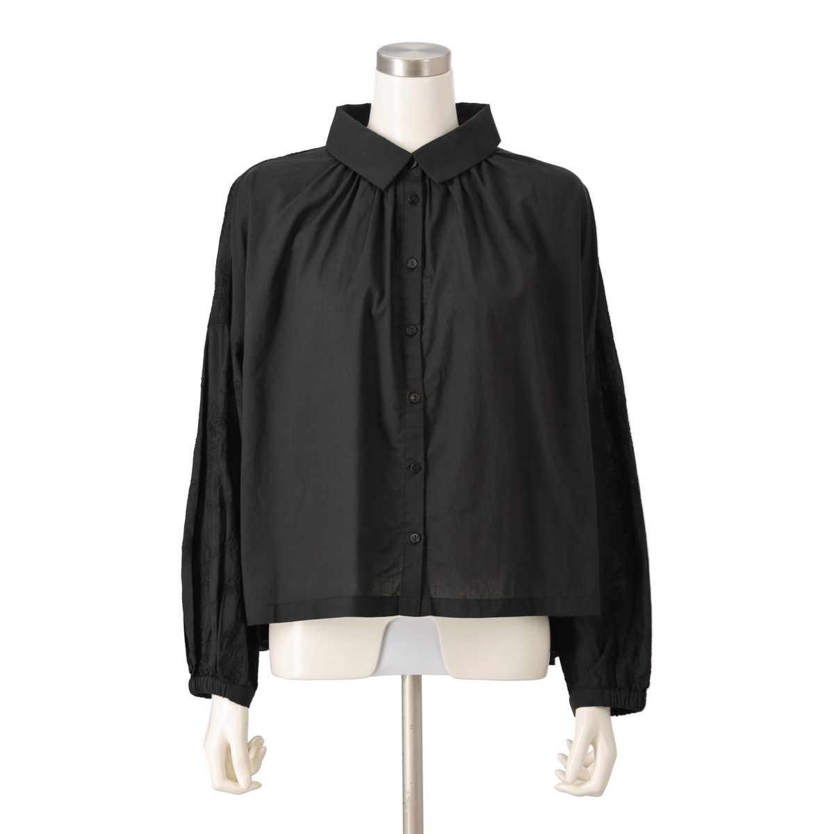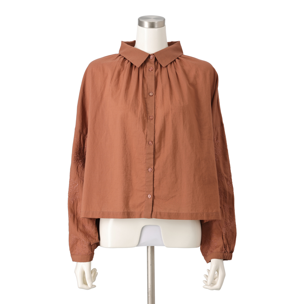 後ろ身頃と袖にあしらった繊細な刺繍が目を惹くブラウス。襟元と袖先にはギャザーを施し、やわらかなシルエットを生みだしています