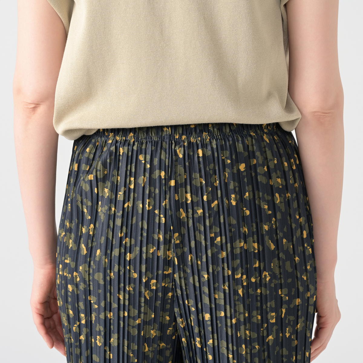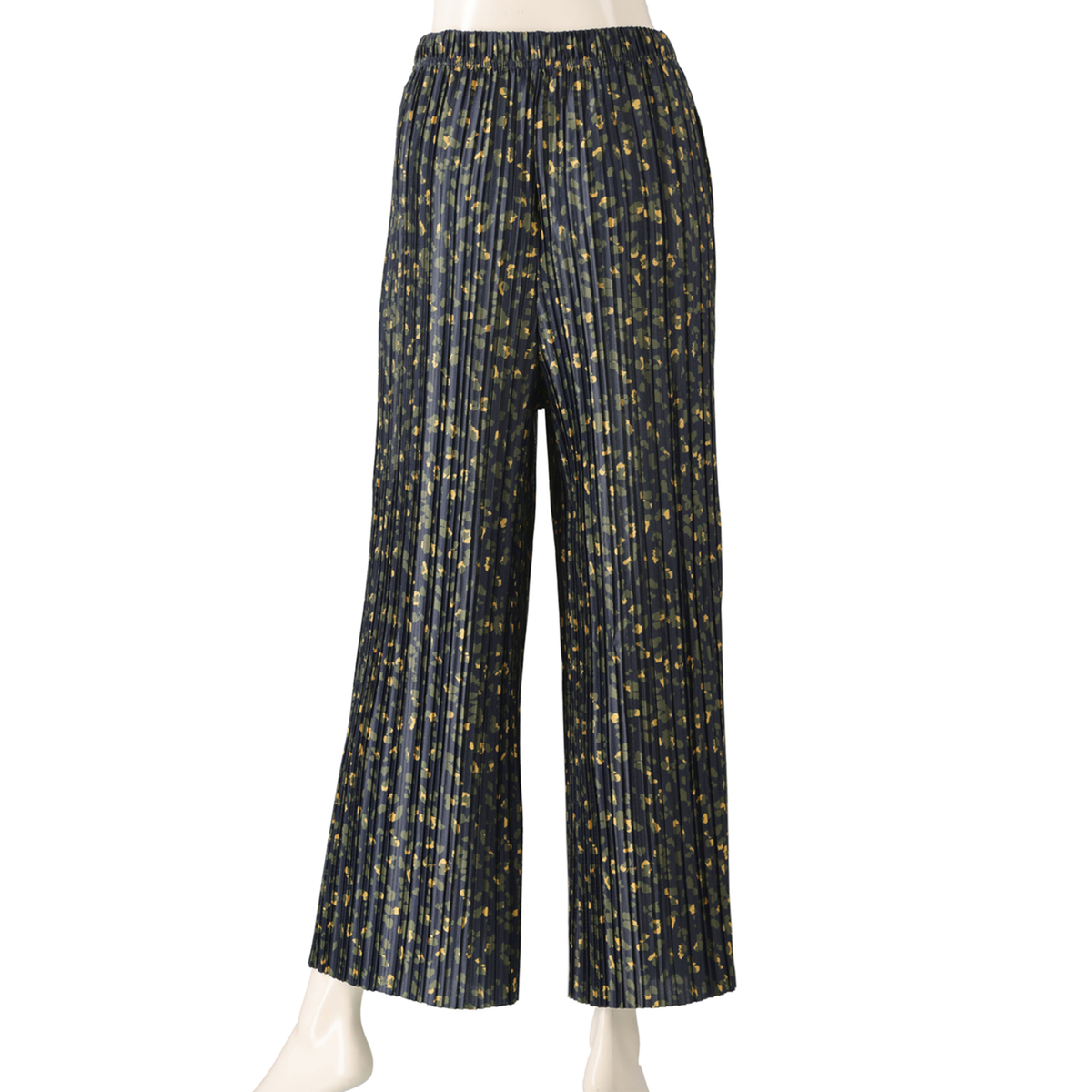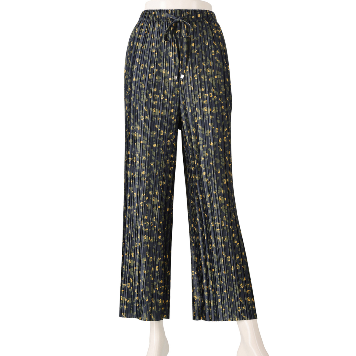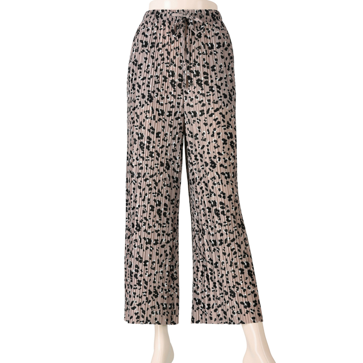 アニマル風のドット柄をプリントしたクレープ天竺のプリーツパンツ。落ち感のあるさらさらとした肌触りで、ポリウレタン入りのため、程よい反発感が綺麗なシルエットを演出します。また、総プリーツが縦のラインを強調し、美脚効果にも期待できます