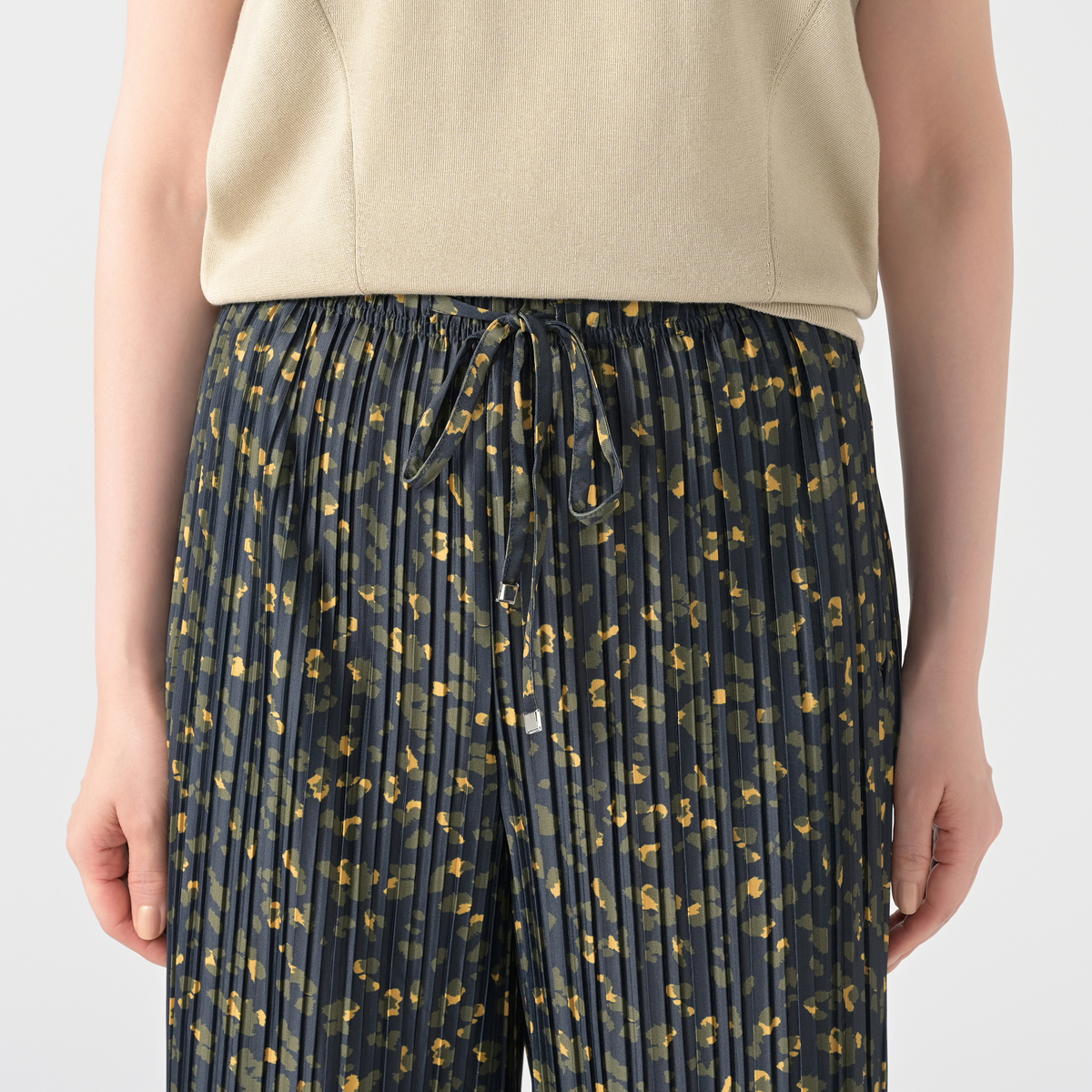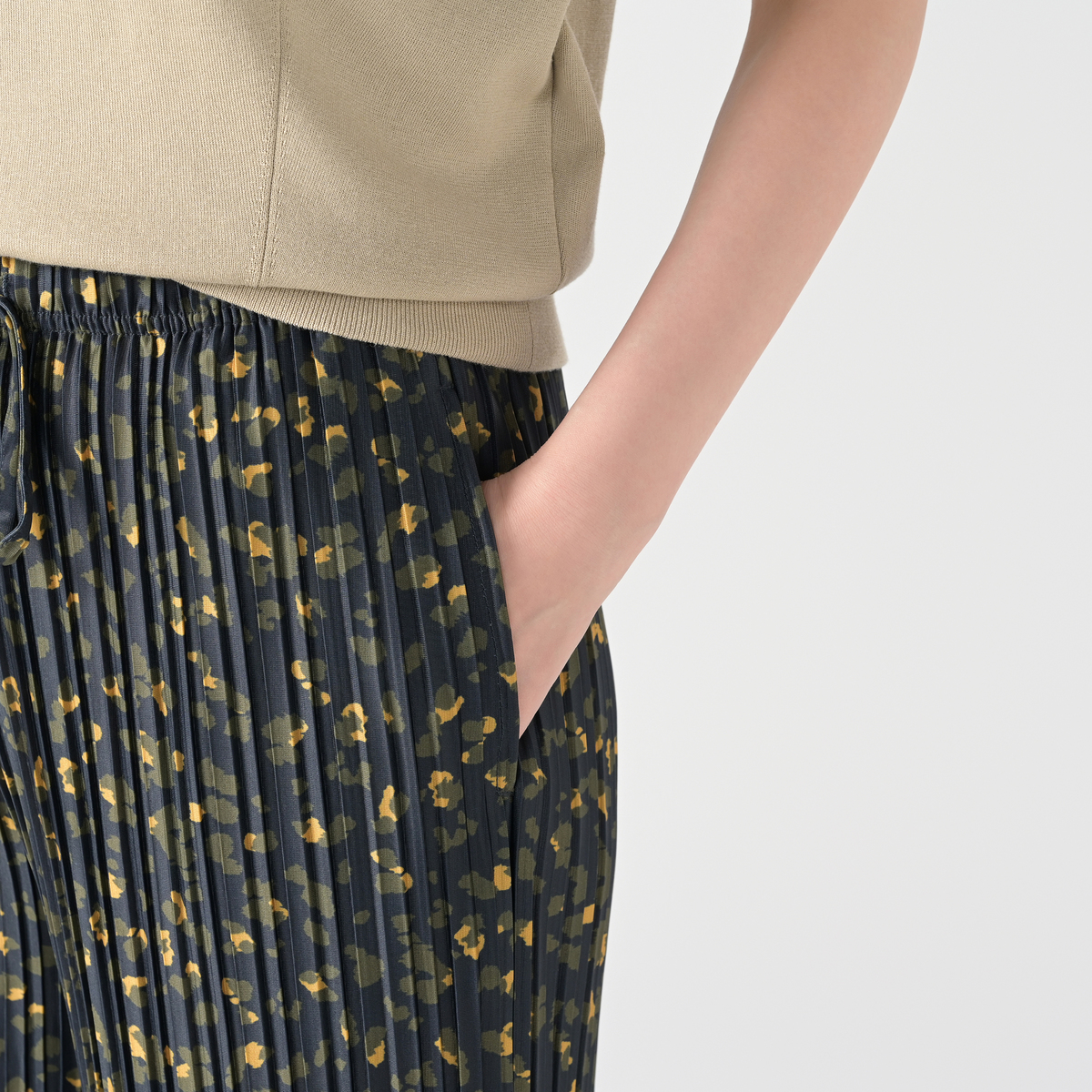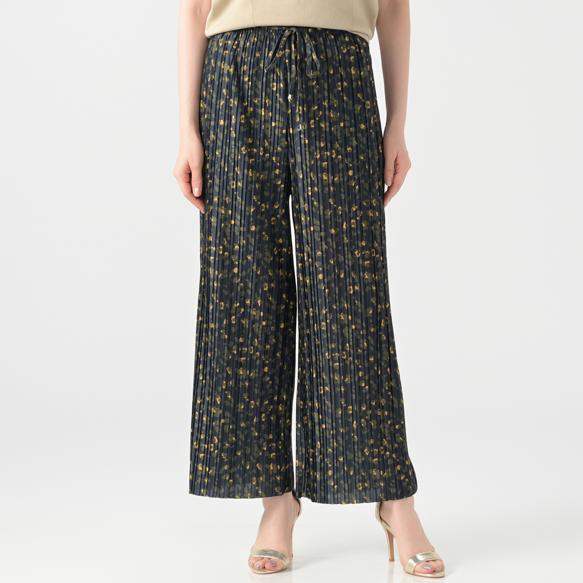アニマル風のドット柄をプリントしたクレープ天竺のプリーツパンツ。落ち感のあるさらさらとした肌触りで、ポリウレタン入りのため、程よい反発感が綺麗なシルエットを演出します。また、総プリーツが縦のラインを強調し、美脚効果にも期待できます