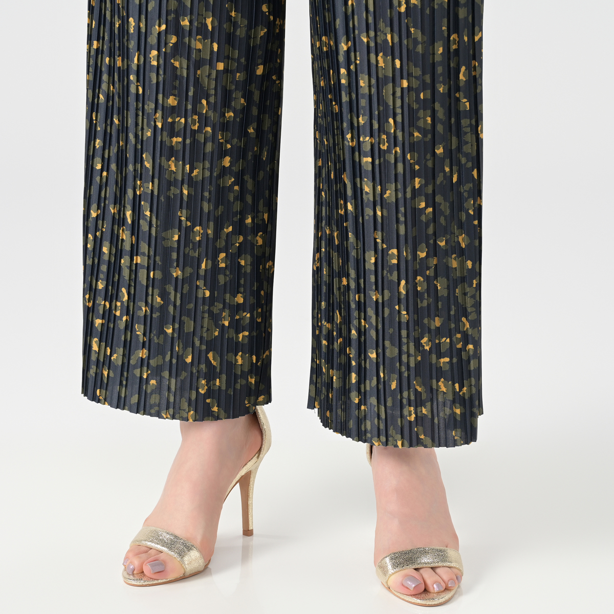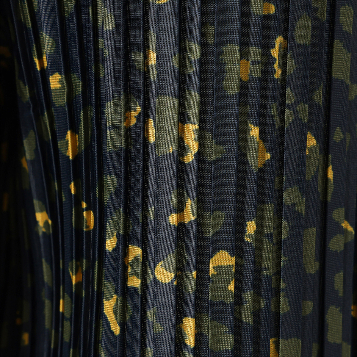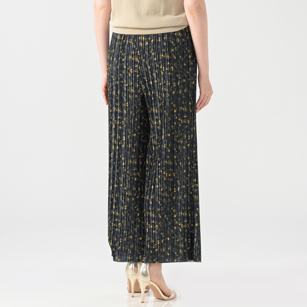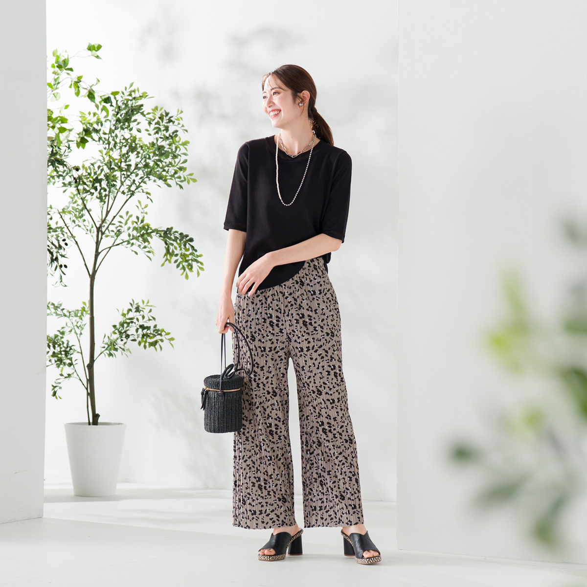 アニマル風のドット柄をプリントしたクレープ天竺のプリーツパンツ。落ち感のあるさらさらとした肌触りで、ポリウレタン入りのため、程よい反発感が綺麗なシルエットを演出します。また、総プリーツが縦のラインを強調し、美脚効果にも期待できます