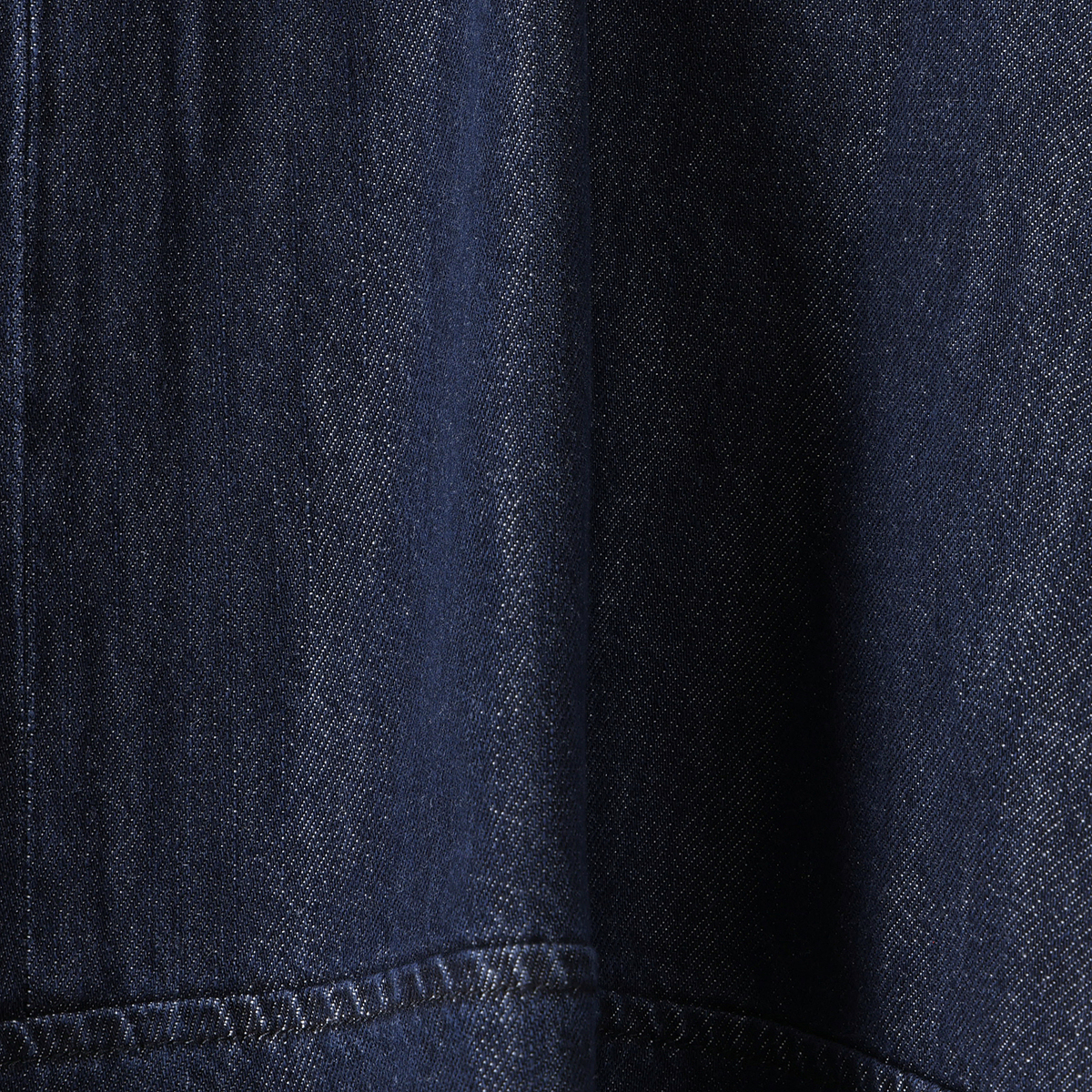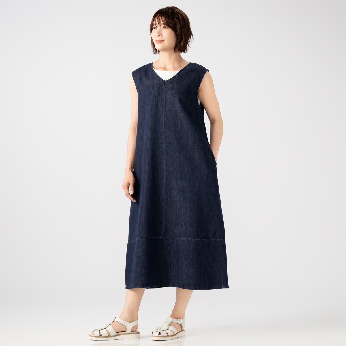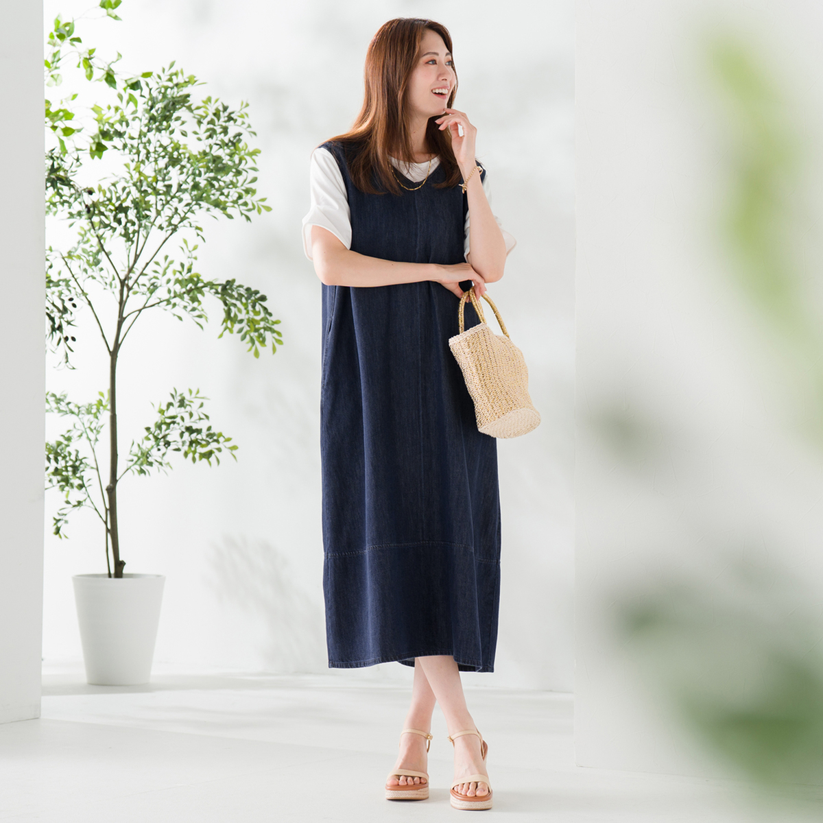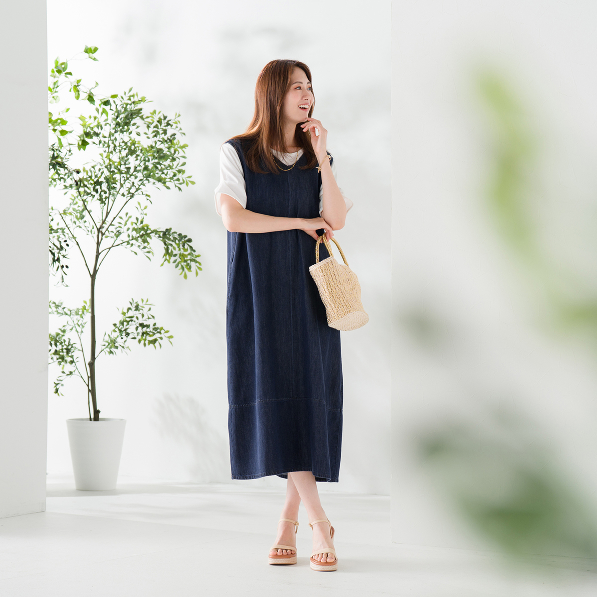 落ち感のある柔らかなデニム生地で仕立てたジャンスカ。太めのスラブも入った本格デニムで、ロングシーズン着回せる程よい厚みです