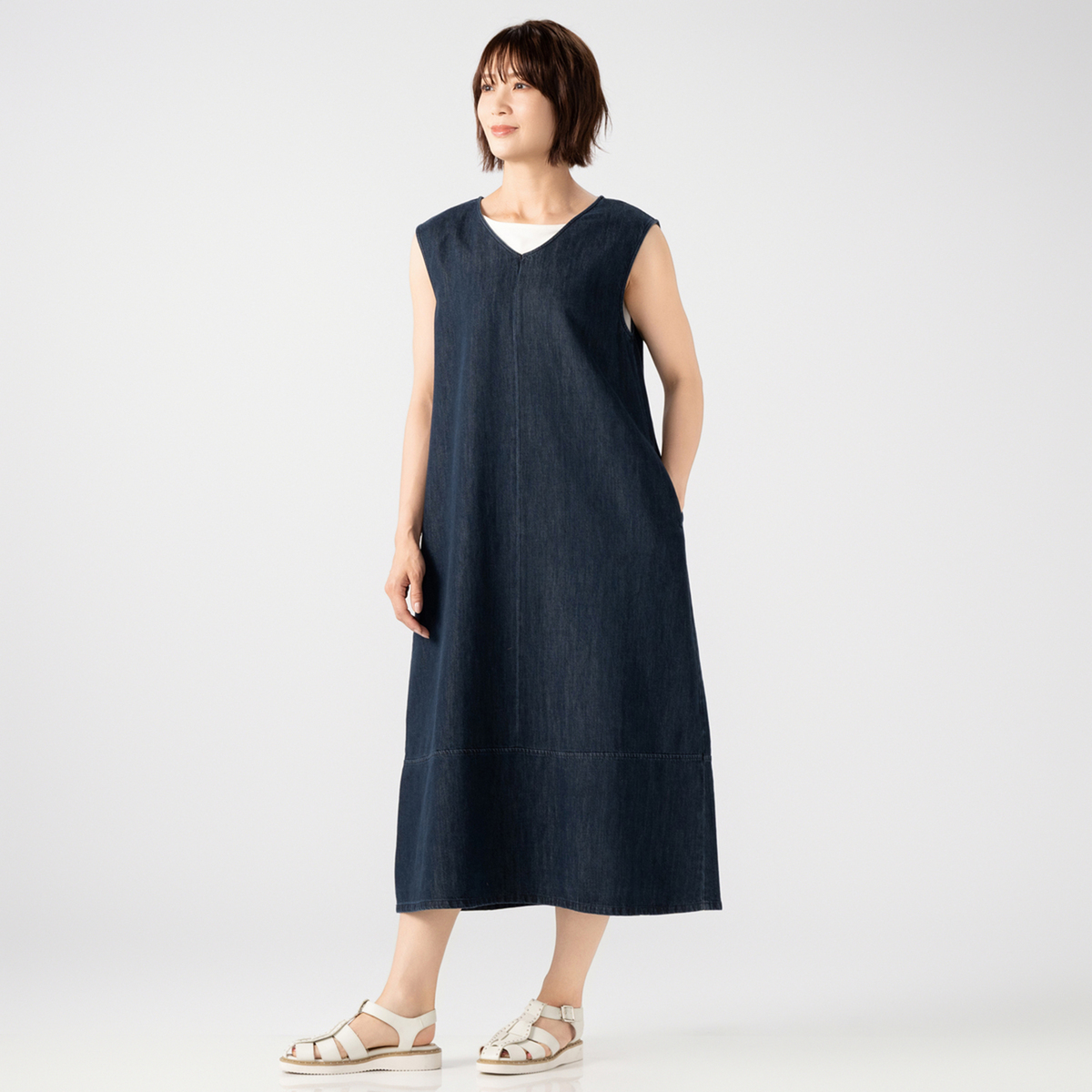 前後ともにVネックのAラインで、センター切り替えがすっきりとした印象を演出します。腰下の横切り替えや両脇ポケットが、日常の動きやすさと実用性を高めています