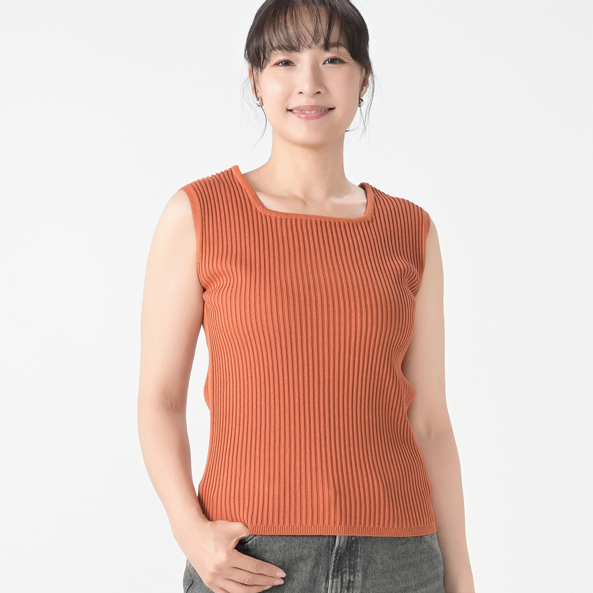 スクエアネックがシャープな印象を与え、鎖骨やデコルテ周りをすっきりと見せてくれます。羽織のインナーにも合わせやすく、着こなしの幅が広がります