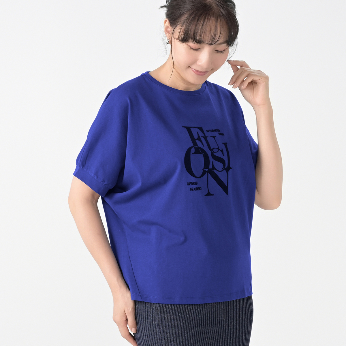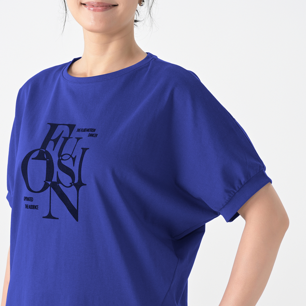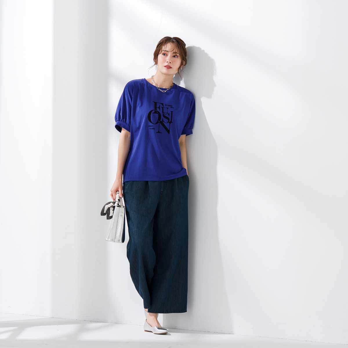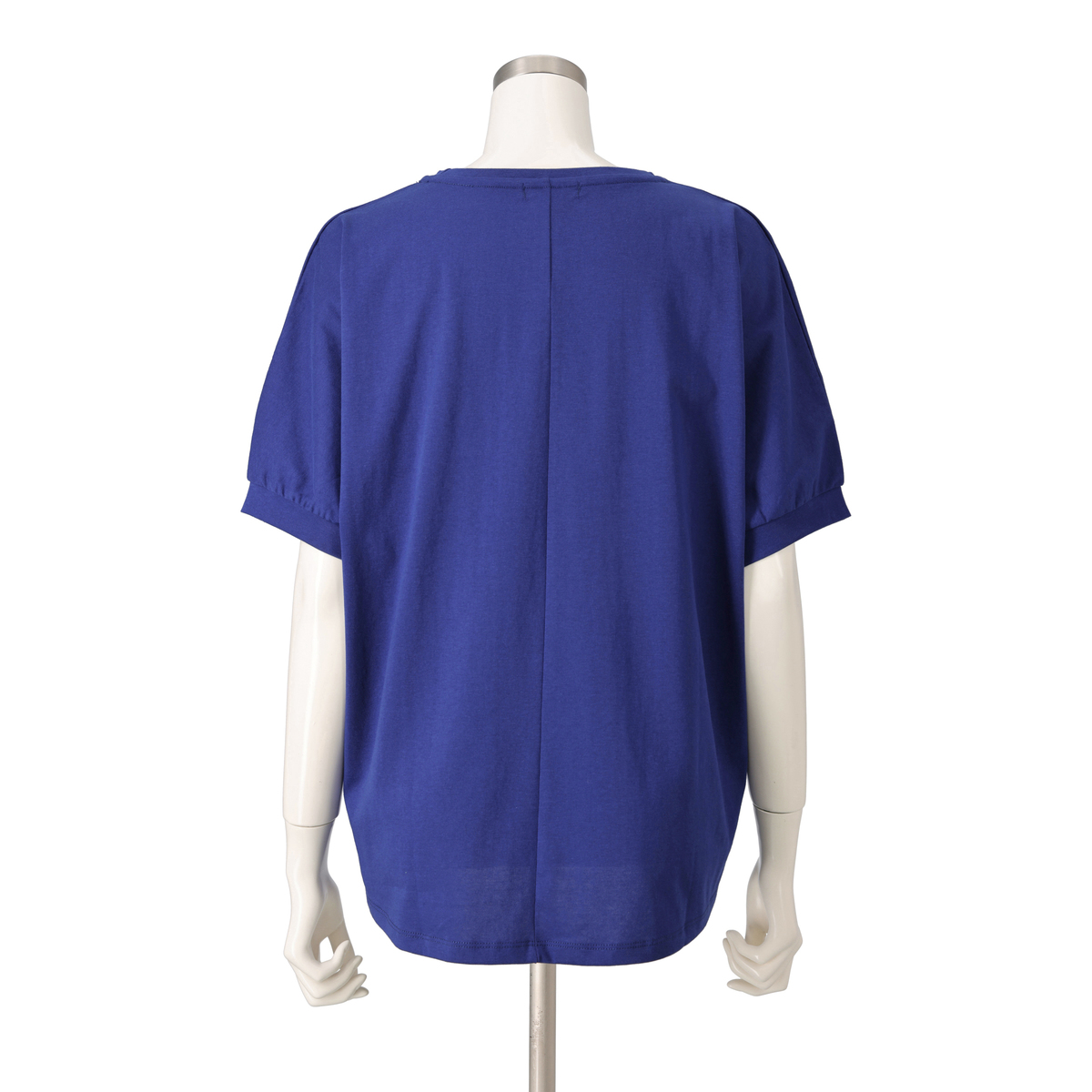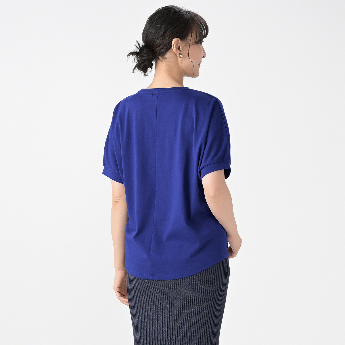ドルマンのギャザースリーブが体型をやさしくカバー。大人のゆったりシルエットが魅力のTシャツです