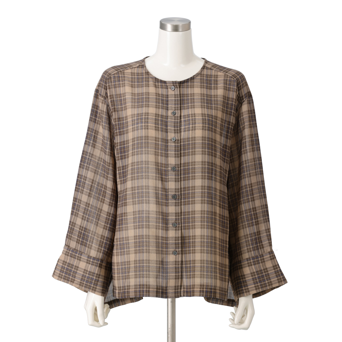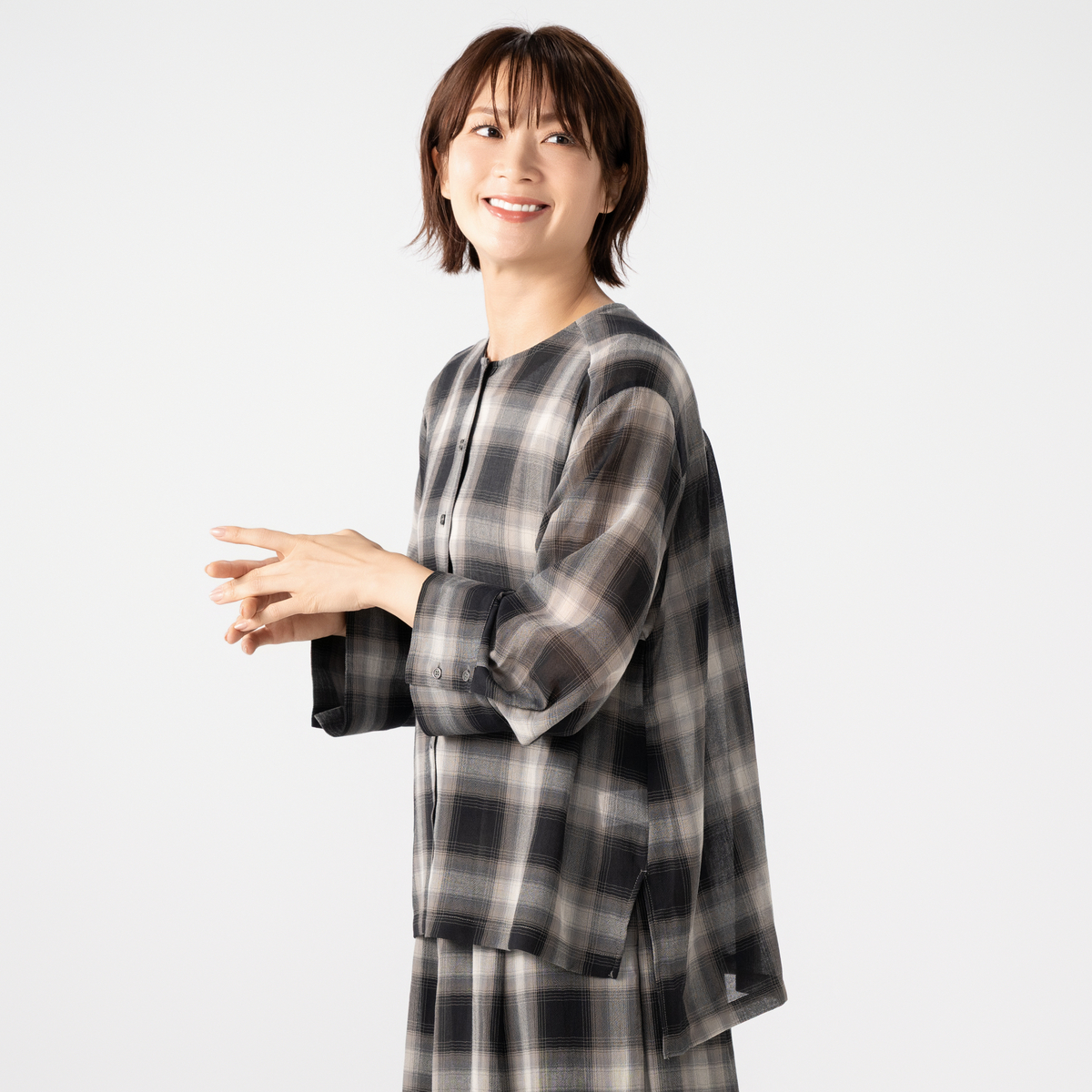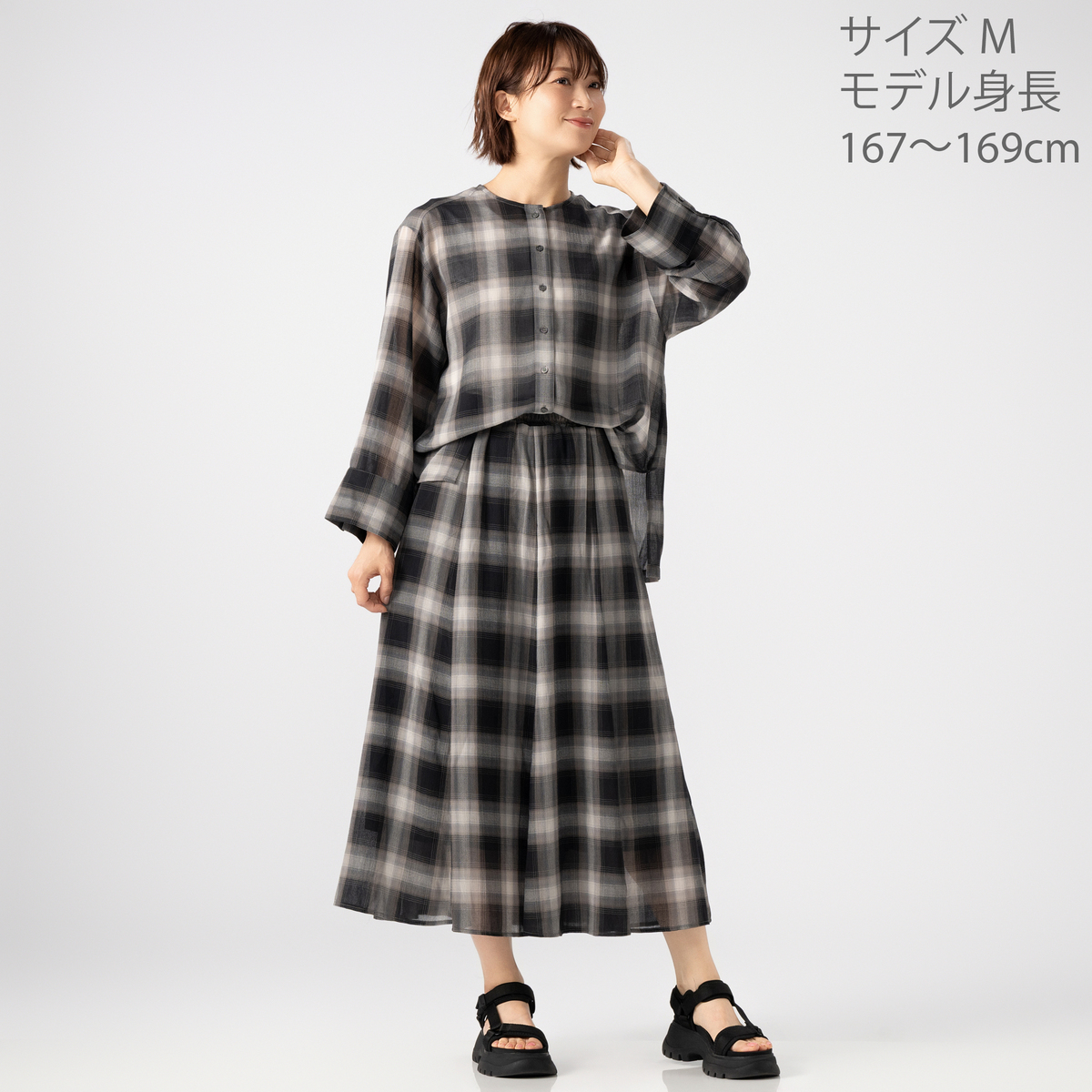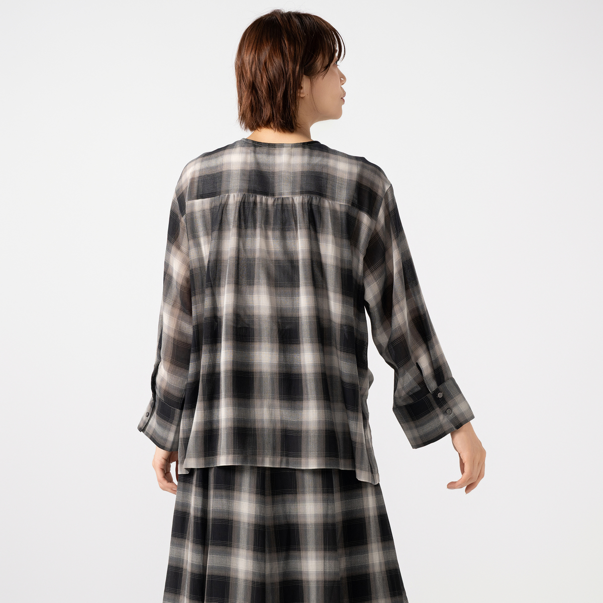 薄くて軽やかな素材が心地よく、程よい透け感が上品な印象を演出。天然ライクで肌離れの良いポリエステル素材のシアーチェックシャツです