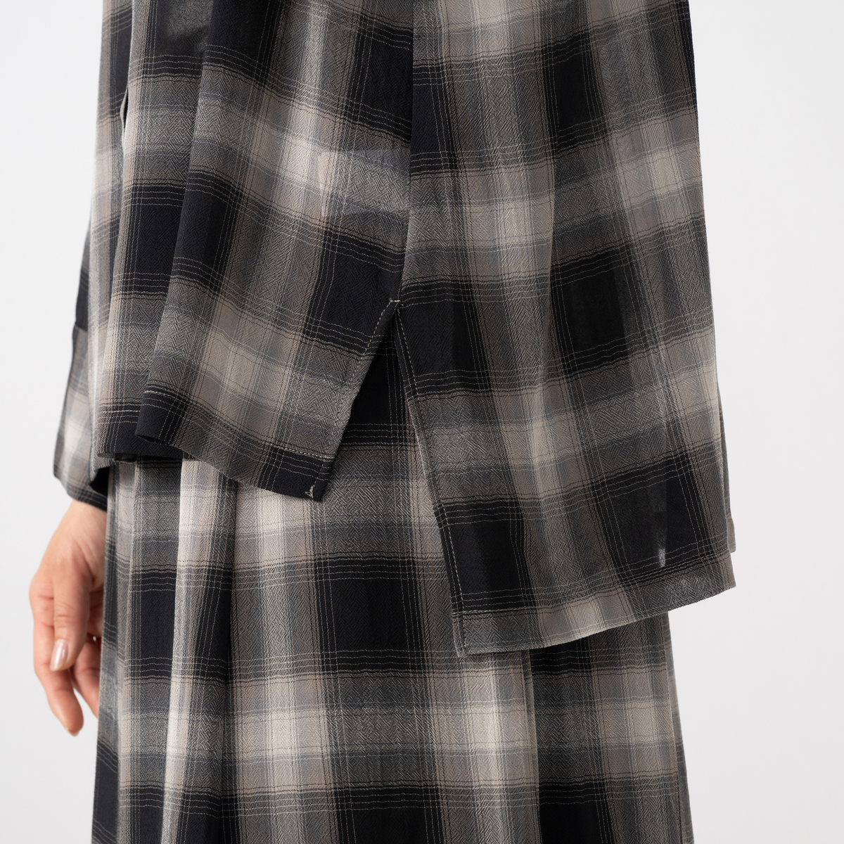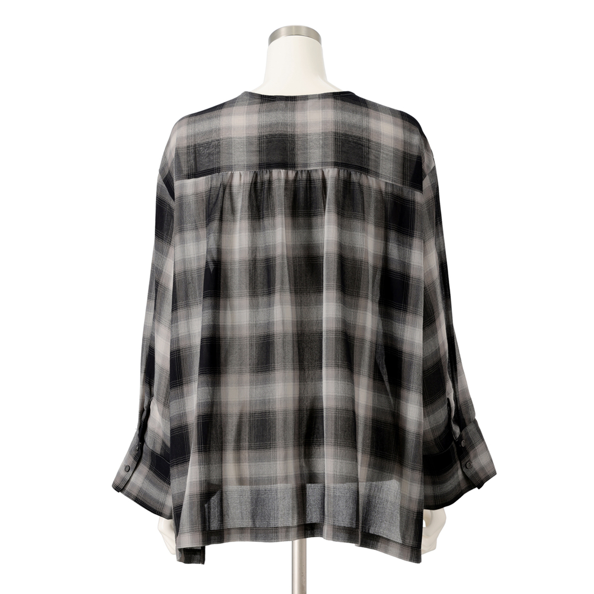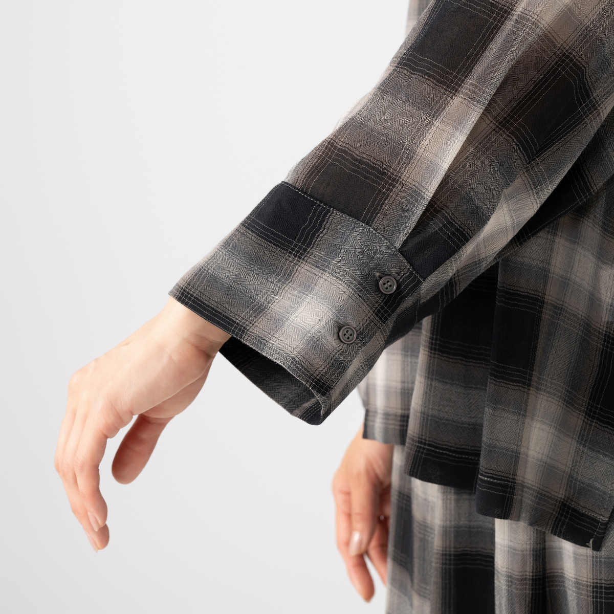 薄くて軽やかな素材が心地よく、程よい透け感が上品な印象を演出。天然ライクで肌離れの良いポリエステル素材のシアーチェックシャツです