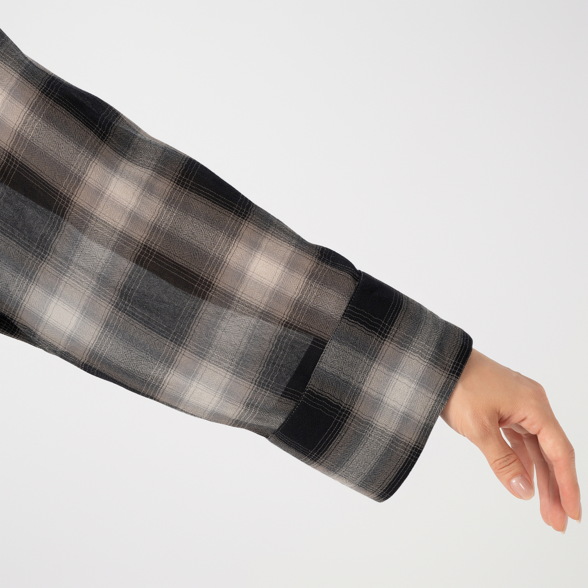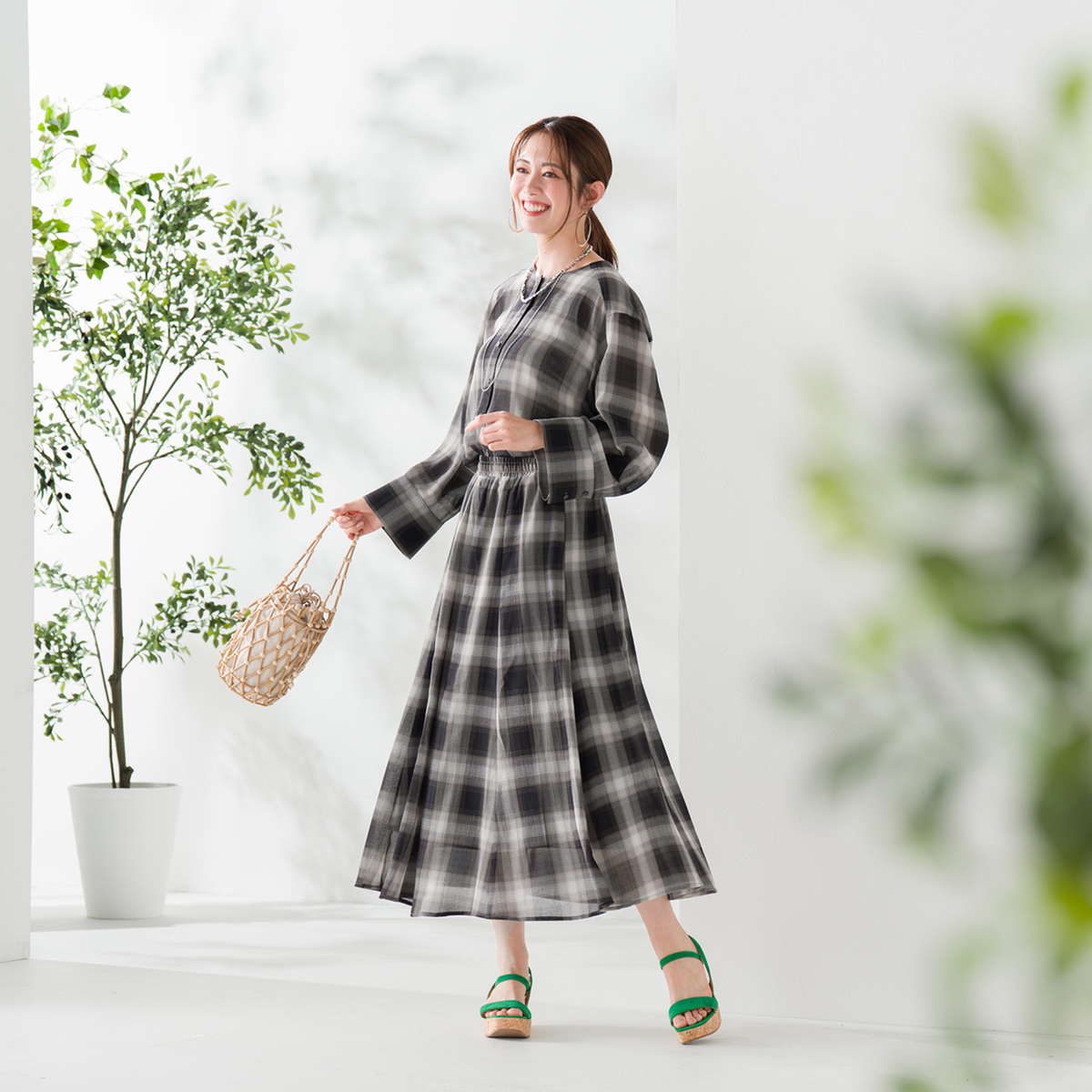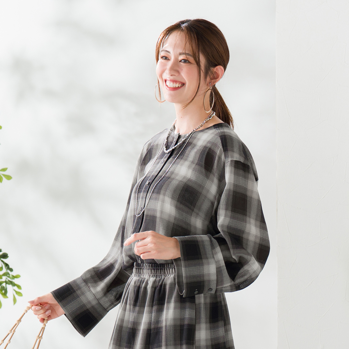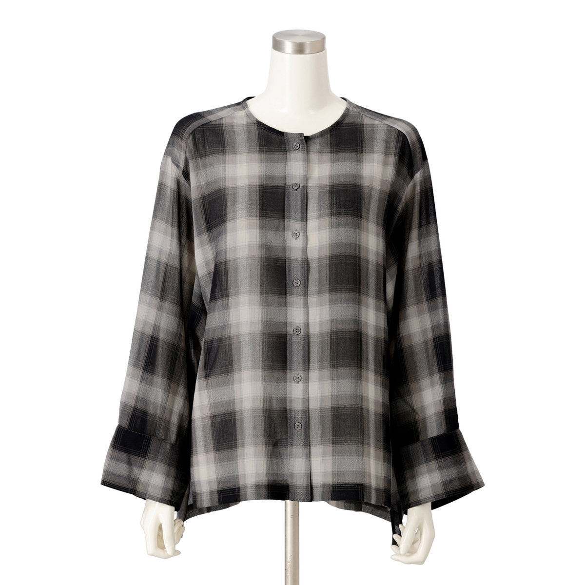 薄くて軽やかな素材が心地よく、程よい透け感が上品な印象を演出。天然ライクで肌離れの良いポリエステル素材のシアーチェックシャツです