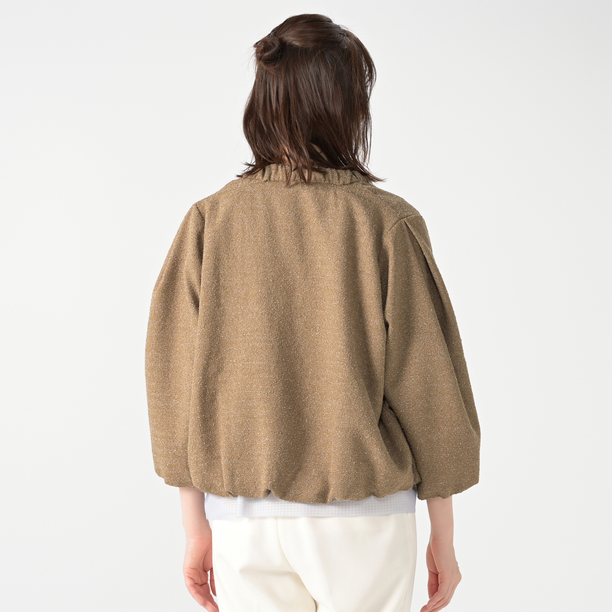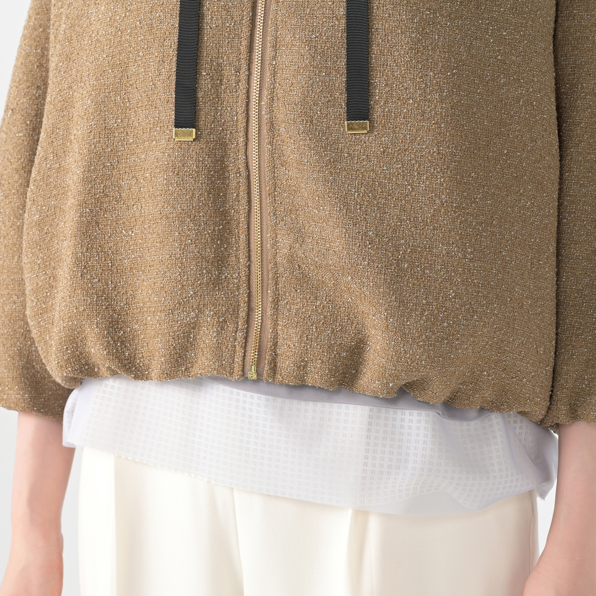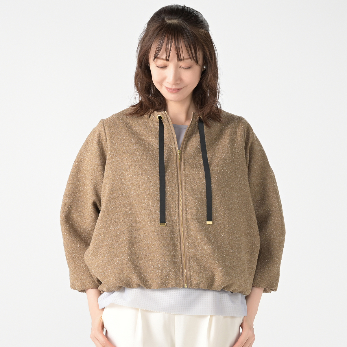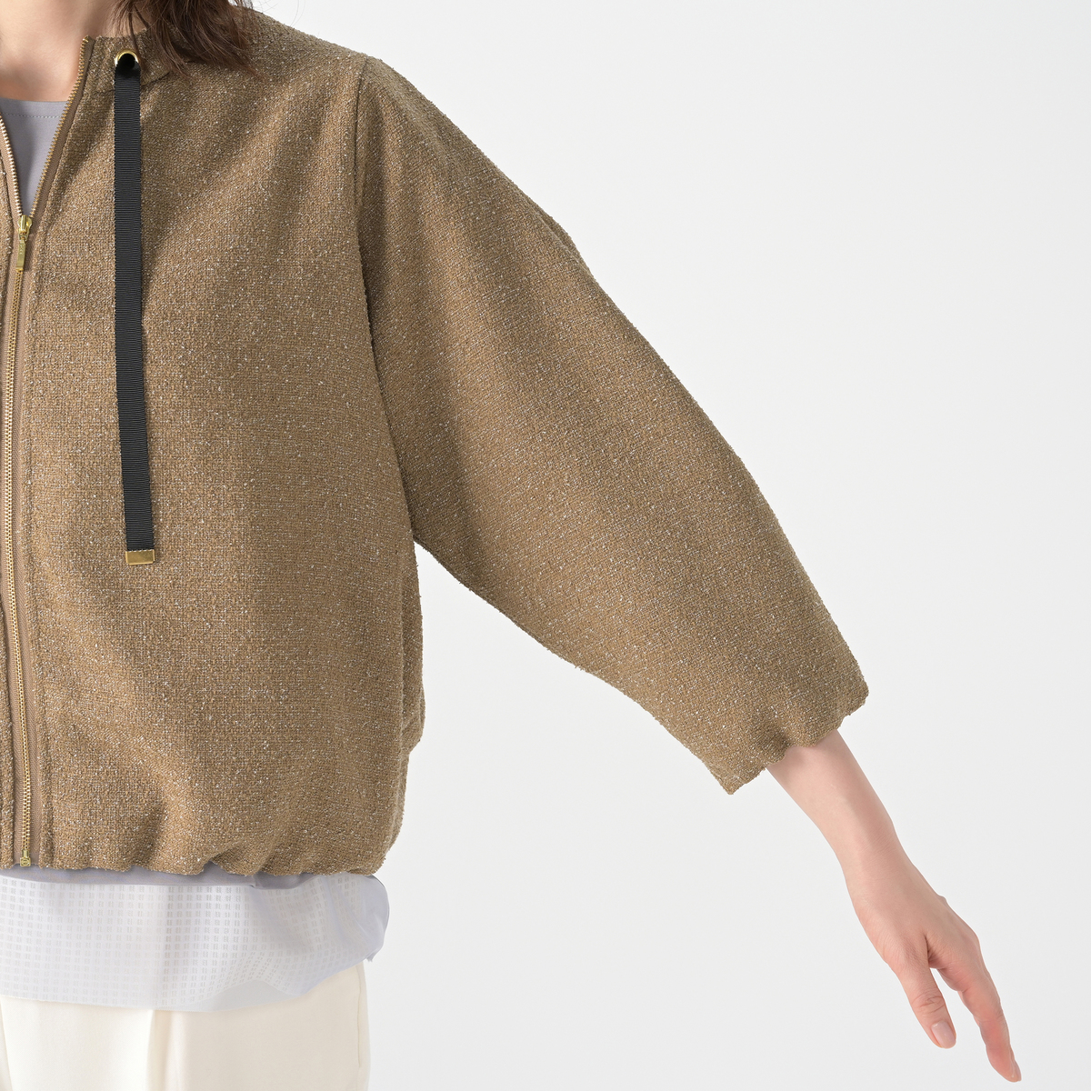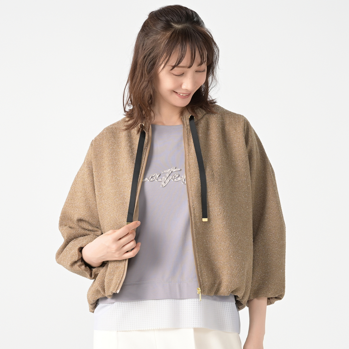 光をやさしく反射するラメ糸が織り込まれた、ツイード素材のブルゾン。軽やかで着心地のよい素材感に加え、裏地付きで肌触りもなめらか。フロントはファスナー仕様で、着脱もスムーズ。開けても閉めてもサマになるデザインで、落ち着いた印象の中に華やかさがあり、デイリー使いからちょっとしたお呼ばれシーンまで幅広く対応します