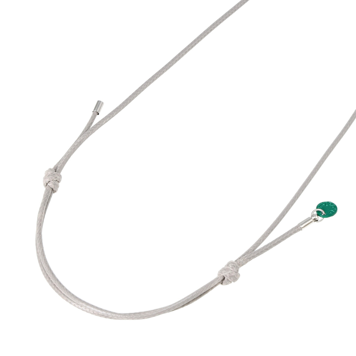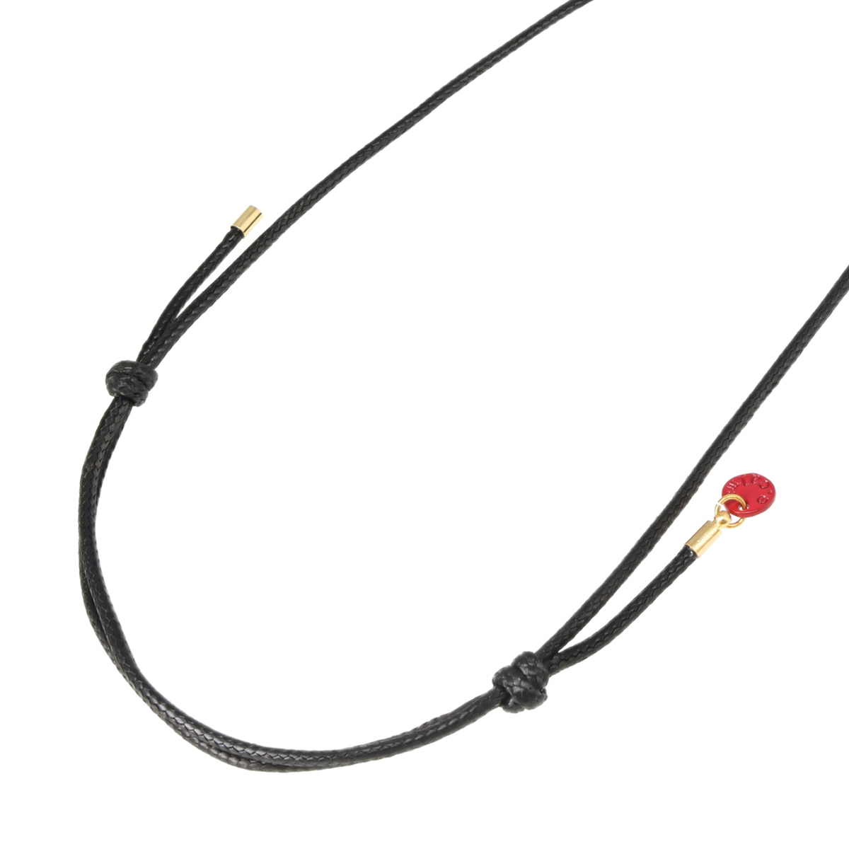 蝋引き紐の先端にブランドロゴ入りのチャームを配置。カラフルな塗装がアクセントとなり、さりげない個性を加えます。また、結び目のスライドで長さ調整も可能です