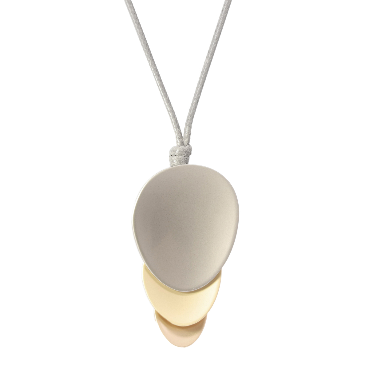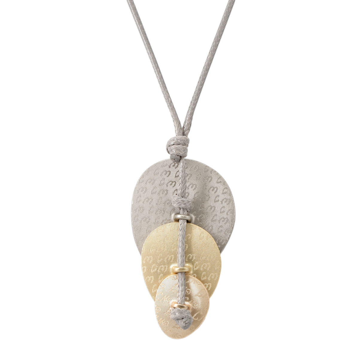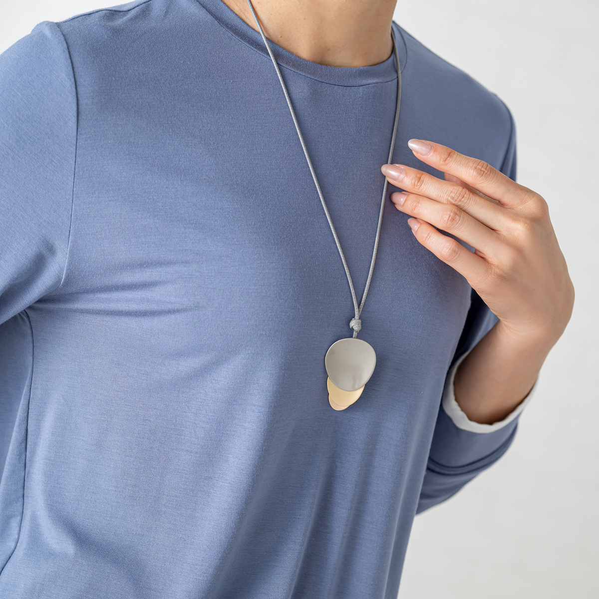 大中小のオーバルパーツを使ったネックレス。マット仕上げのメタルモチーフが独特の光沢を放ち、軽い着け心地です