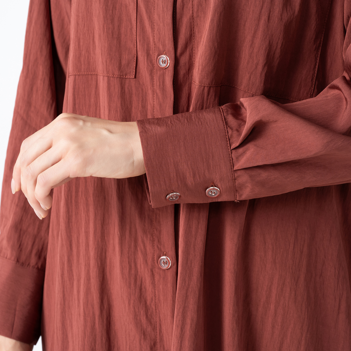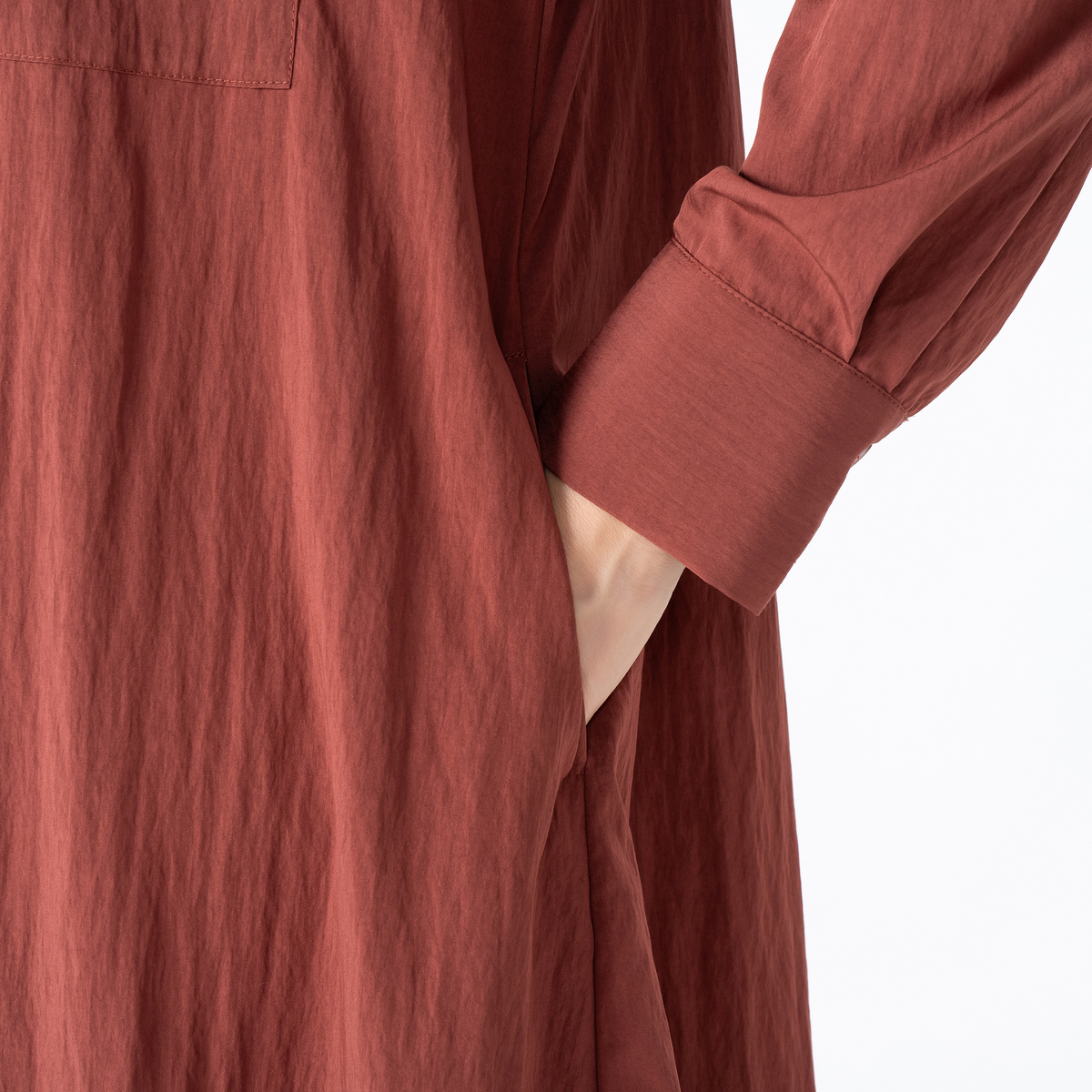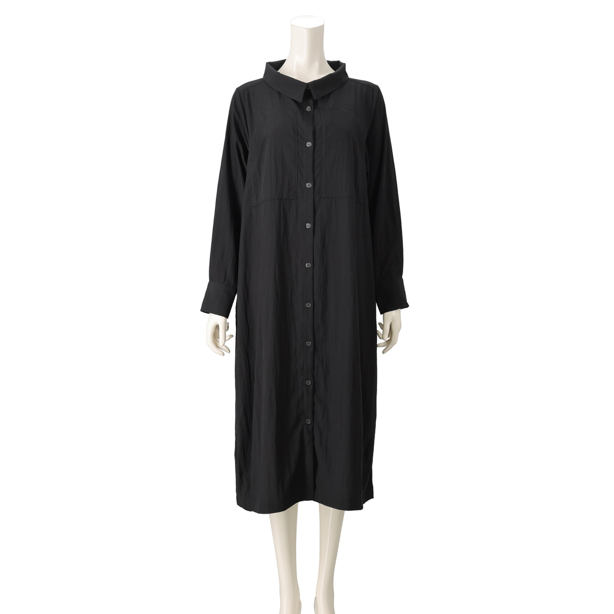 裾に向かって広がるフレアなシャツワンピース。両脇のタックで程よい丸みをプラス。ボリュームが出すぎないコクーンシルエットにデザインしました