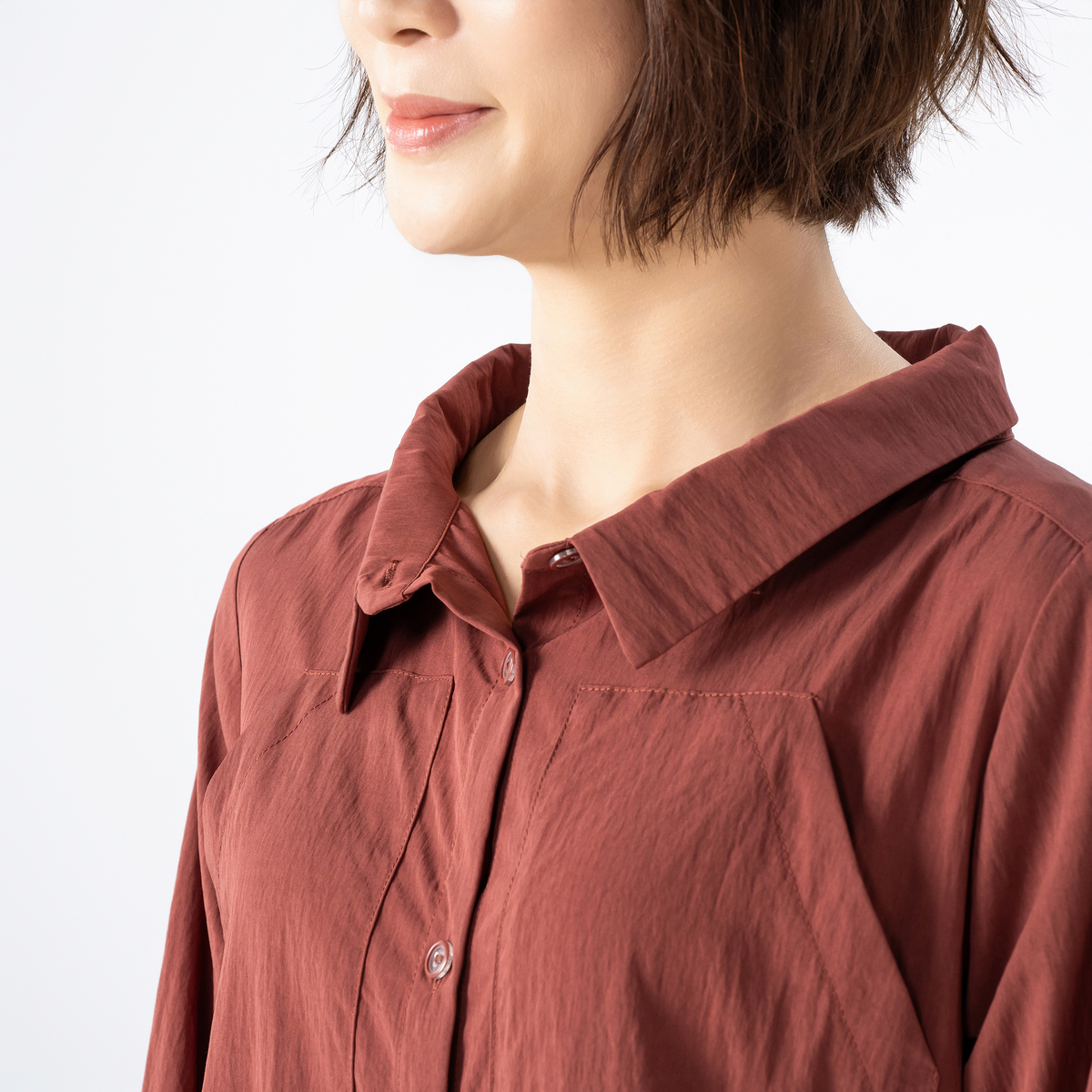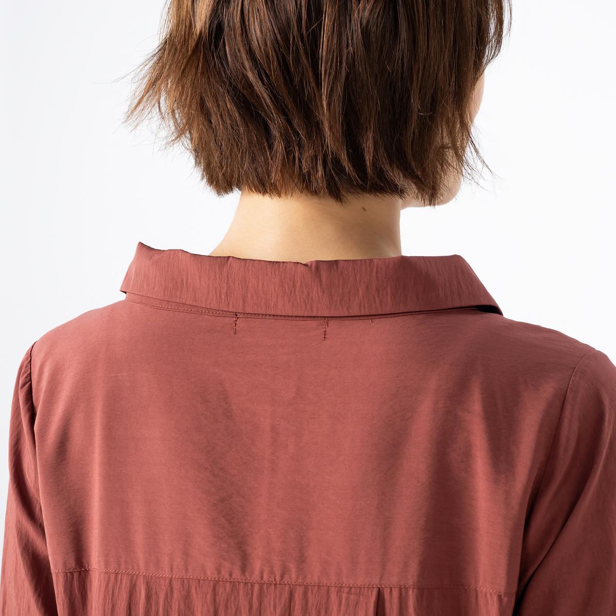横に広く立ち上がる衿が、首元を細く見せて小顔効果も期待。肩回りはセットインスリーブですっきりとさせ、衿のボリュームが際立ちながら、お顔まわりに抜け感をもたらします