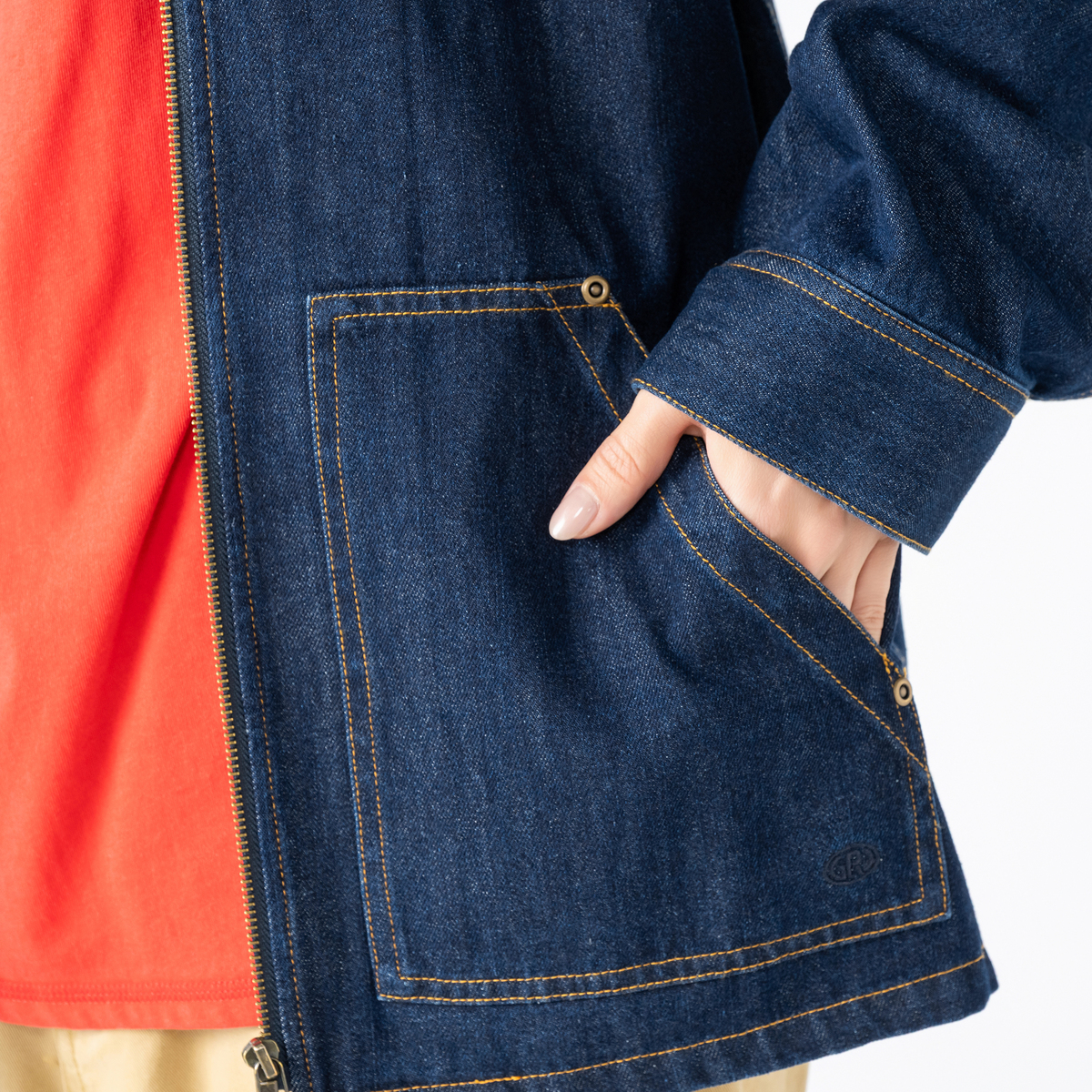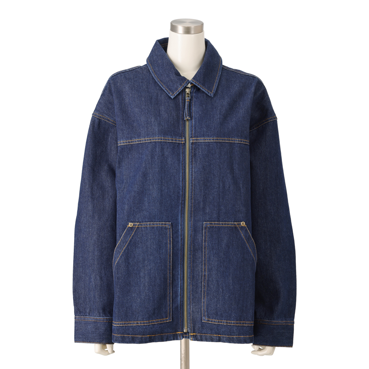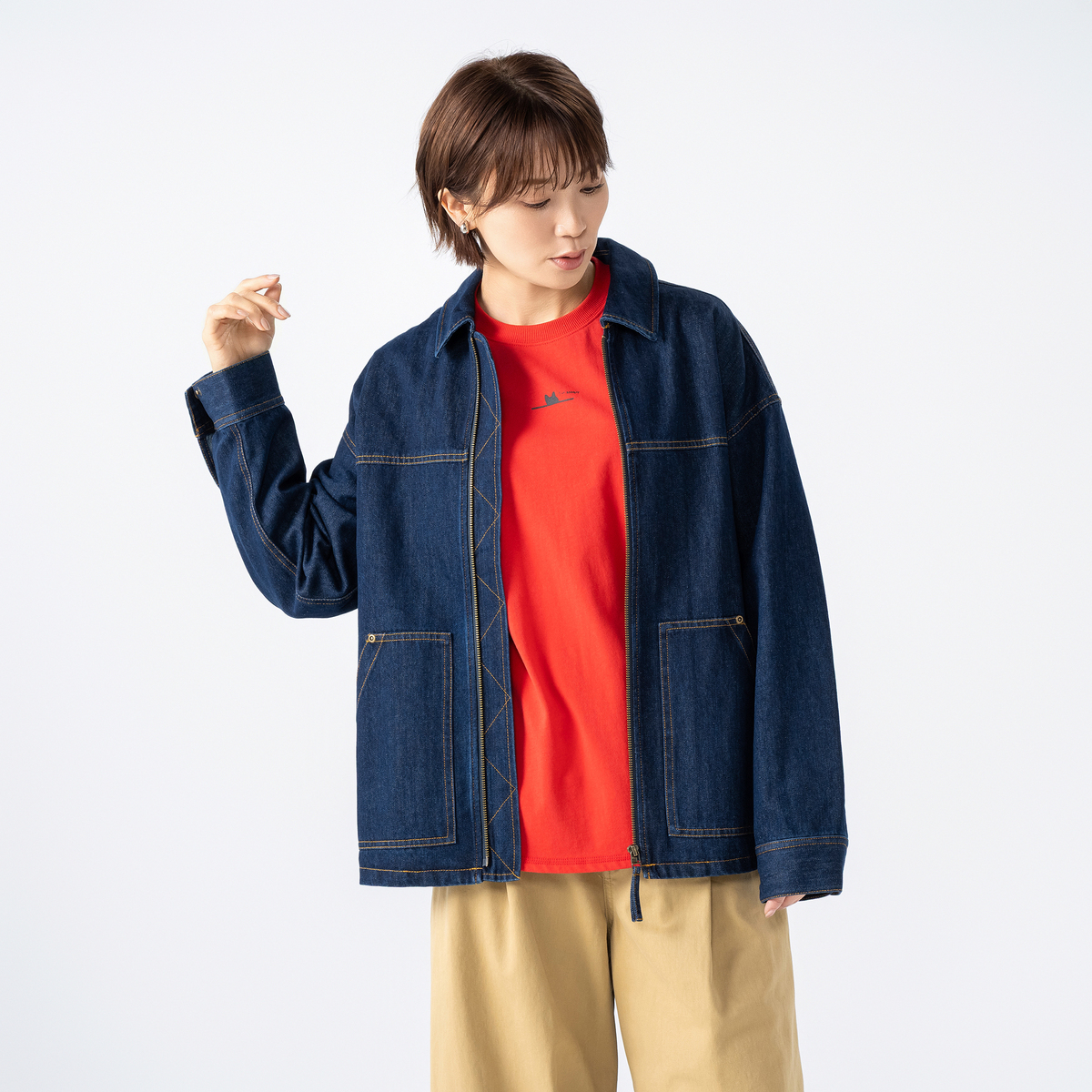 デニムの表情やディテールにこだわったカバーオールブルゾン。フロントは大き目のパッチポケットとデニムらしいステッチやメタルの附属使いがポイント。左前仕様の前開きと、ジグザグステッチを効かせた持出しがアクセントになっています