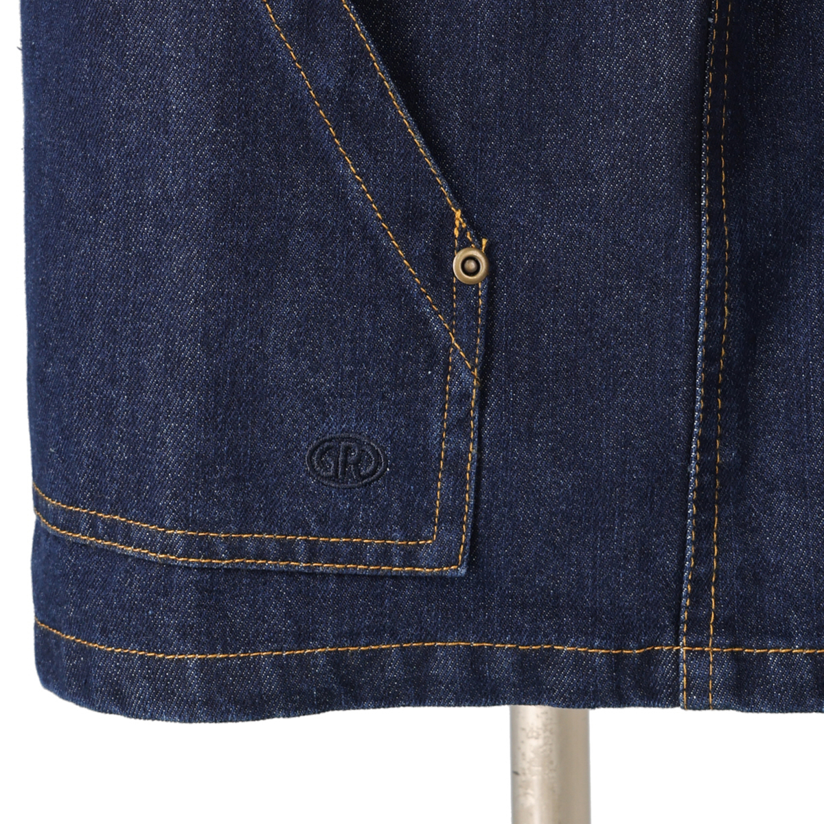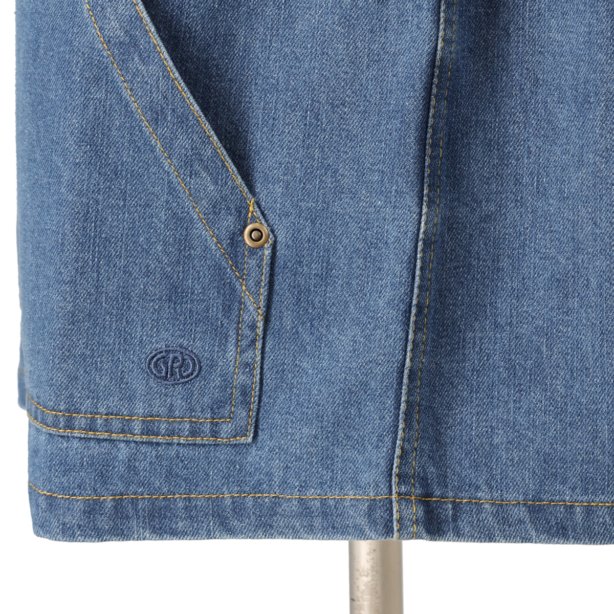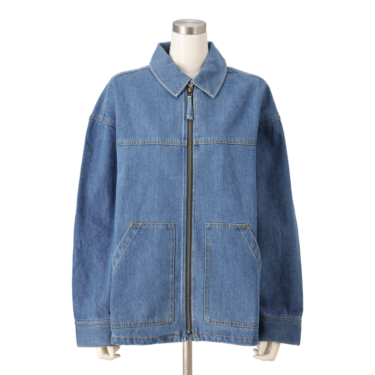 デニムの表情やディテールにこだわったカバーオールブルゾン。フロントは大き目のパッチポケットとデニムらしいステッチやメタルの附属使いがポイント。左前仕様の前開きと、ジグザグステッチを効かせた持出しがアクセントになっています