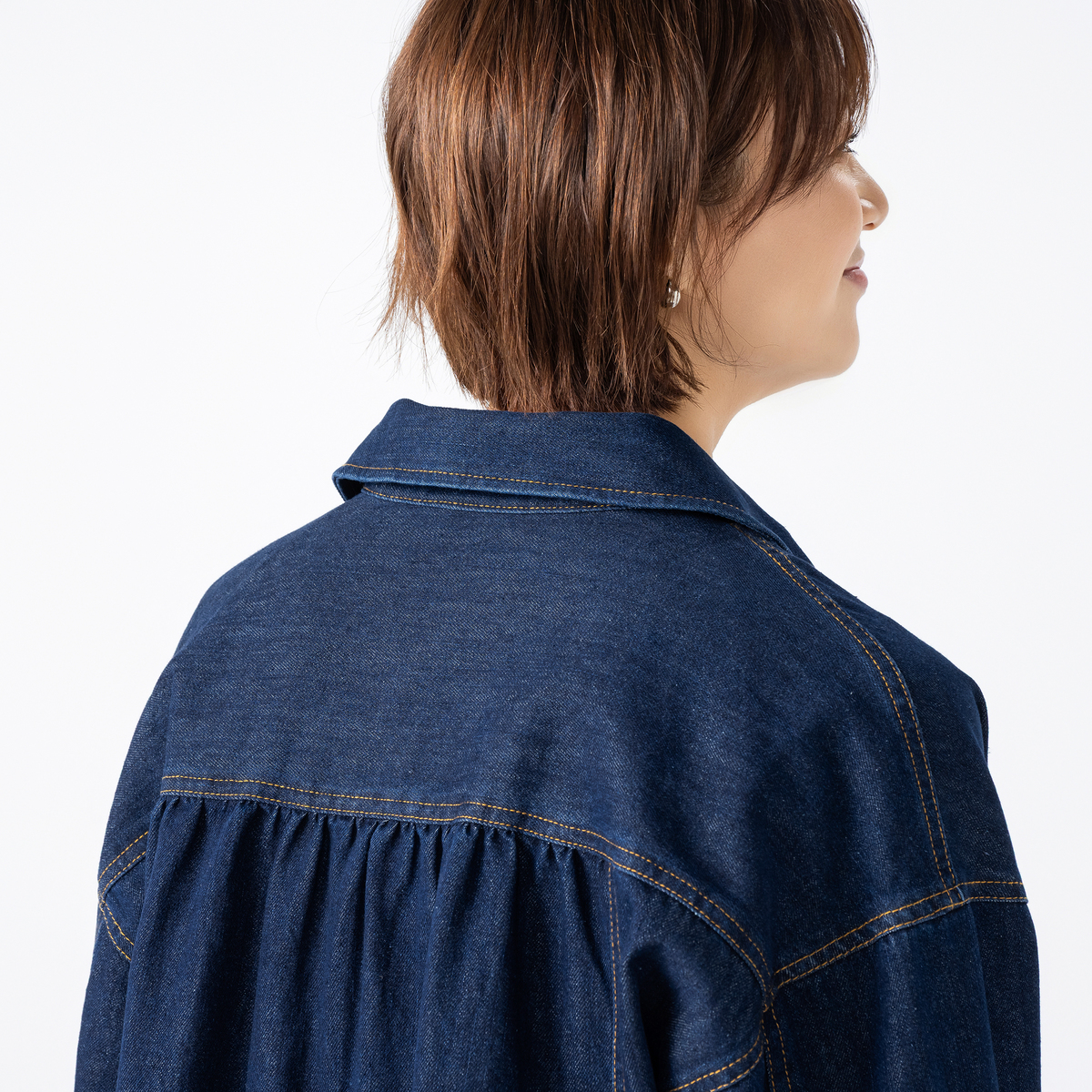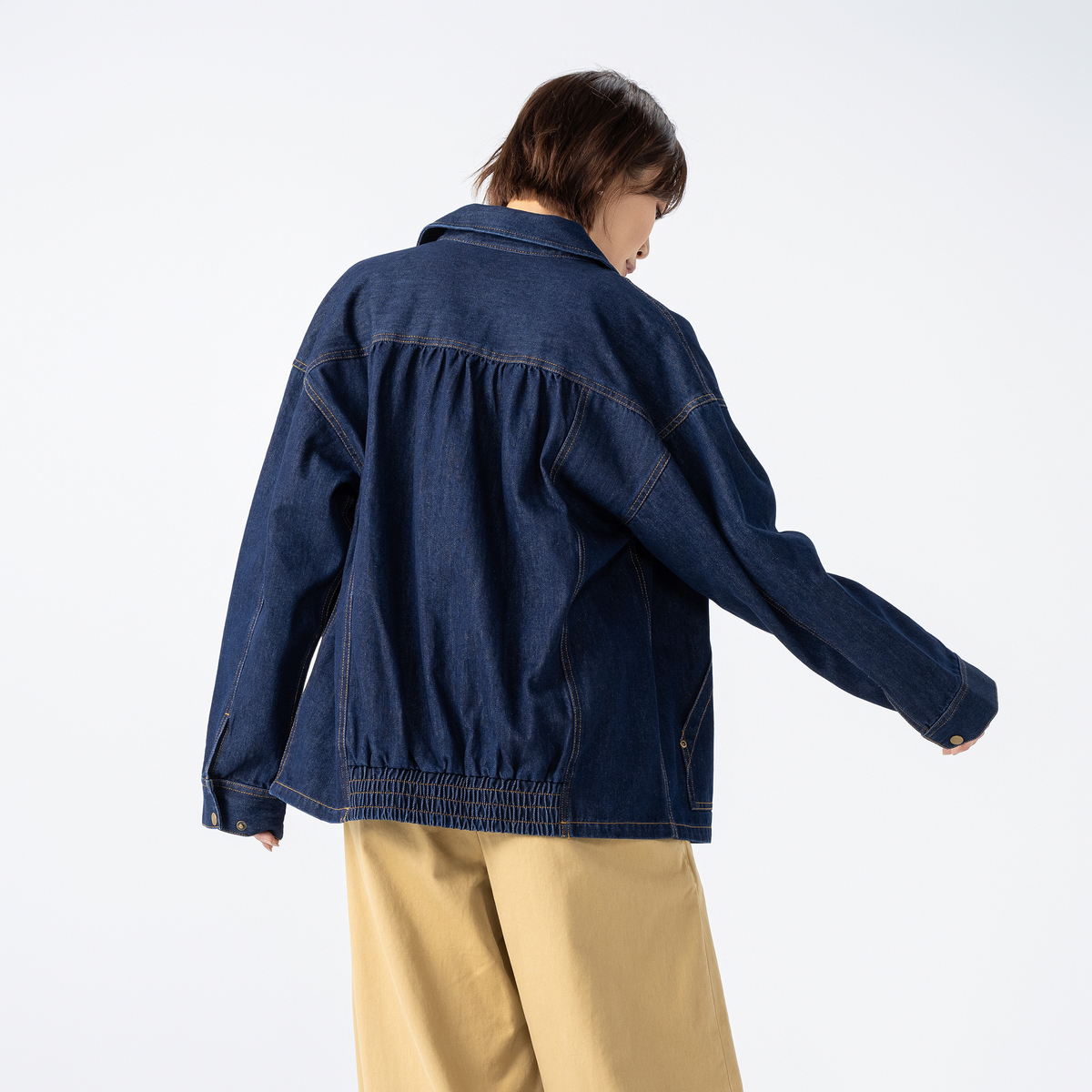 バックスタイルはヨーク下のギャザーが丸みのあるフォルムを生み出し、体のラインを優しく包み込みつつ、動きやすさも確保。きちんと着るとハンサム見え、ちょっと肩を抜いて軽く羽織れば、抜け感のあるスタイルに仕上がります