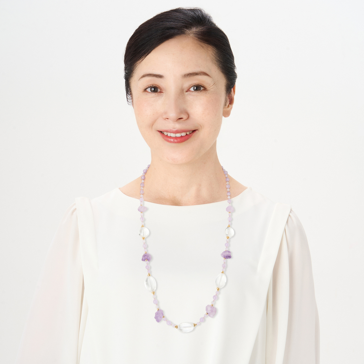 ラベンダーカラークォーツと水晶の組合わせが、爽やかで美しい印象を与えるロングネックレス。結晶のままのようなラベンダーカラークォーツが、やさしい彩りを添えます