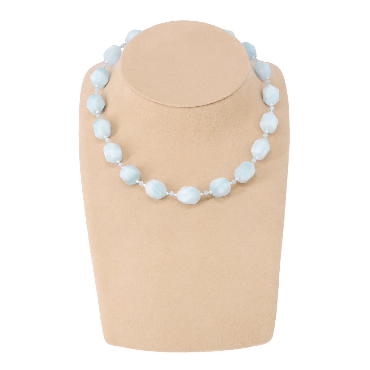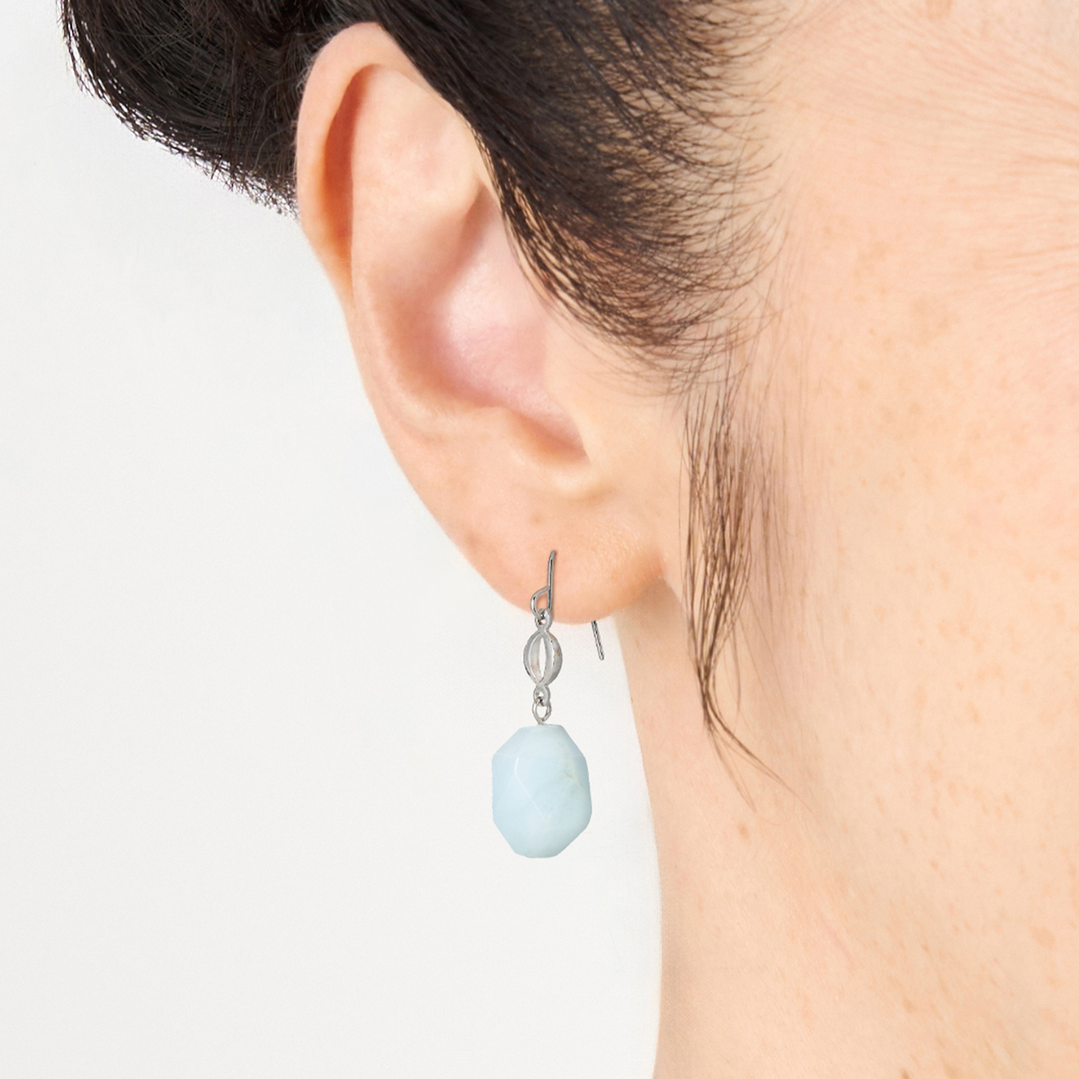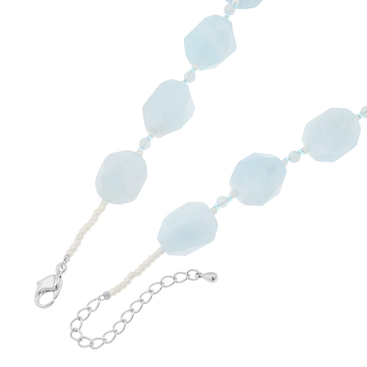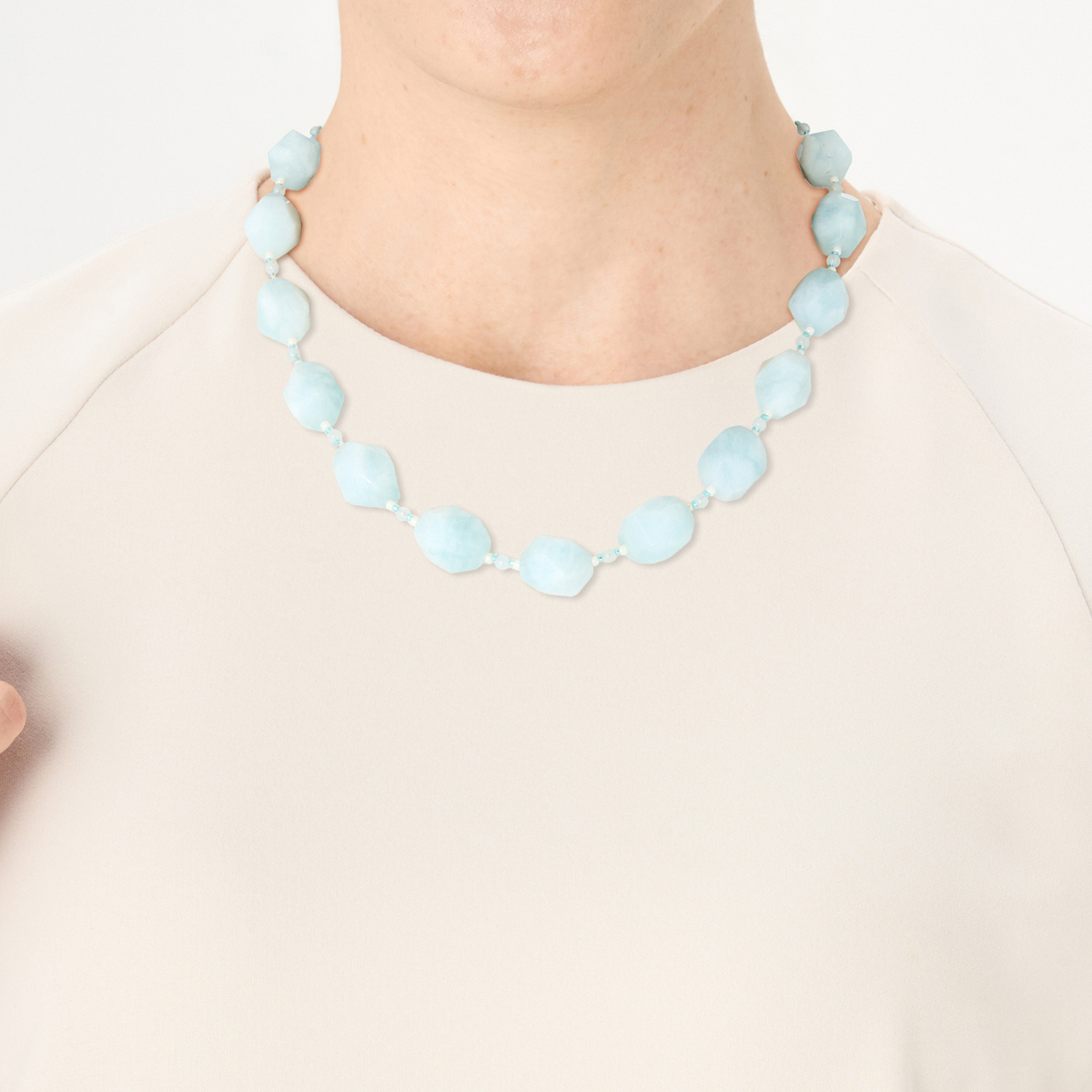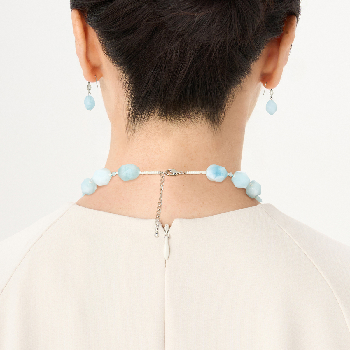 タンブルカットのアクアマリンが存在感を放つネックレスとイヤリングまたはピアスのセットです。ボリューム感が華奢見えに繋がり、首元やお顔まわりをすっきりと見せてくれます