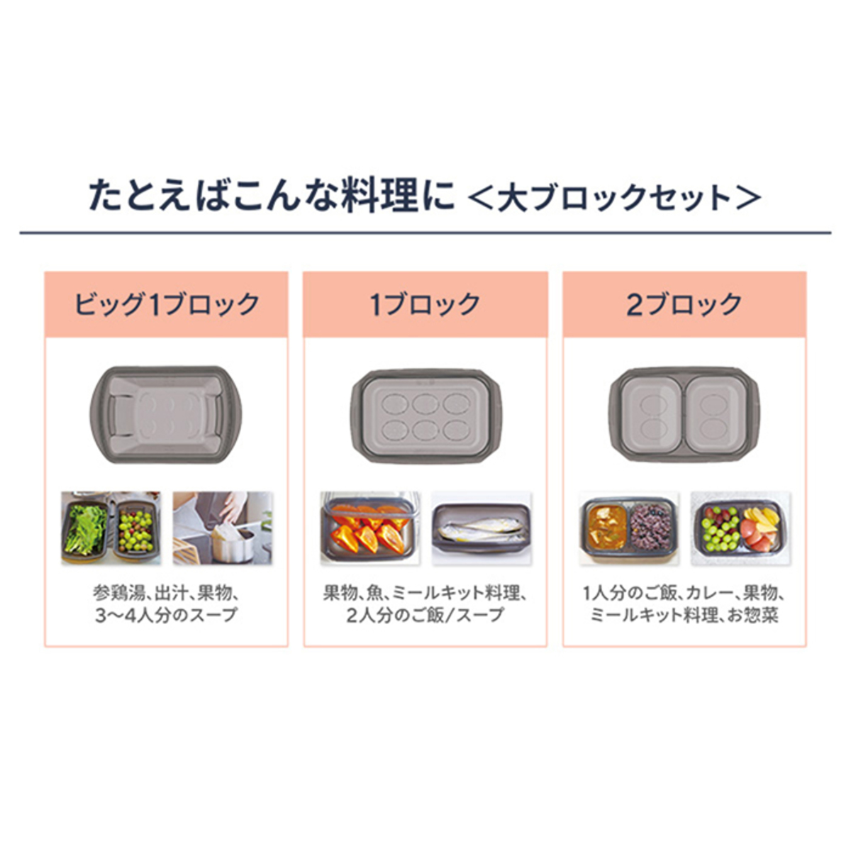 [セット内容] ・ビック1ブロック(1200ml) ・1ブロック(600ml) ・2ブロック(300ml×2) <ビック1ブロック> [サイズ] 縦23.6×横15.3×高さ8.7cm [重量]174g [容量]1200ml <1ブロック> [サイズ] 縦23.8×横15×高さ5cm [重量]130g [容量]600ml <2ブロック> [サイズ] 縦23.8×横15×高さ4.5cm [重量]120g [容量]600ml [材質] ポリエチレン [注意事項] ※使用可:食器洗い機 ※使用不可:電子レンジ、オーブンレンジ ※冷凍時に内容物が膨張するため、容器が変形したり密閉性が保てない場合があります。液体や材料は適量を入れてご使用ください ※耐熱温度を超えると製品が変形するため、オーブンや電子レンジでは使用しないでください ※過度な消毒は製品が変形する恐れがあるため、お手入れの際は中性洗剤とぬるま湯で洗浄して消毒してください ※火気や強い衝撃を避けて取り扱い、火のそばには保管しないでください ※製品底部の色が薄く見えるのは、冷凍した材料を取り出しやすくする「アルアリ技術」によるもので、不良品ではありません 【韓国製】