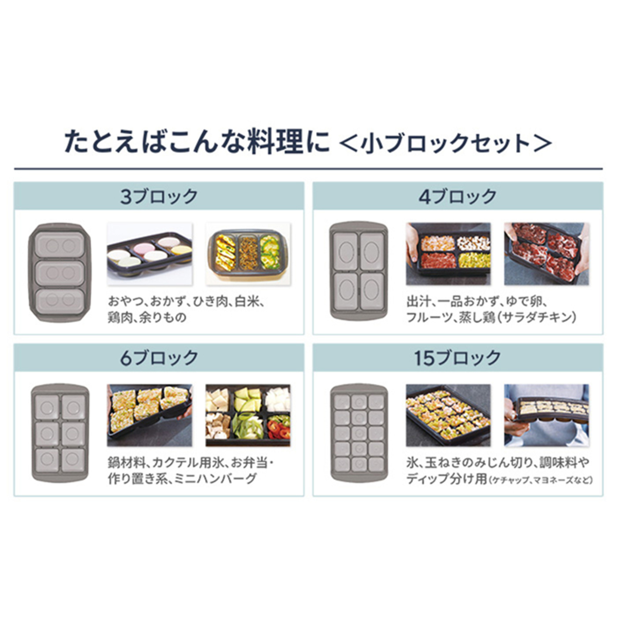 [セット内容] ・3ブロック(100ml×3) ・4ブロック(100ml×4) ・6ブロック(45ml×6) ・15ブロック(15ml×15) <3ブロック> [サイズ]縦23.8×横15×高さ3.5cm [重量]122g [容量]300ml <4ブロック> [サイズ]縦23×横14.5×高さ4.5cm [重量]118g [容量]400ml <6ブロック> [サイズ]縦23×横14.5×高さ4.5cm [重量]120g [容量]270ml <15ブロック> [サイズ]縦23×横14.5×高さ2.8cm [重量]110g [容量]225ml [材質] ポリエチレン [注意事項] ※使用可:食器洗い機 ※使用不可:電子レンジ、オーブンレンジ ※冷凍時に内容物が膨張するため、容器が変形したり密閉性が保てない場合があります。液体や材料は適量を入れてご使用ください ※耐熱温度を超えると製品が変形するため、オーブンや電子レンジでは使用しないでください ※過度な消毒は製品が変形する恐れがあるため、お手入れの際は中性洗剤とぬるま湯で洗浄して消毒してください ※火気や強い衝撃を避けて取り扱い、火のそばには保管しないでください ※製品底部の色が薄く見えるのは、冷凍した材料を取り出しやすくする「アルアリ技術」によるもので、不良品ではありません 【韓国製】