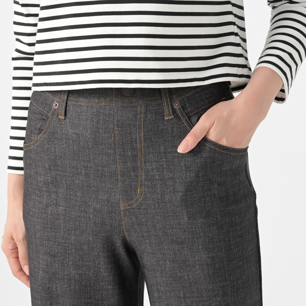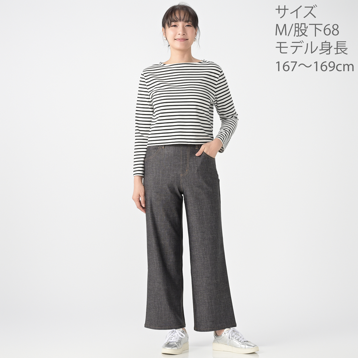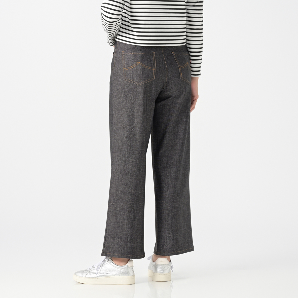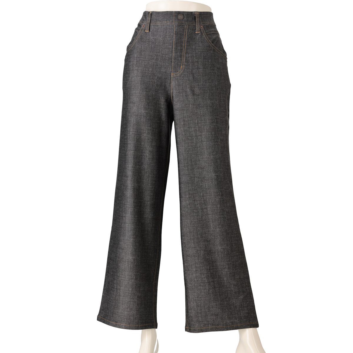 ストレッチ性のあるタテ編みタイプのハイテンションニットを使い、見た目はデニムながら快適な穿き心地を叶えるセミワイドパンツ。ウエストは総ゴム仕様で窮屈感を軽減し着脱しやすく、キックバック性のある安定したストレッチで、膝が出にくく形態が崩れにくいのも魅力です