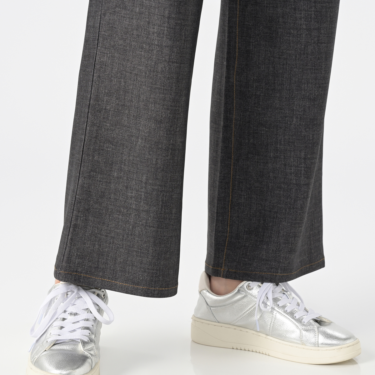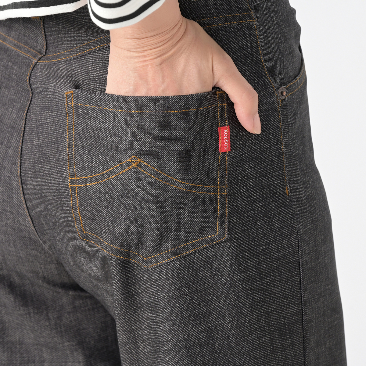 深めの股上とハイウエストデザインがお腹周りをカバーし、立体的なパターン設計で、ヤマハギ(ヨーク)下にダーツを入れて丸みのあるヒップラインを演出。ワイドラインのシルエットで生地の落ち感を生かした綺麗なシルエットです