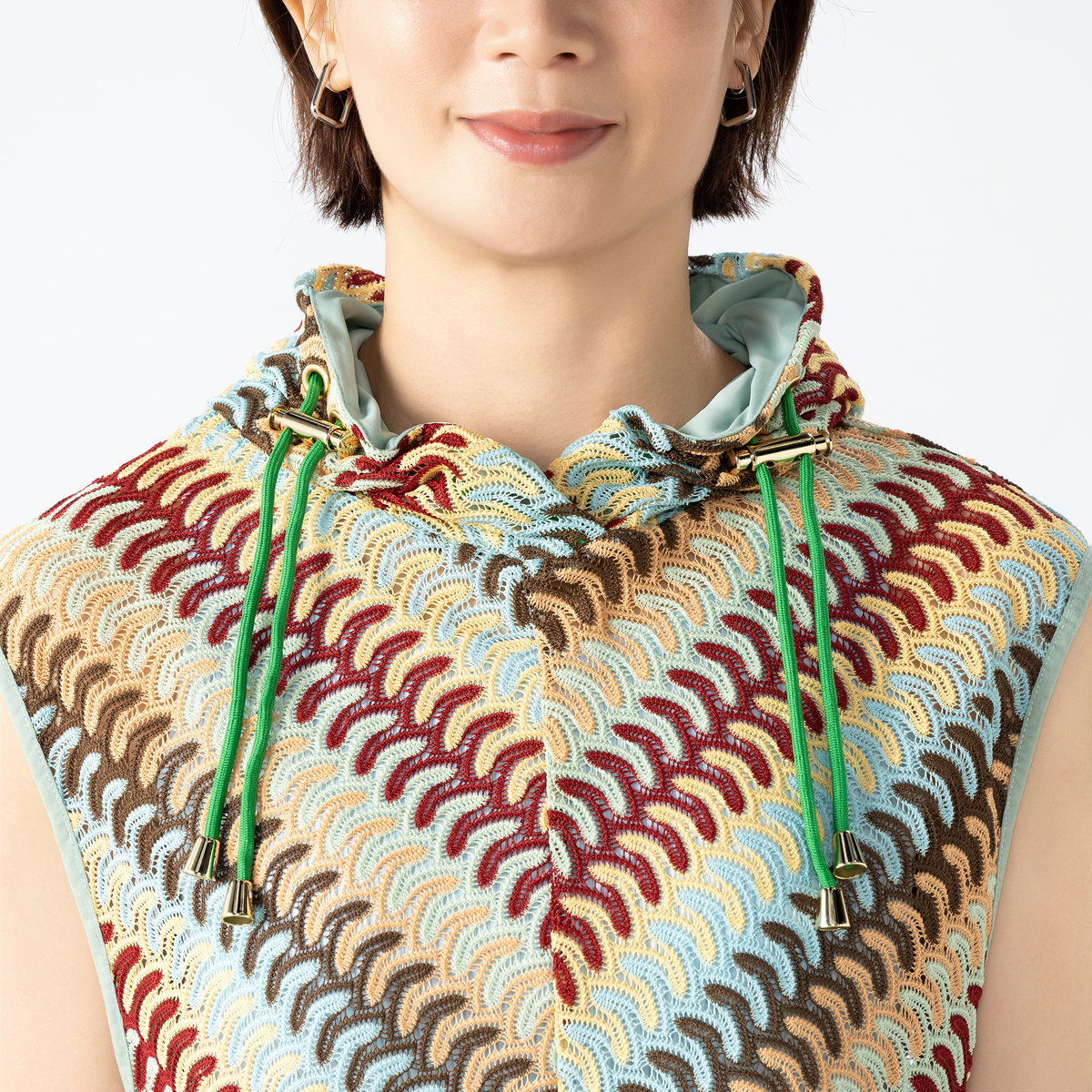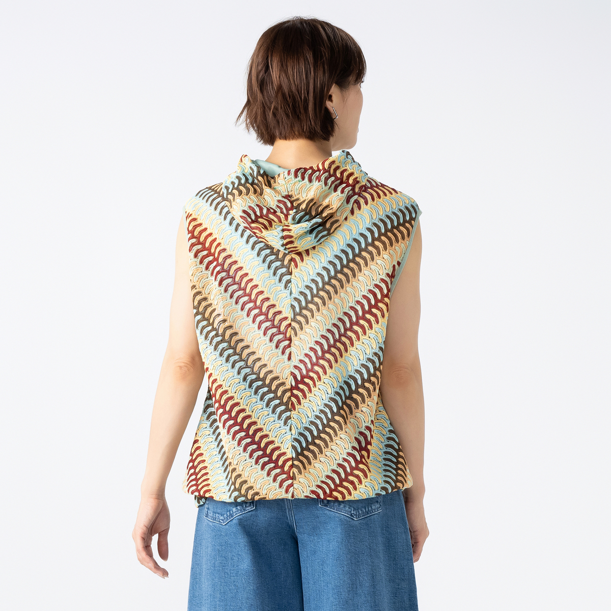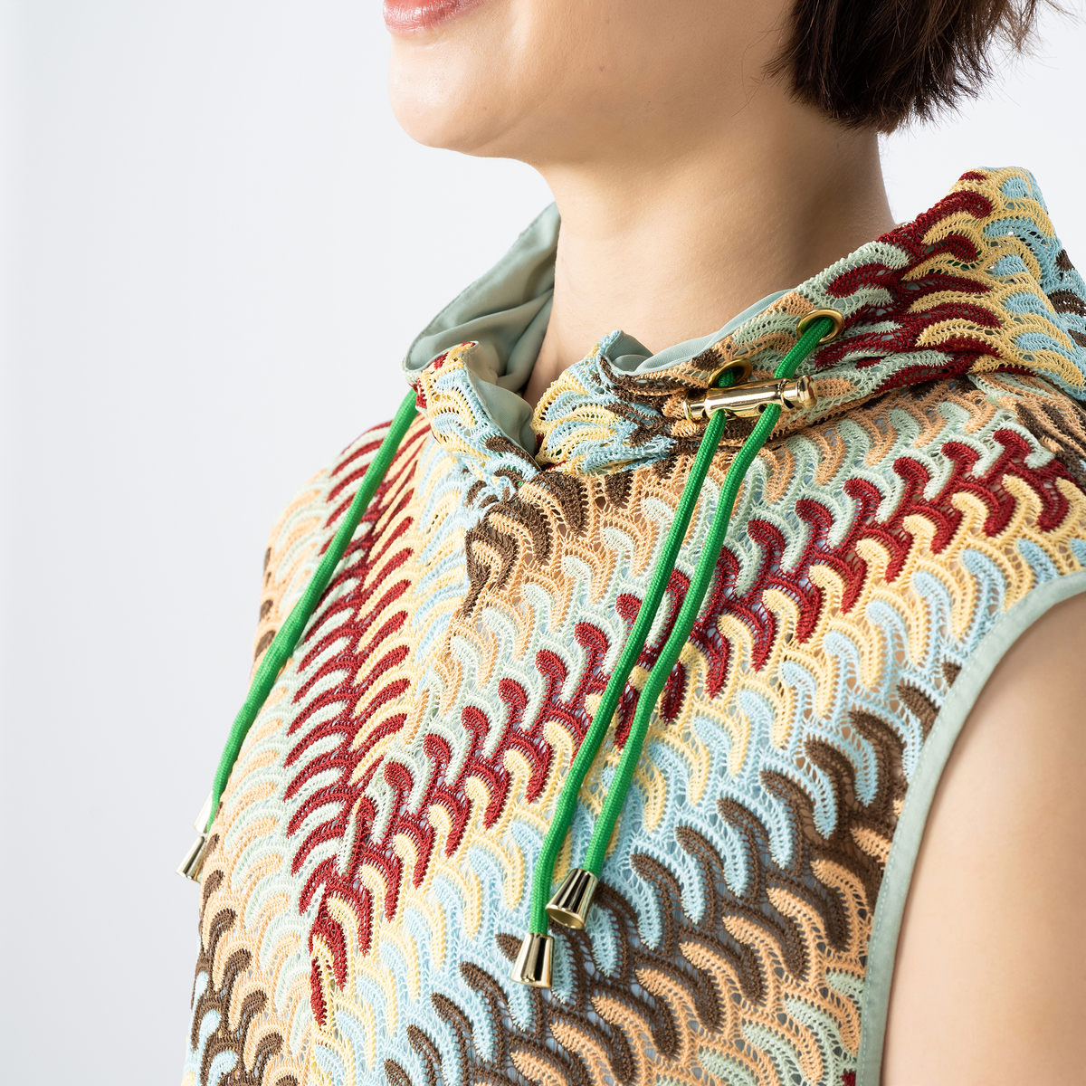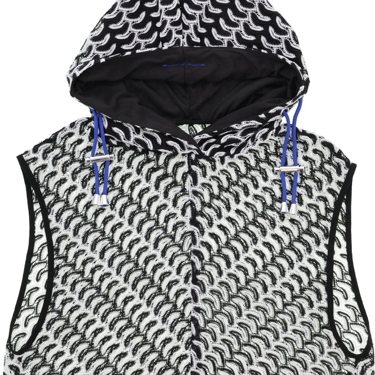 波打つようなジグザグのマルチカラーカットソーレースを贅沢に使用したフーディーベスト。かぎ編みレースのようなナチュラルな雰囲気漂うアイテムです
