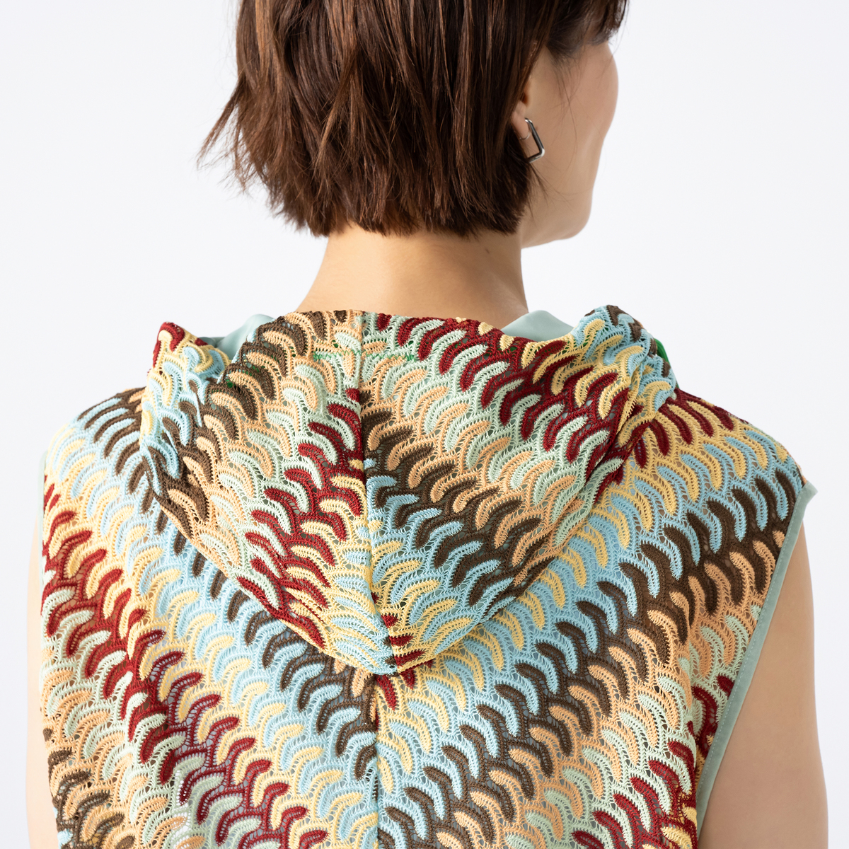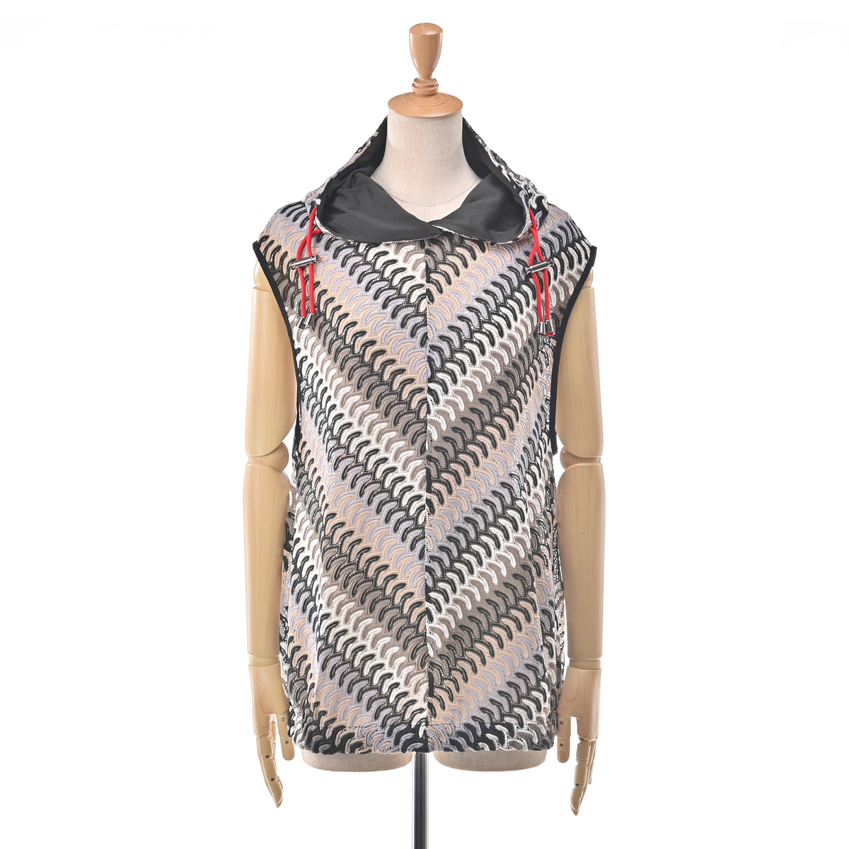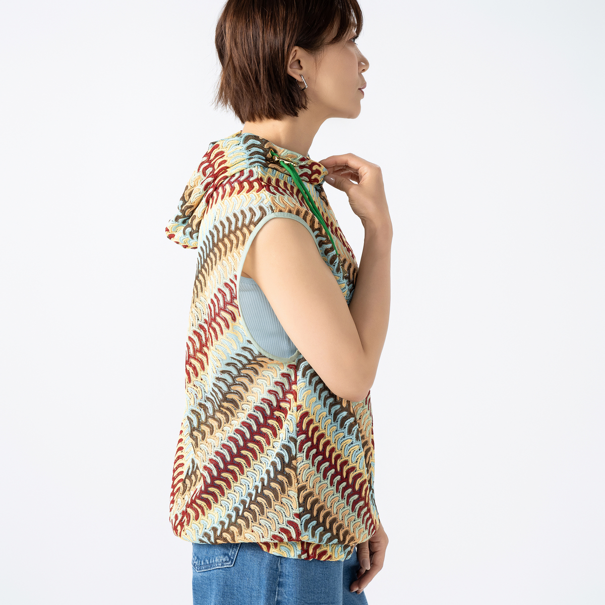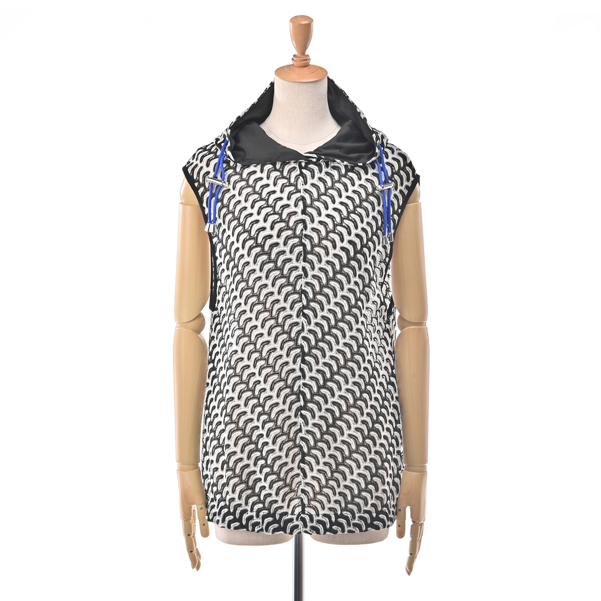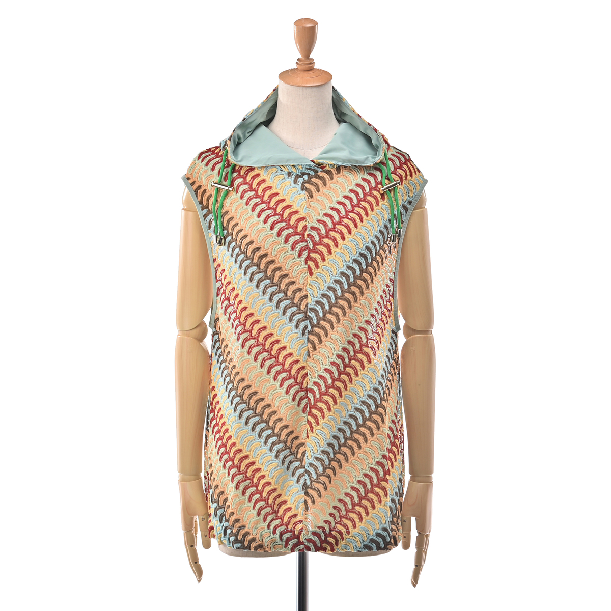 波打つようなジグザグのマルチカラーカットソーレースを贅沢に使用したフーディーベスト。かぎ編みレースのようなナチュラルな雰囲気漂うアイテムです
