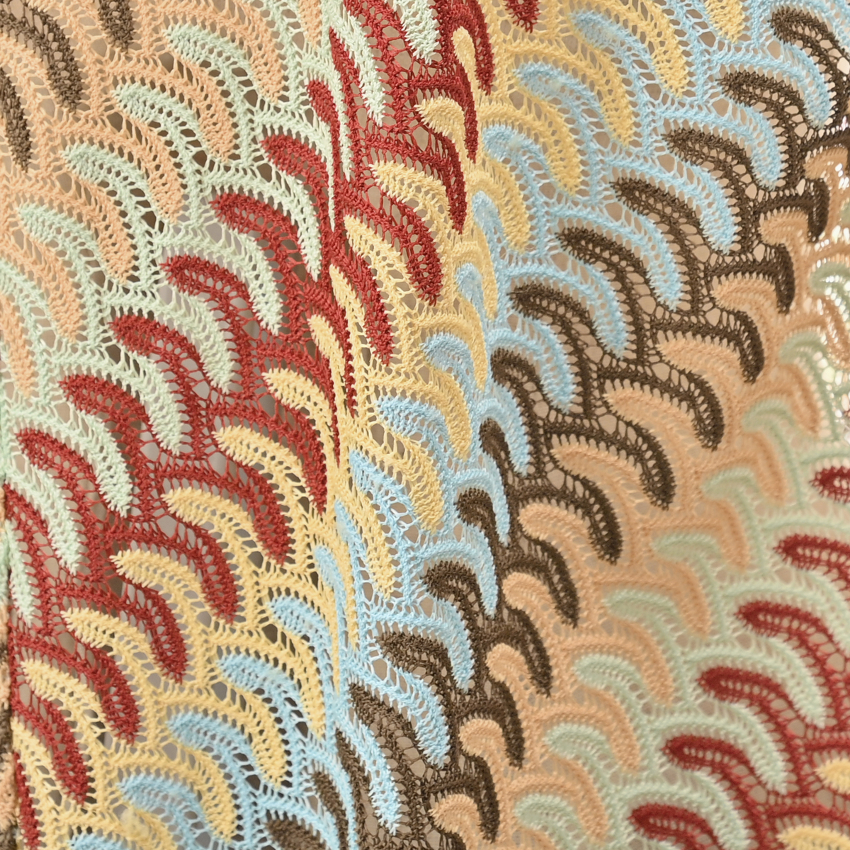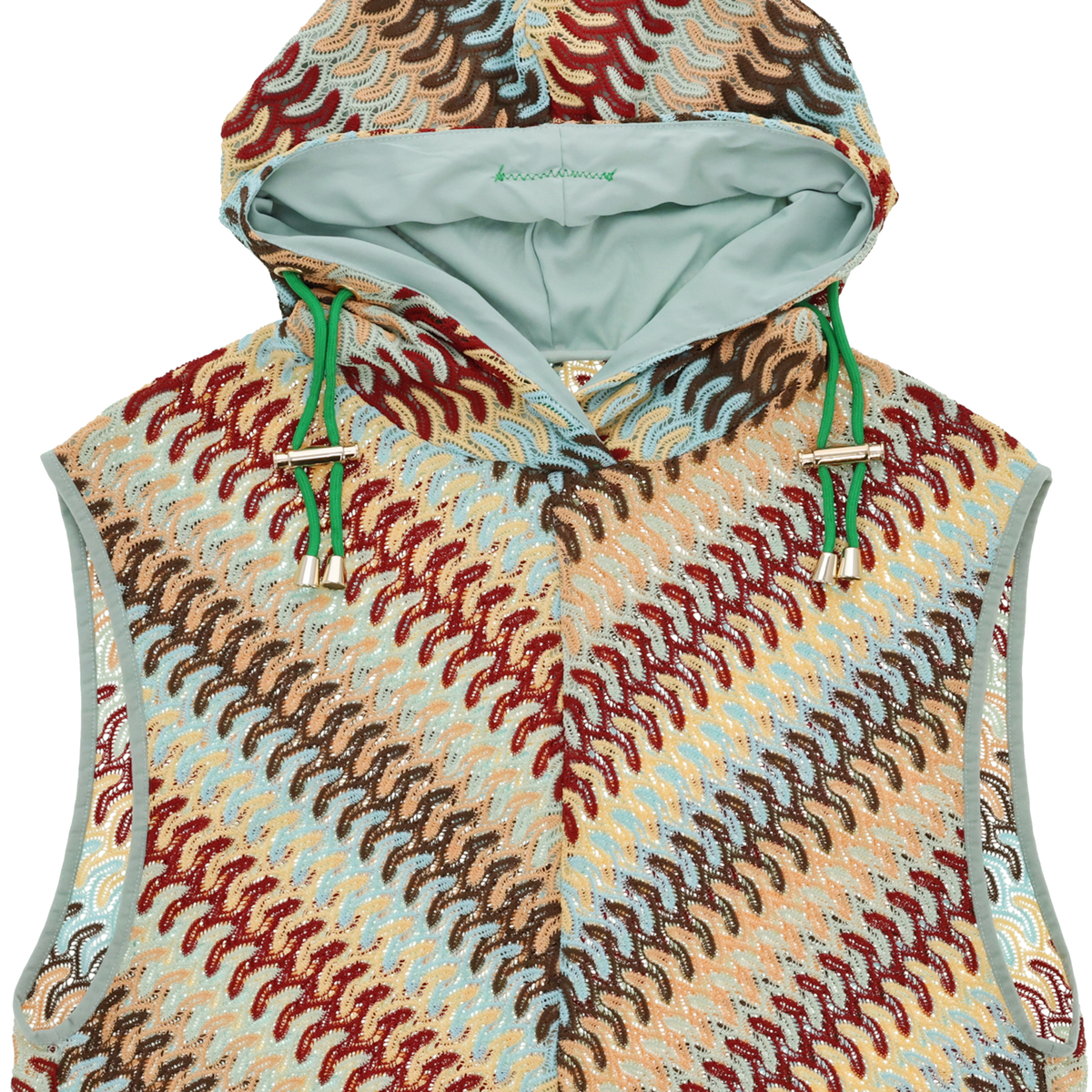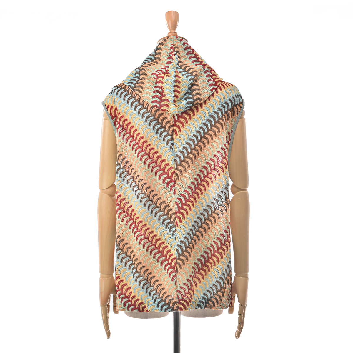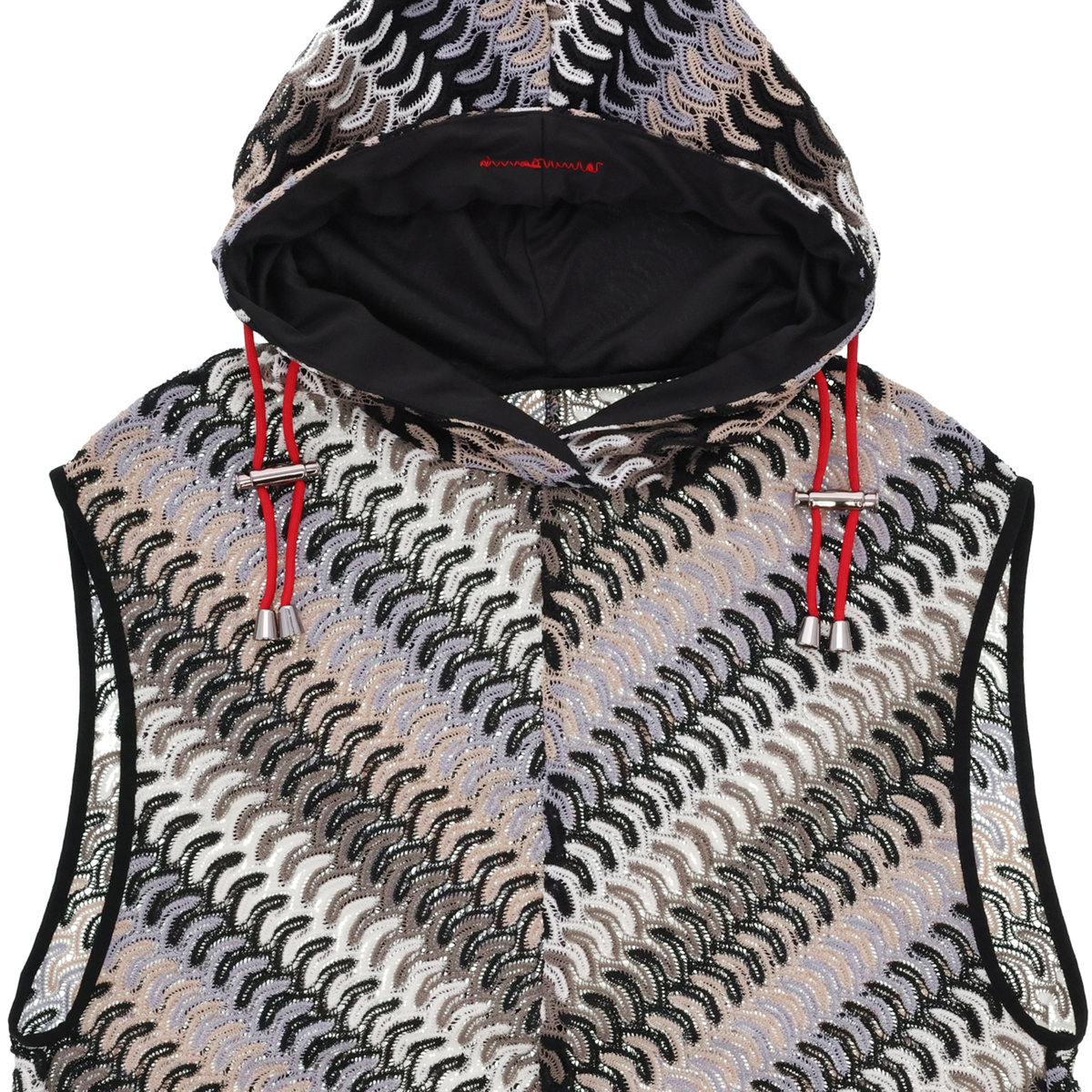 波打つようなジグザグのマルチカラーカットソーレースを贅沢に使用したフーディーベスト。かぎ編みレースのようなナチュラルな雰囲気漂うアイテムです