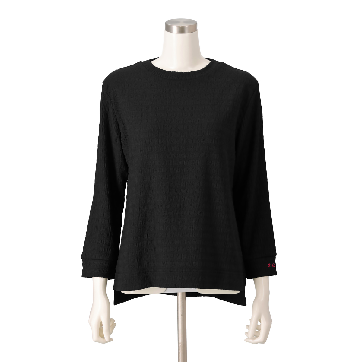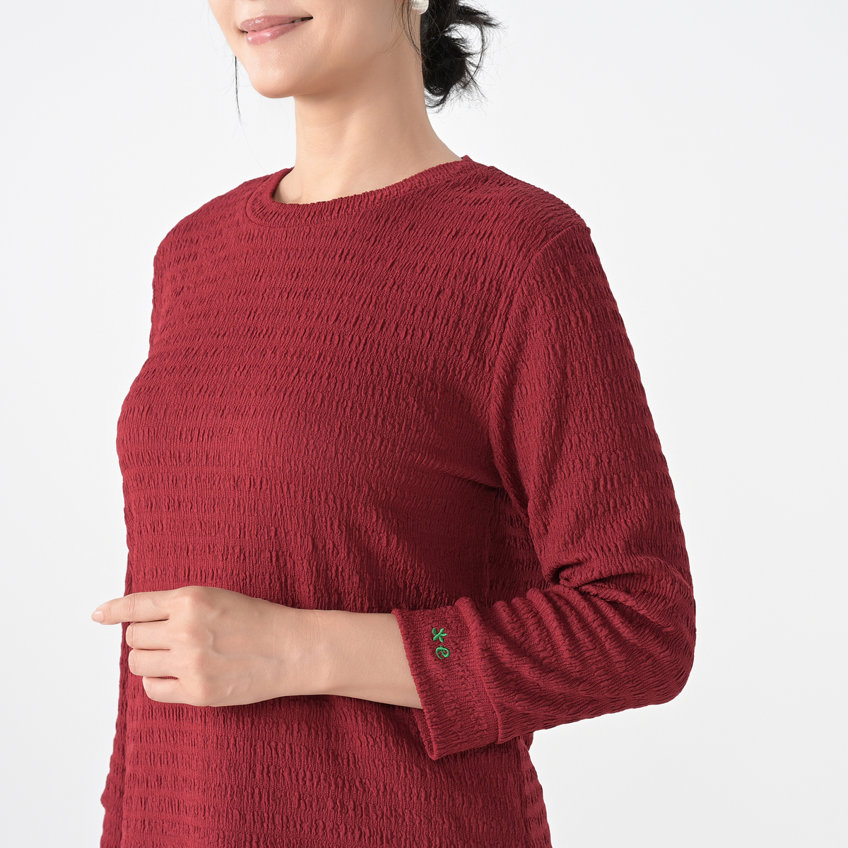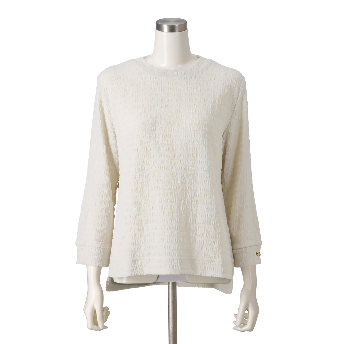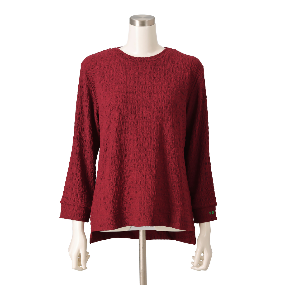 楊柳柄のスモッキングのような、シャーリングジャガードのカットソー生地のプルオーバー。干裾広がりのボックス型シルエットで、気になる腰回りをカバー。レイヤードもしやすいシンプルなシルエットです