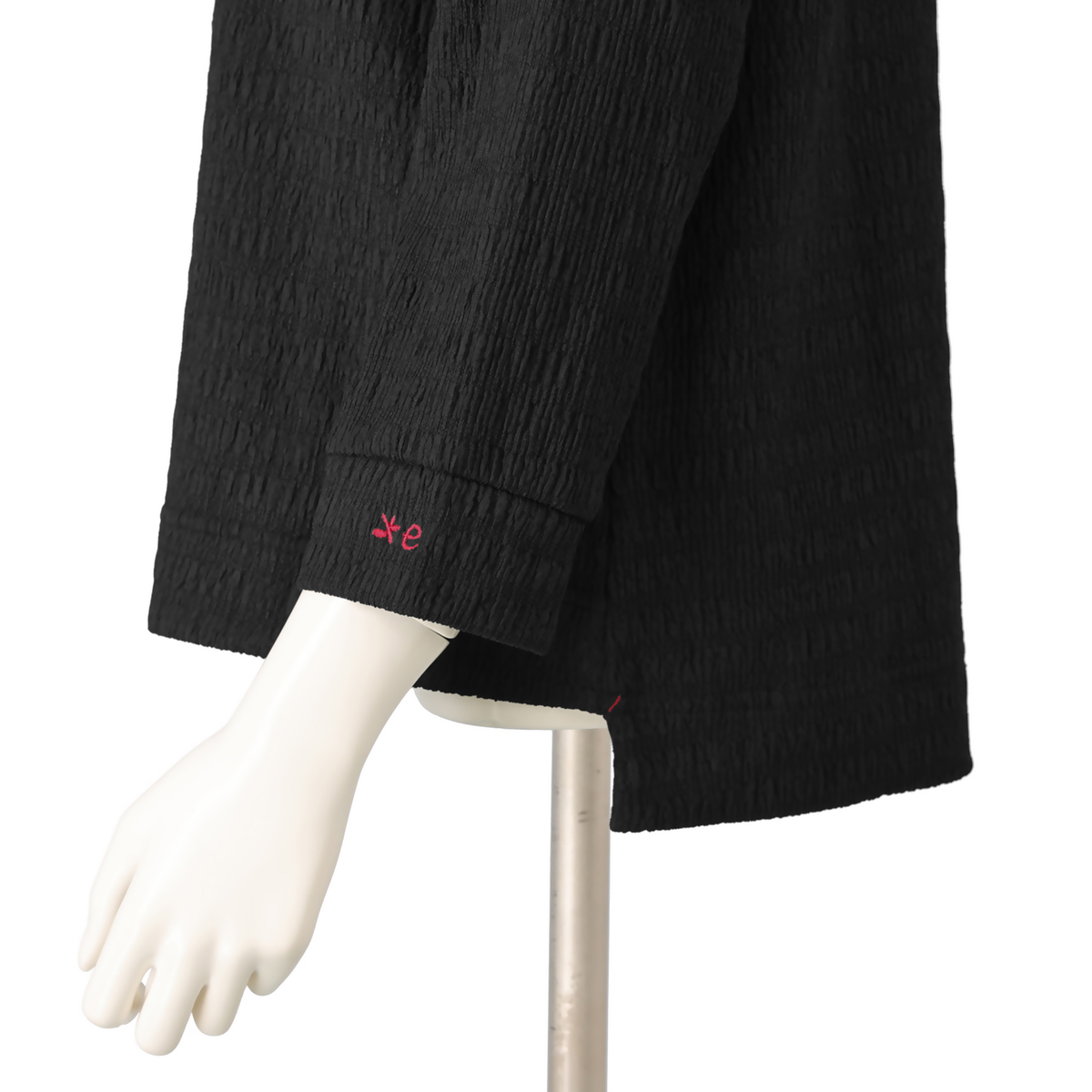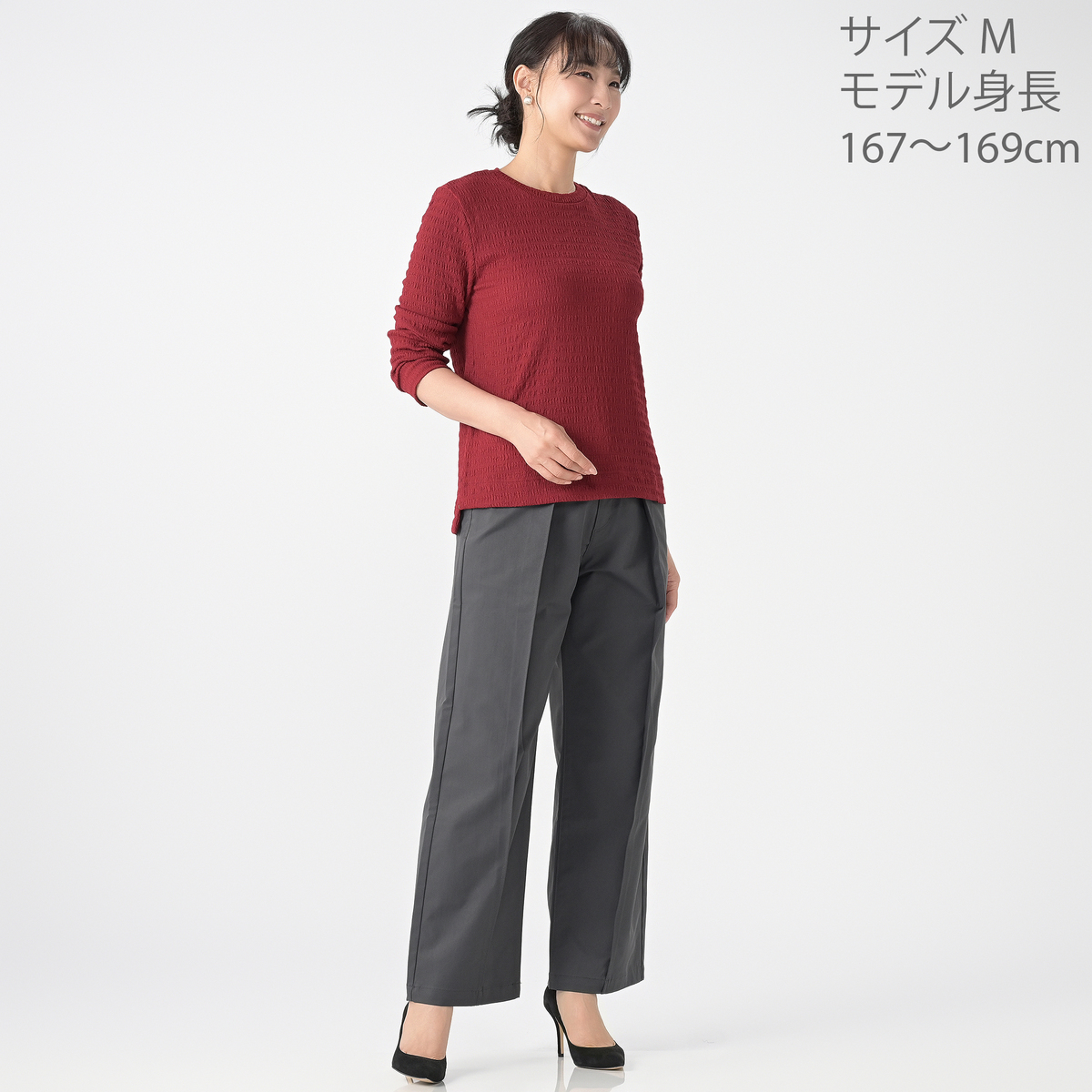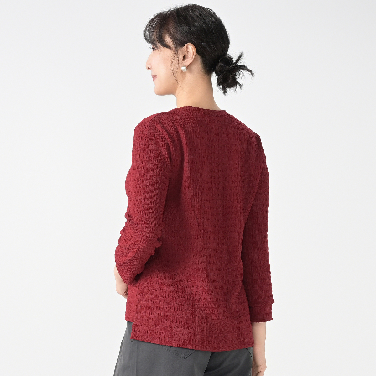 楊柳柄のスモッキングのような、シャーリングジャガードのカットソー生地のプルオーバー。干裾広がりのボックス型シルエットで、気になる腰回りをカバー。レイヤードもしやすいシンプルなシルエットです