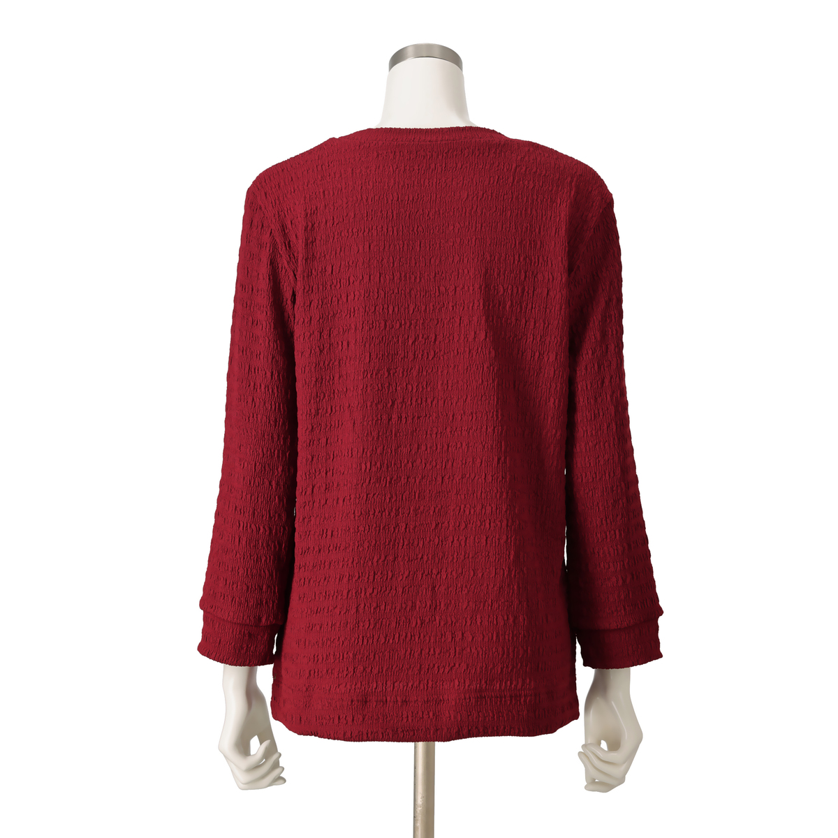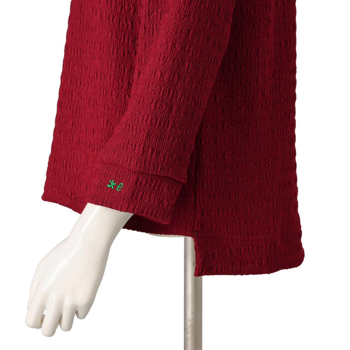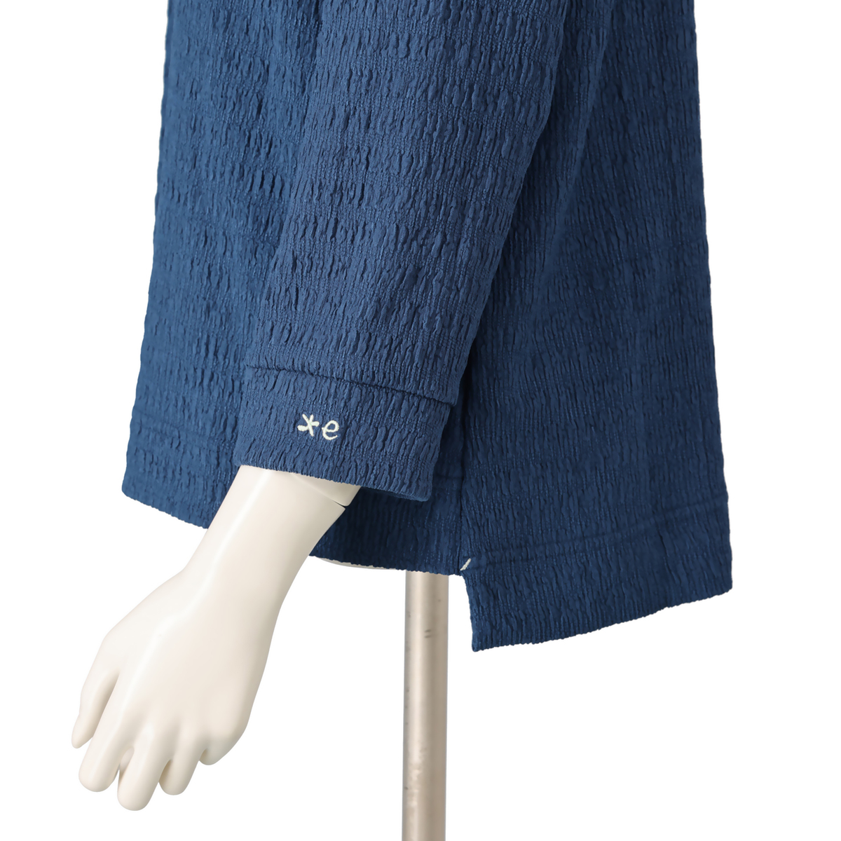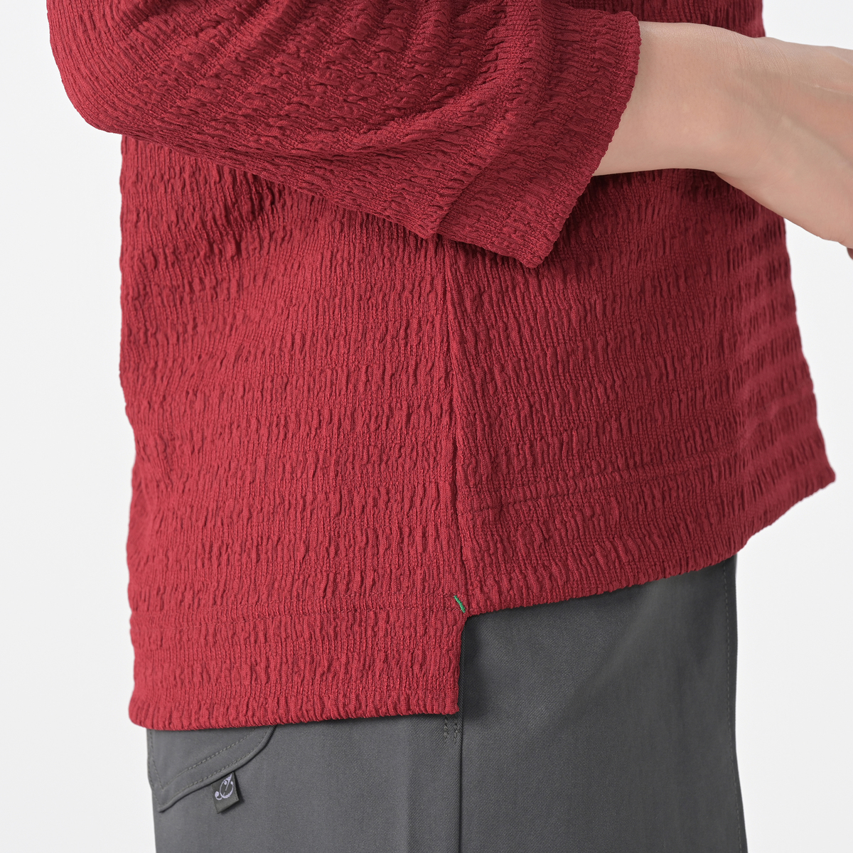楊柳柄のスモッキングのような、シャーリングジャガードのカットソー生地のプルオーバー。干裾広がりのボックス型シルエットで、気になる腰回りをカバー。レイヤードもしやすいシンプルなシルエットです