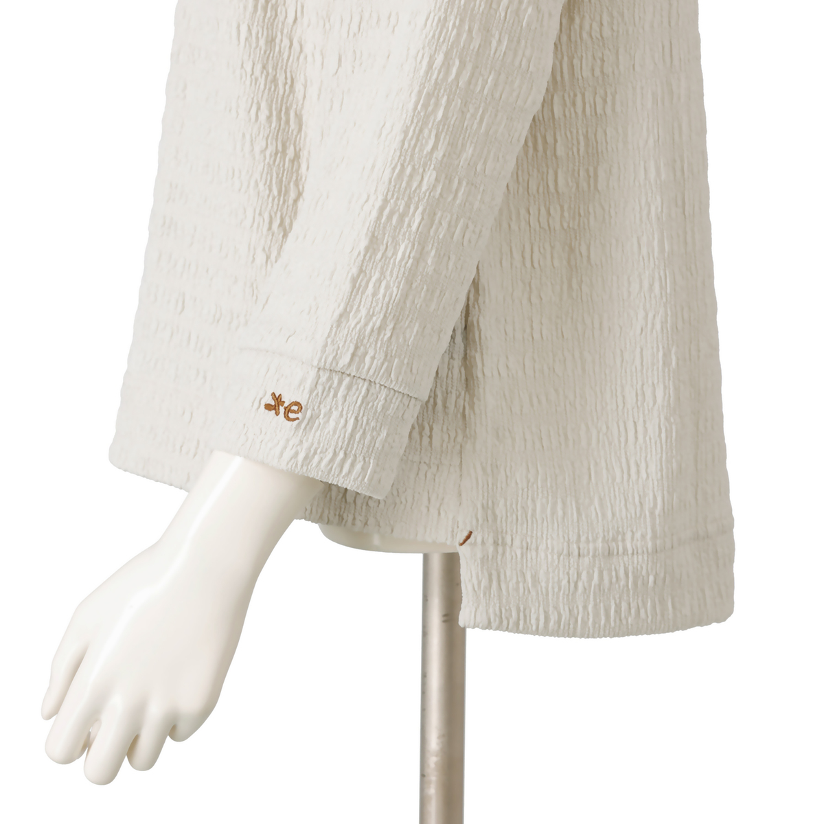 ボトムスとのバランスがとりやすい後裾が少し長い前後差シルエット。左袖口はオリジナル刺繍がポイントに。通常取る縫い代巾より広く取った縫い代が、裾カフスのように見えるデザインです